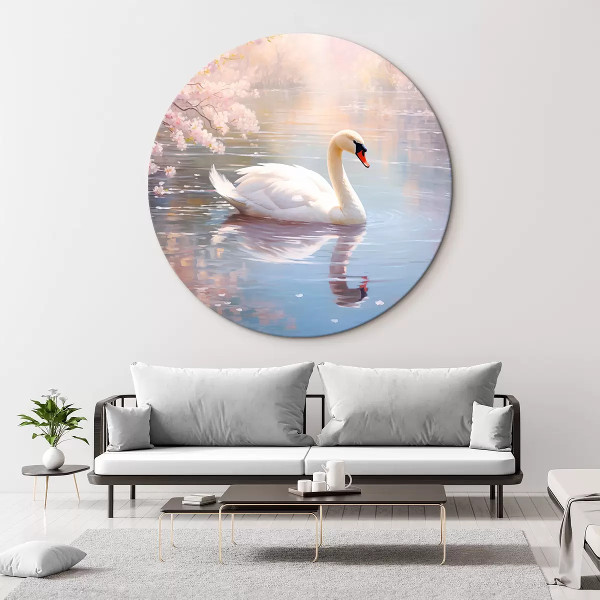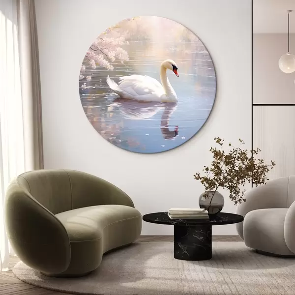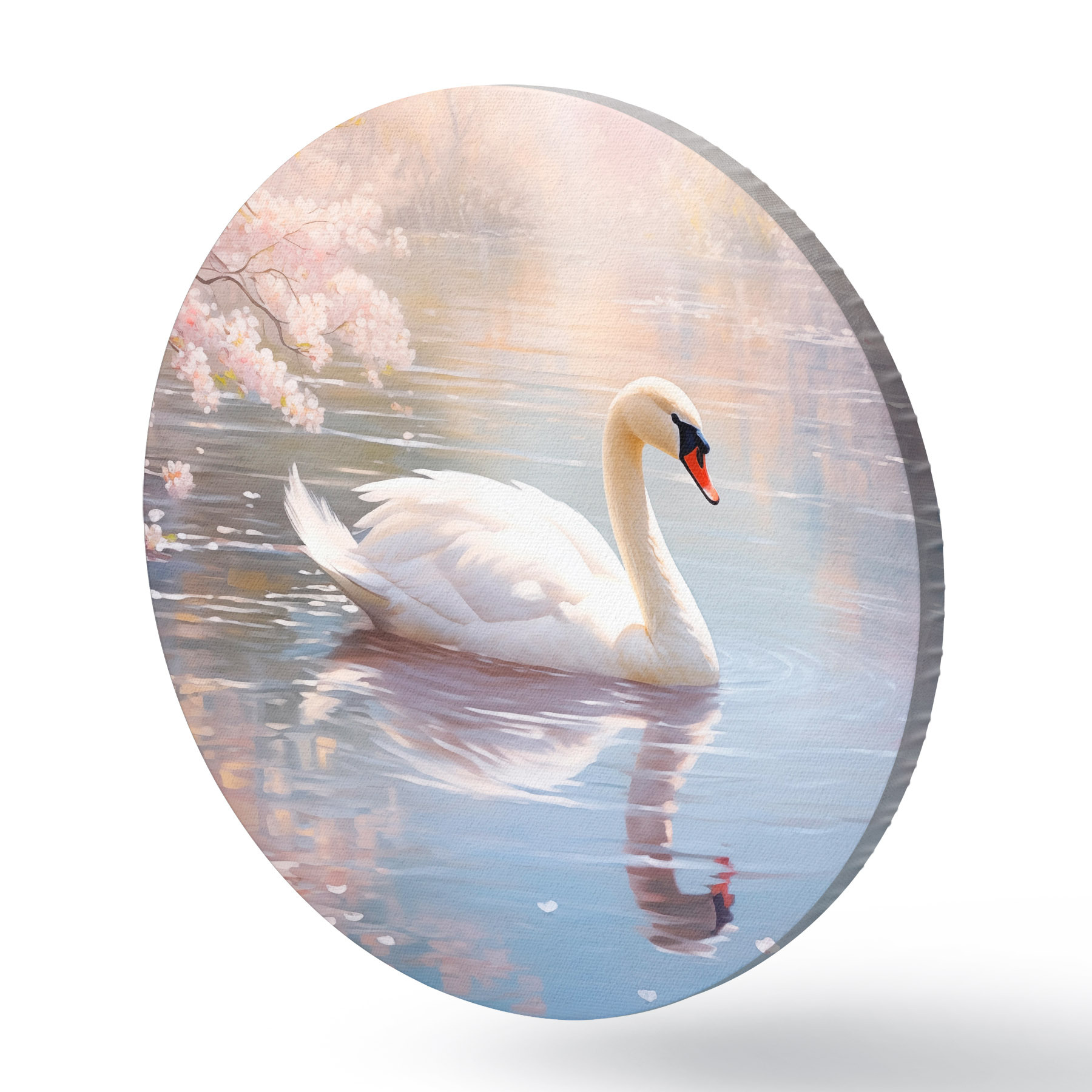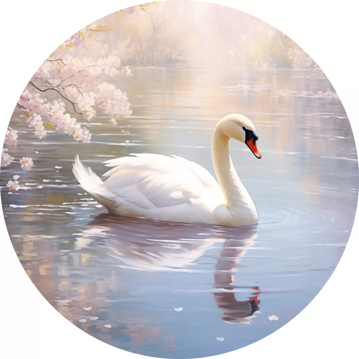 Runde Gemälde Ein weißer Schwan schwimmt in einem See mit Kirschblütenbäumen, Pastellfarben r44396
