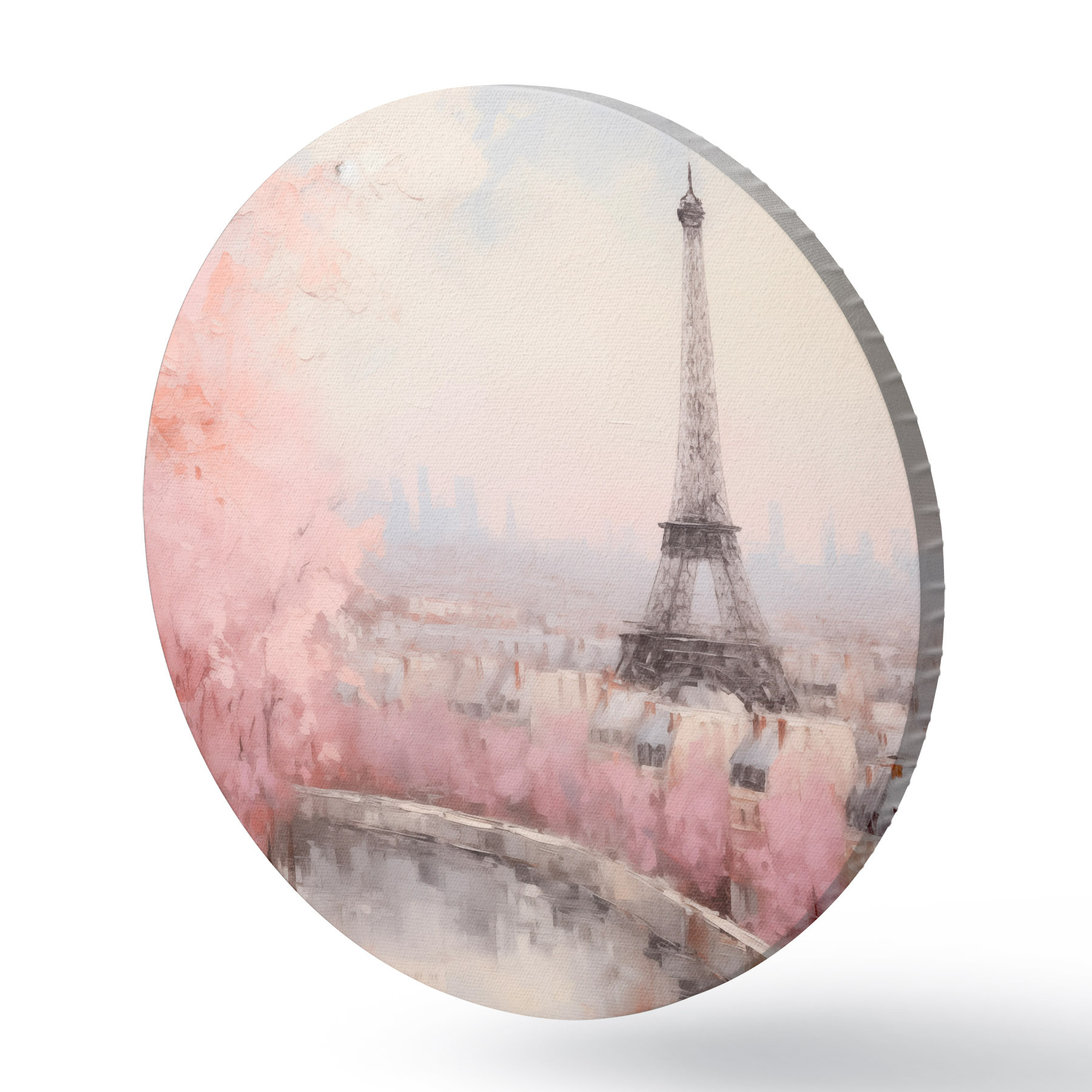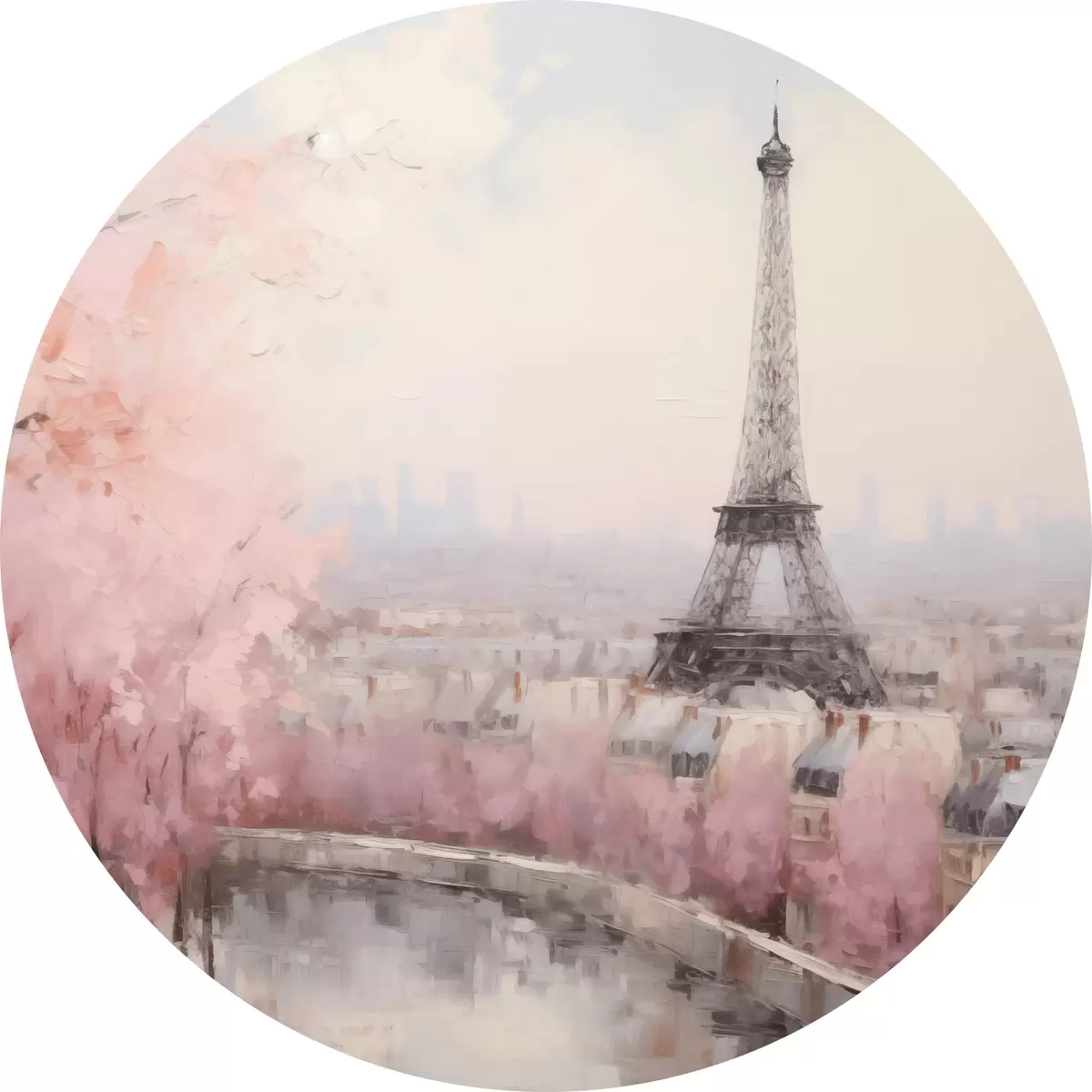 Runde Gemälde Eiffelturm in Paris mit Kirschblütenbäumen im Frühling, sanfte Pastellfarben r44398