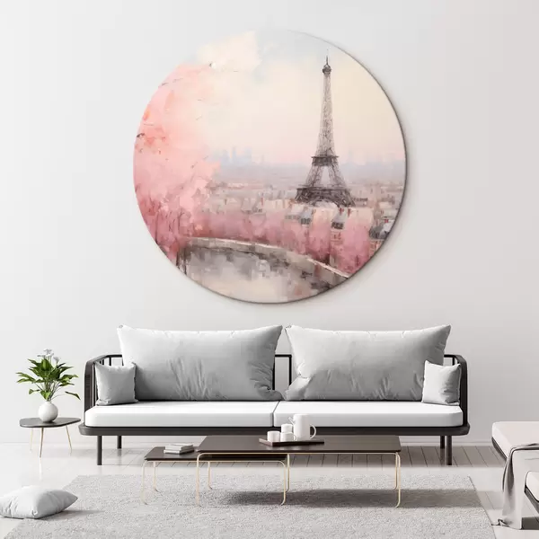 Runde Gemälde Eiffelturm in Paris mit Kirschblütenbäumen im Frühling, sanfte Pastellfarben r44398