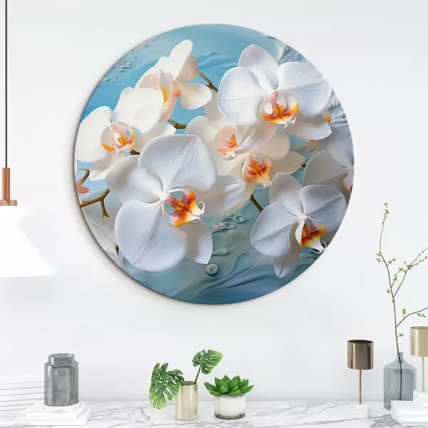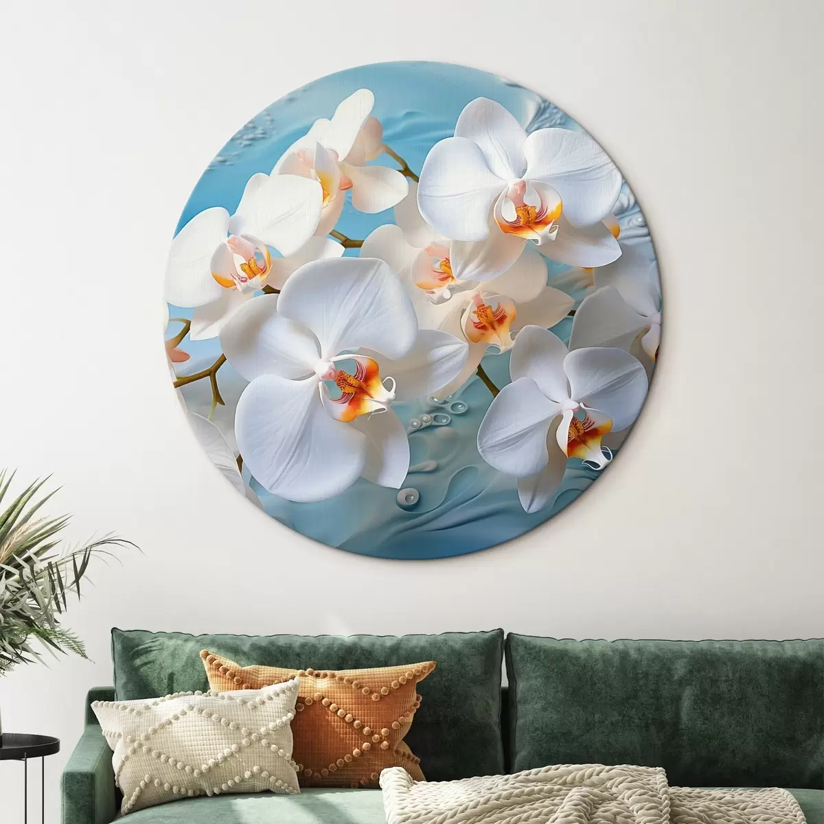 Runde Gemälde Weiße Orchideen, angeordnet auf einer hellblauen Fläche mit Wassertropfen, sanfte Beleuchtung r44401