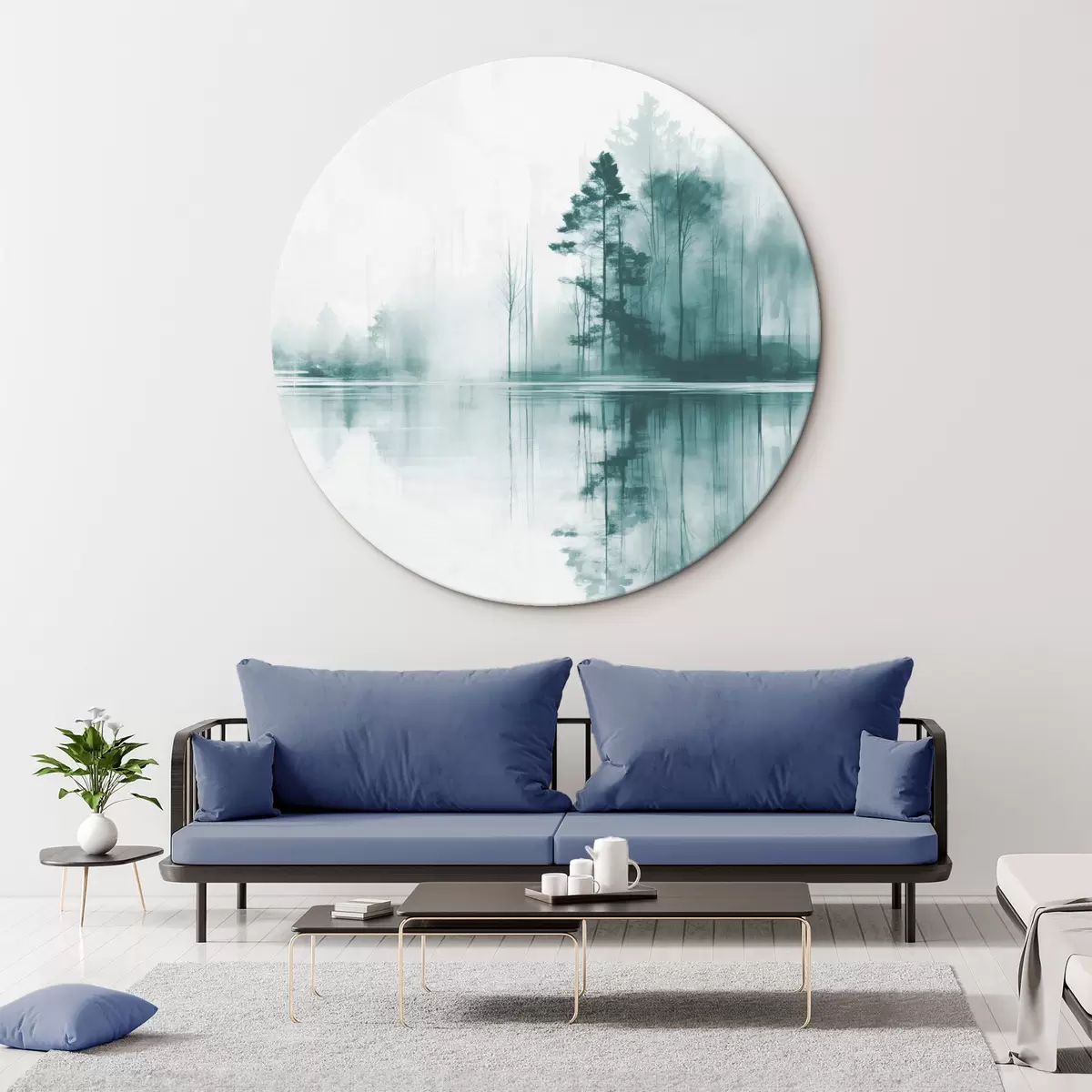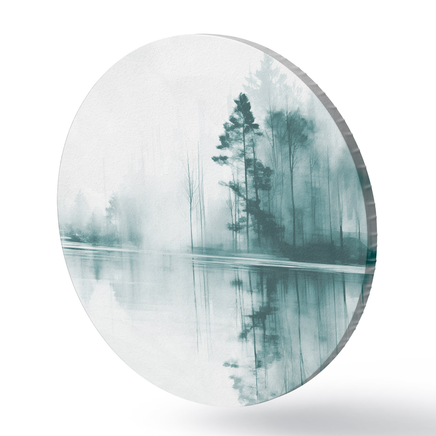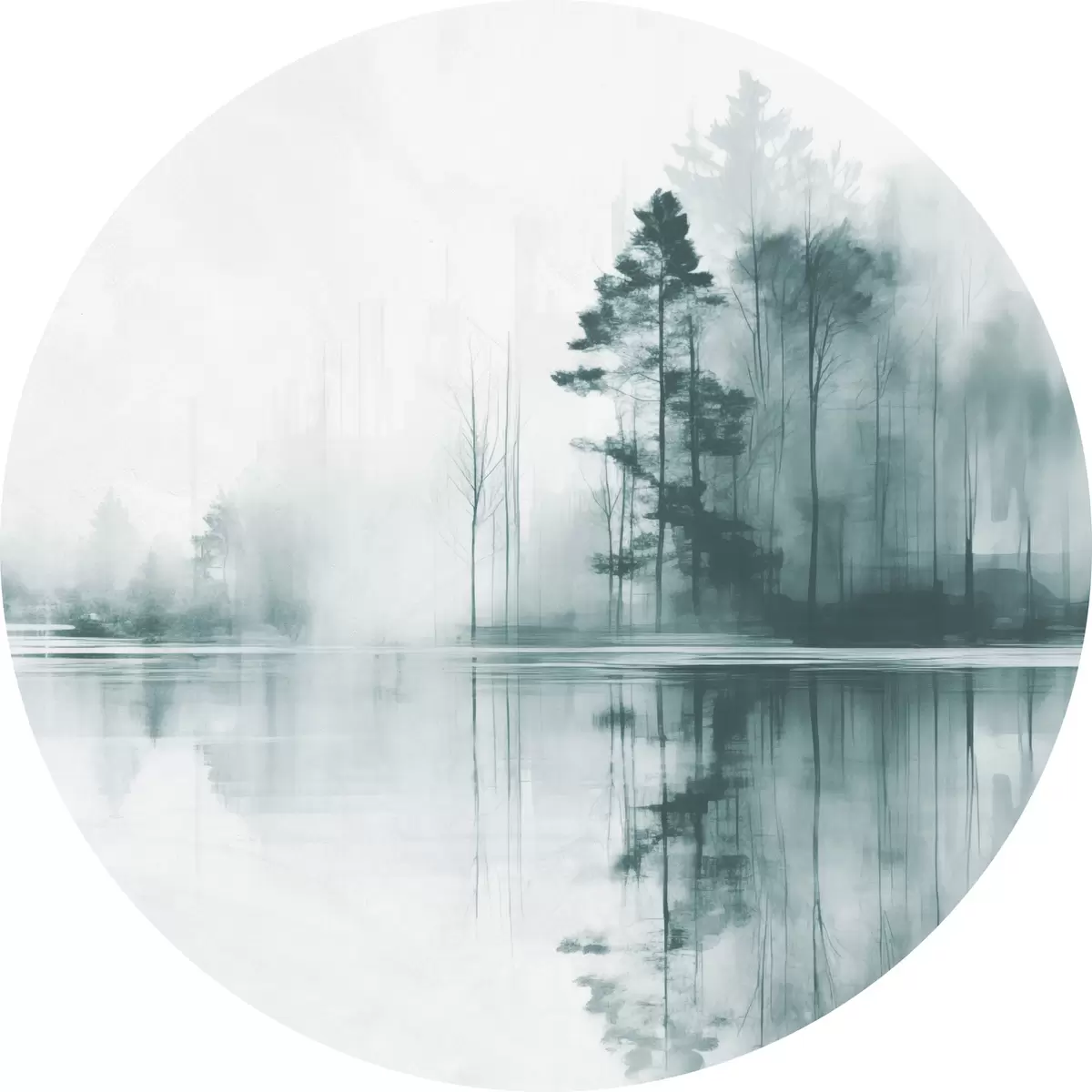Runde Gemälde Abstrakter Wald mit hohen Bäumen, die sich im Wasser spiegeln, gedeckte Farbpalette r44403