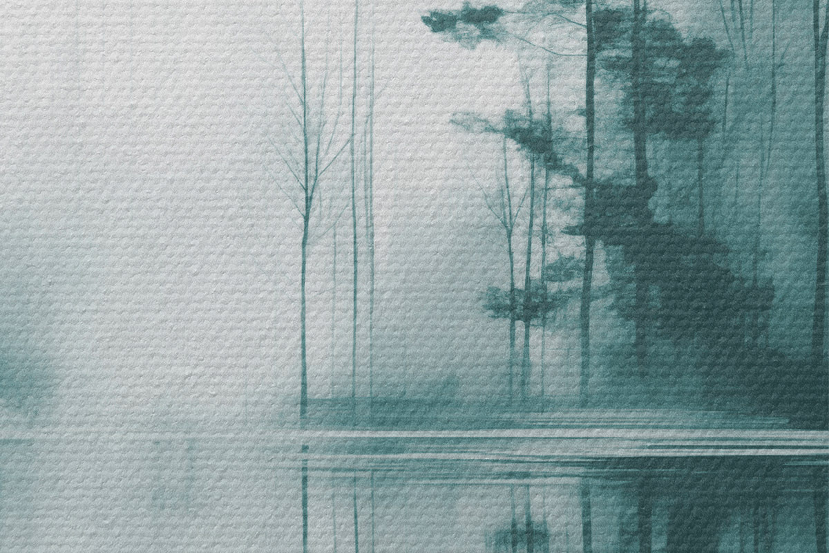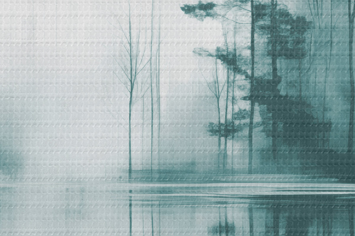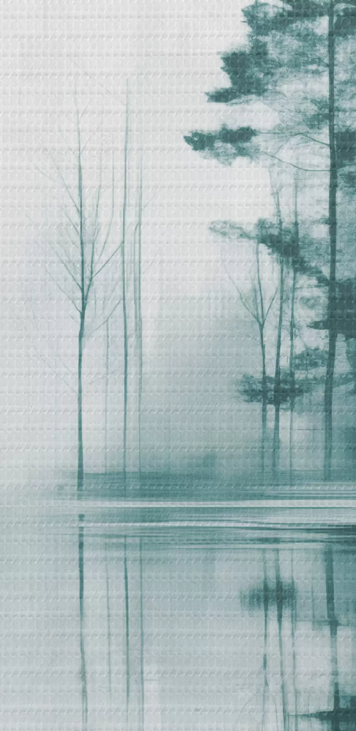 Bild Abstrakter Wald mit hohen Bäumen, die sich im Wasser spiegeln, gedeckte Farbpalette Nr r44403