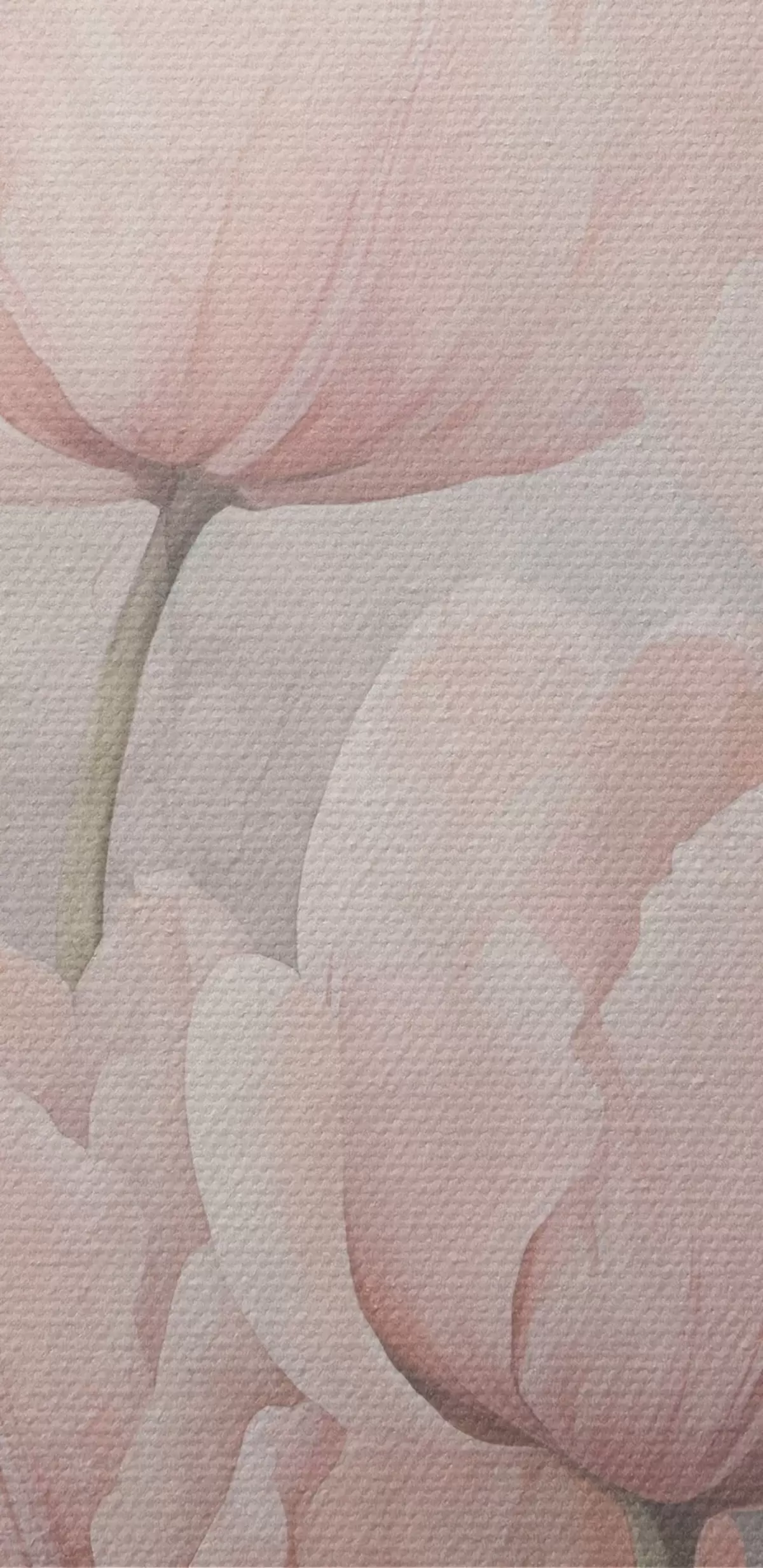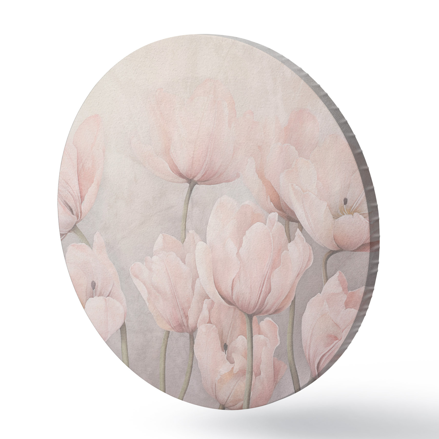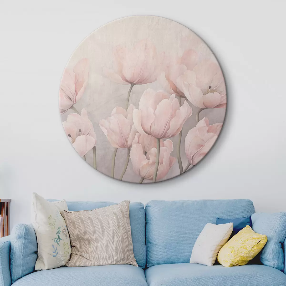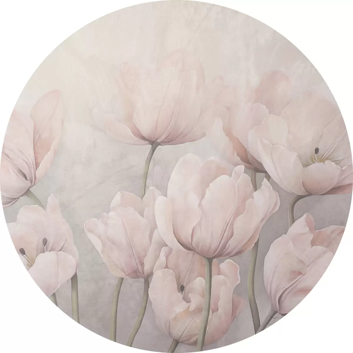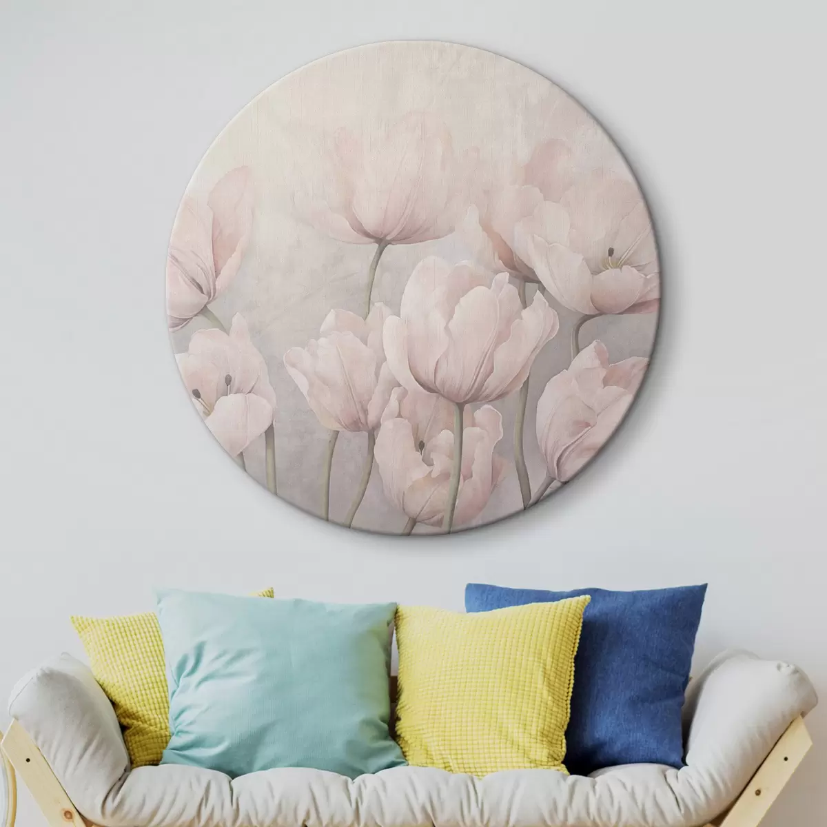 Runde Gemälde Rosafarbene Tulpen mit langen Stielen, weiche, gedämpfte Farben, hellgrauer Hintergrund r44407