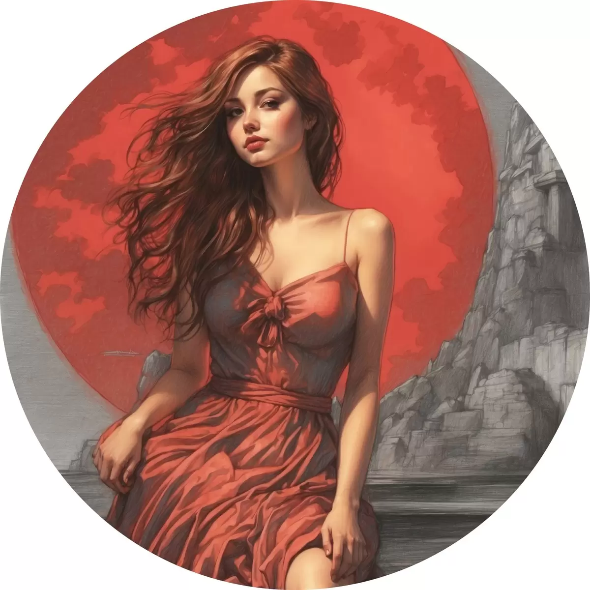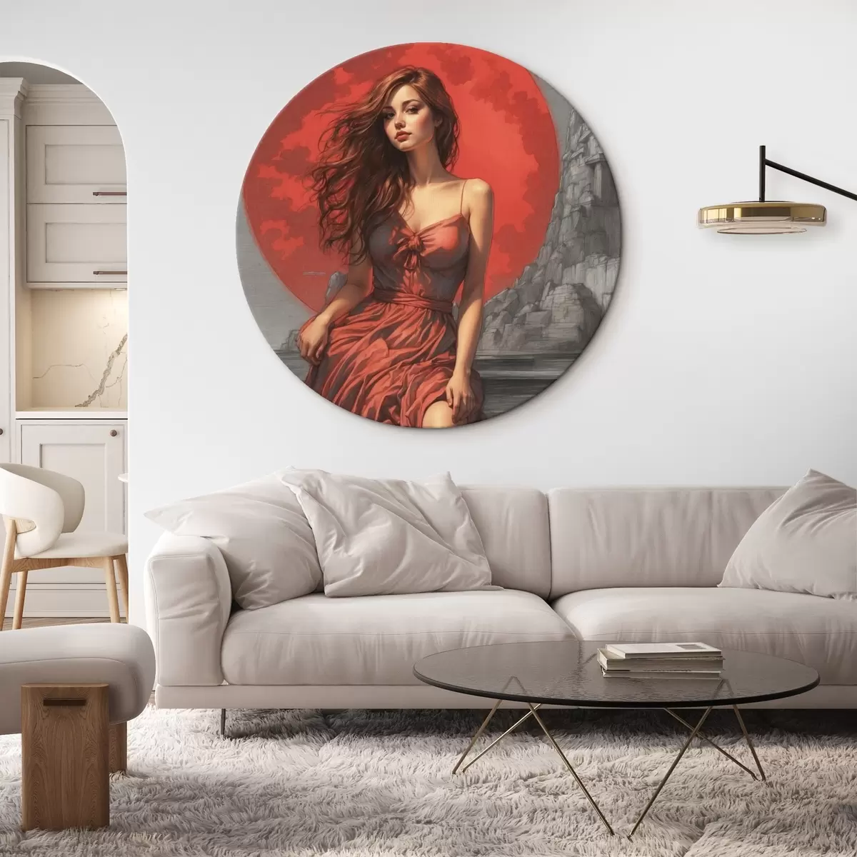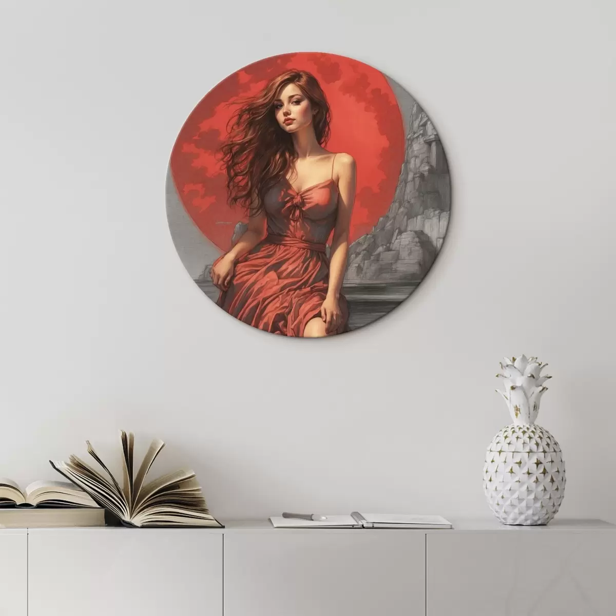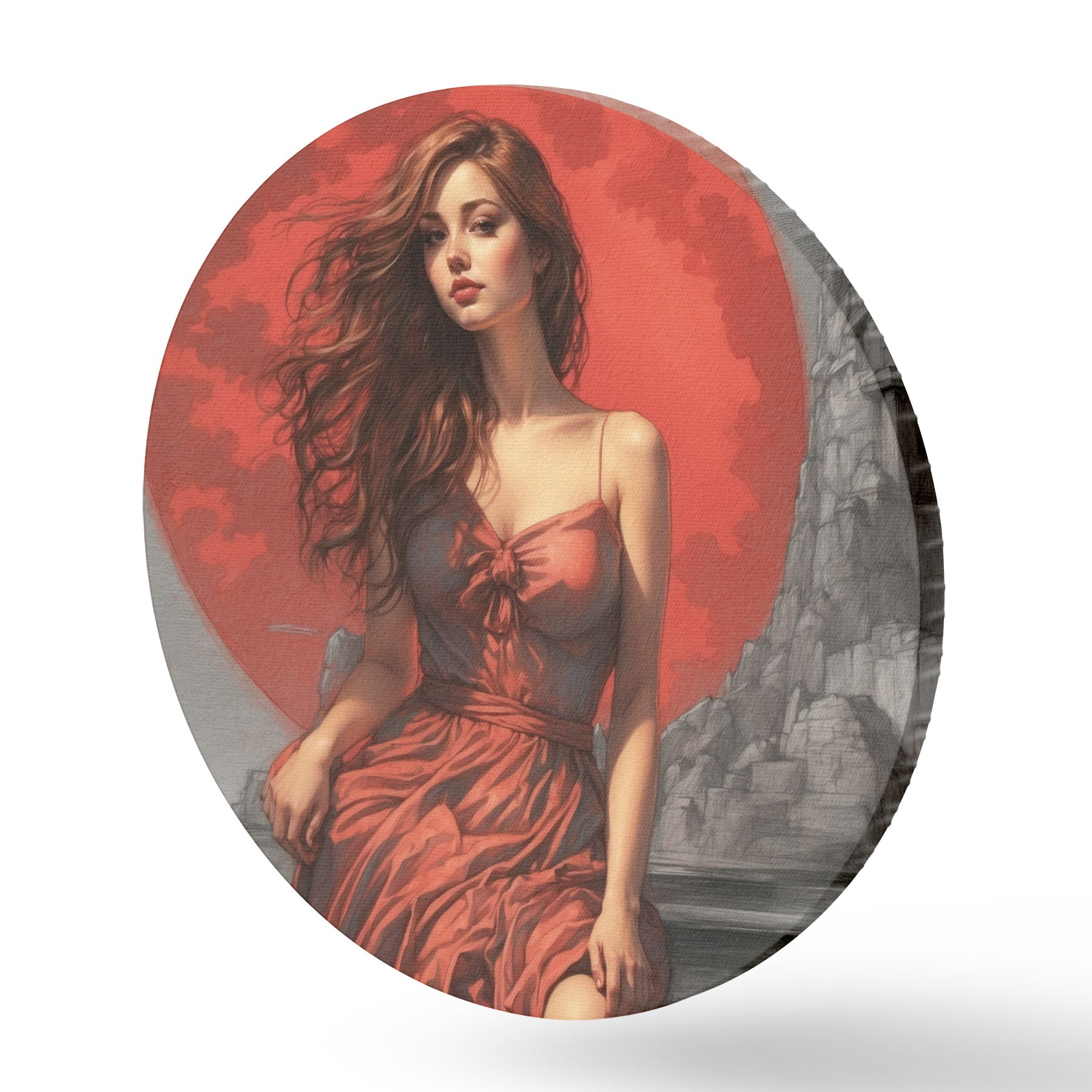 Runde Gemälde Mädchen auf rotem Mond Hintergrund r44448