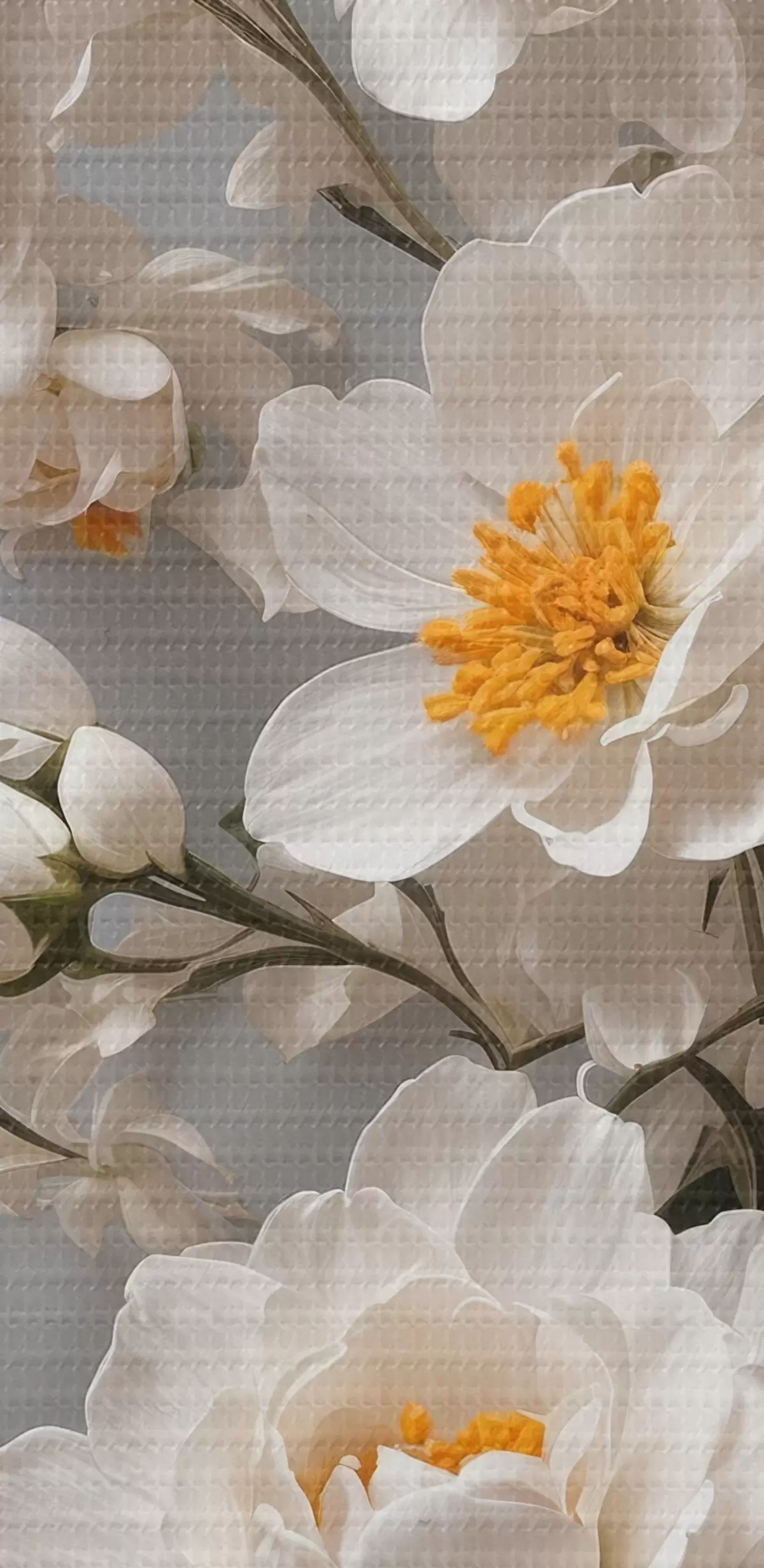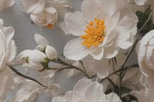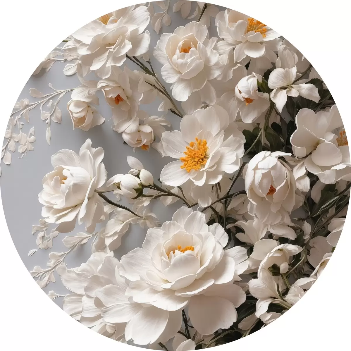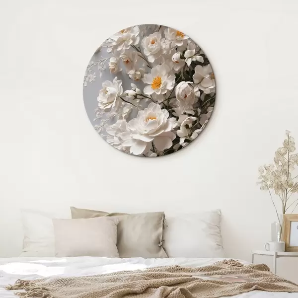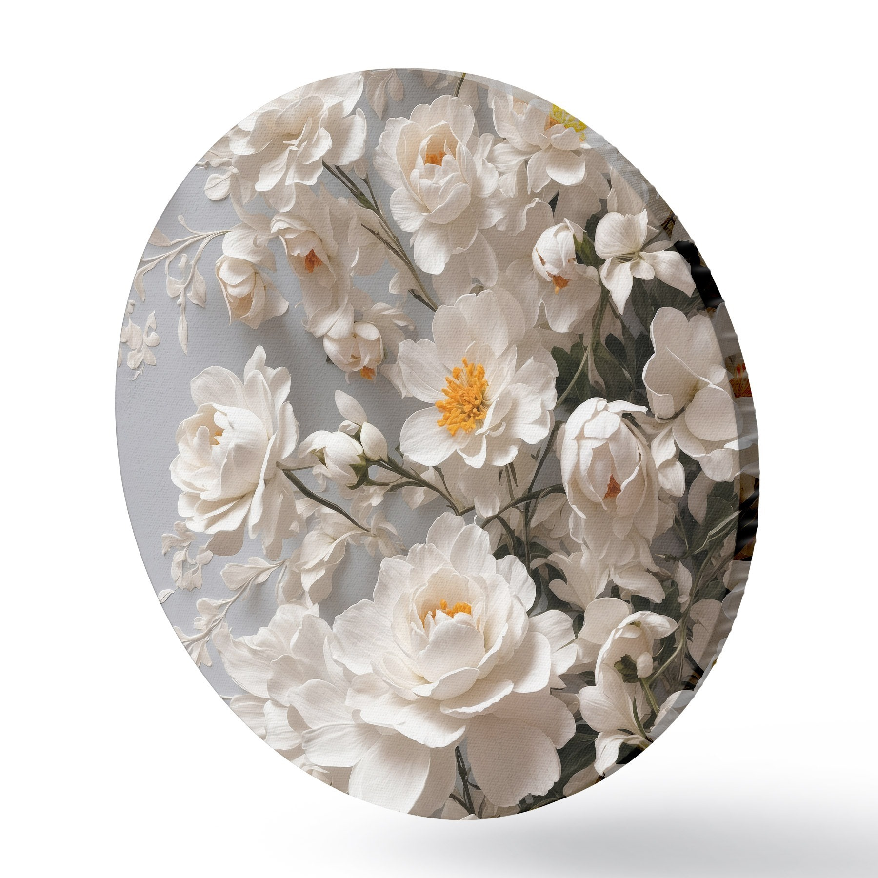 Runde Gemälde Weiße Blumen und Blätter auf weißem Hintergrund r44465