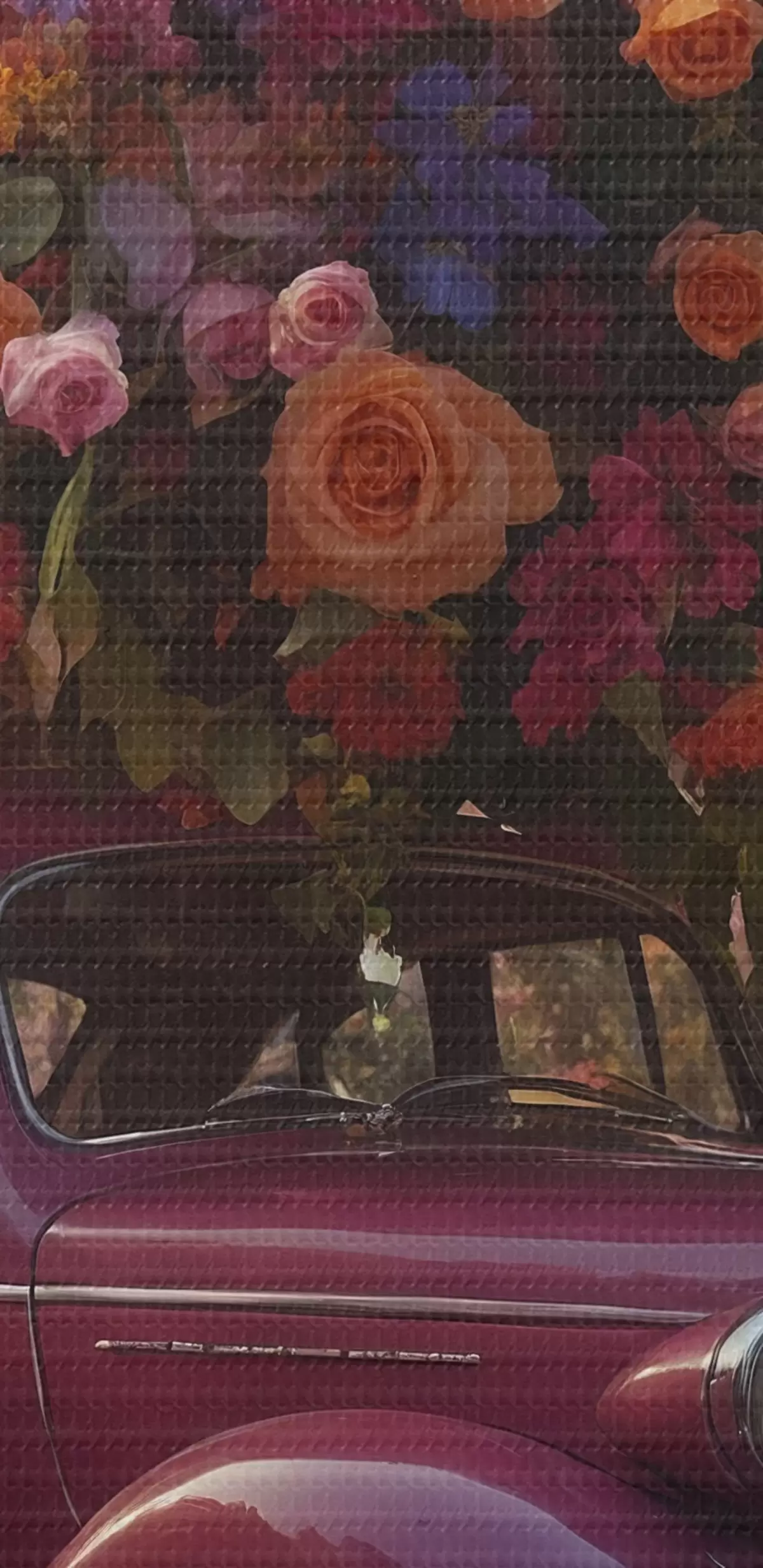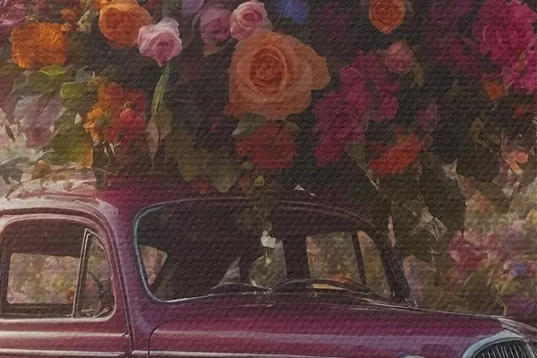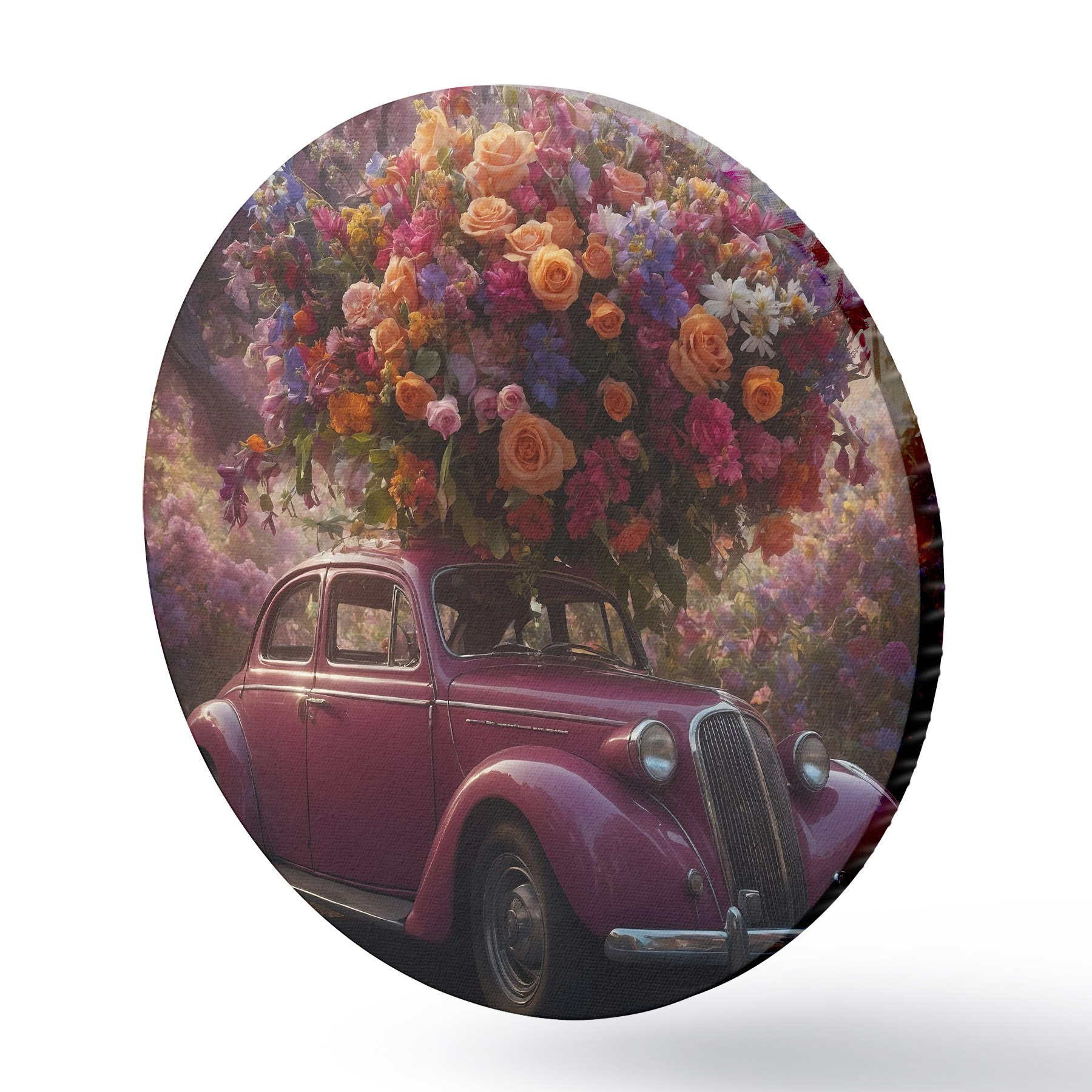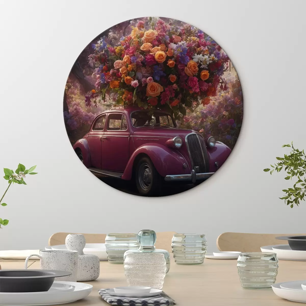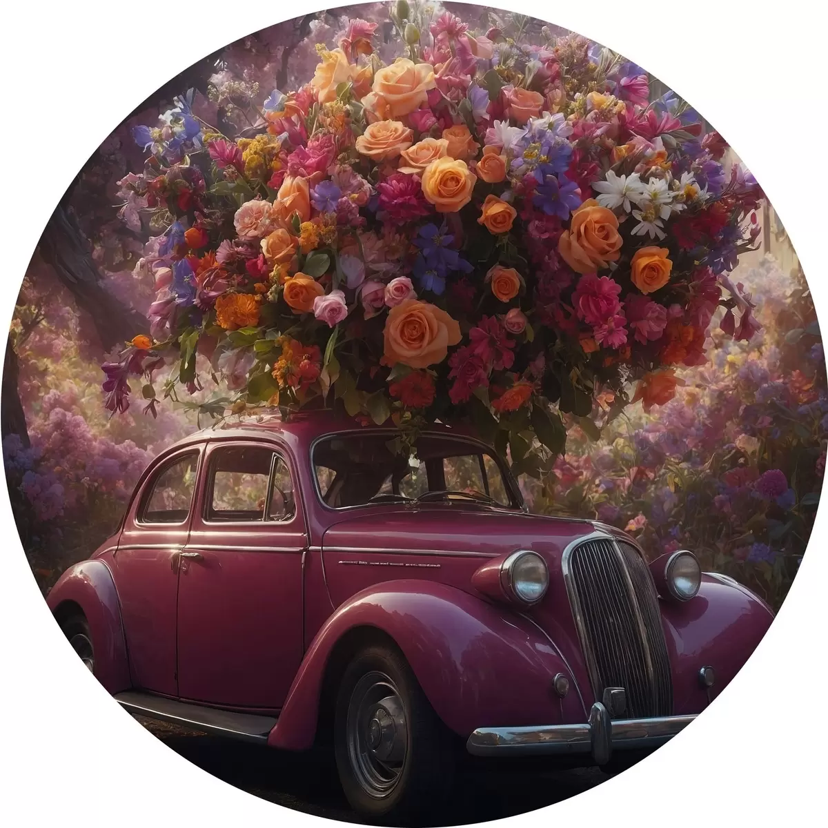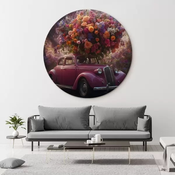 Runde Gemälde Retro-Auto und ein riesiger Blumenstrauß r44471