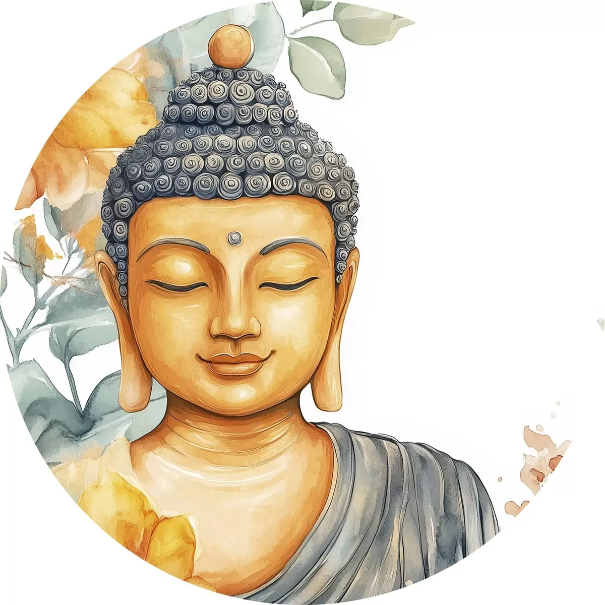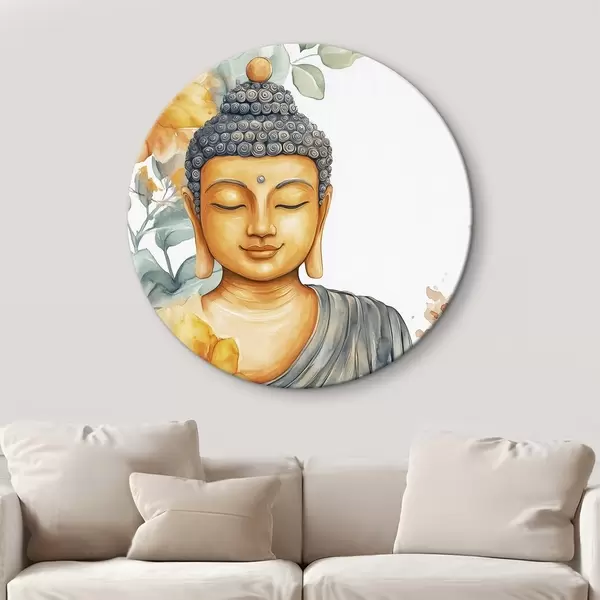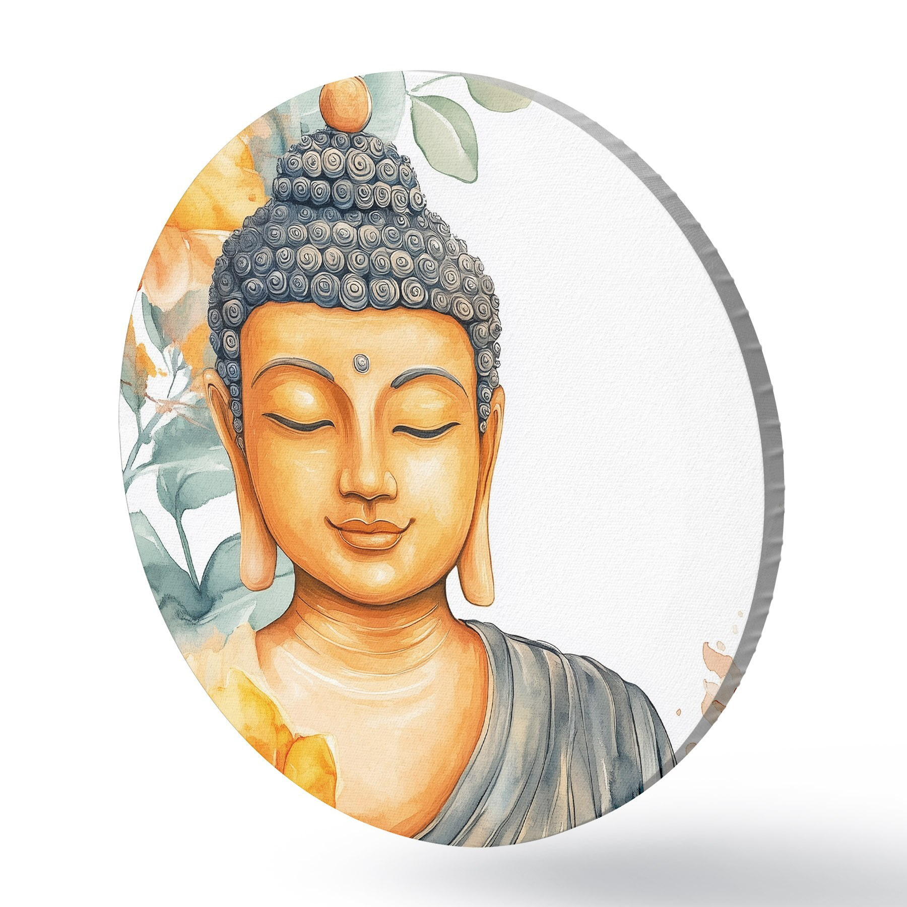 Runde Gemälde Buddha umgeben von orangefarbenen Blumen, Aquarellstil r44508
