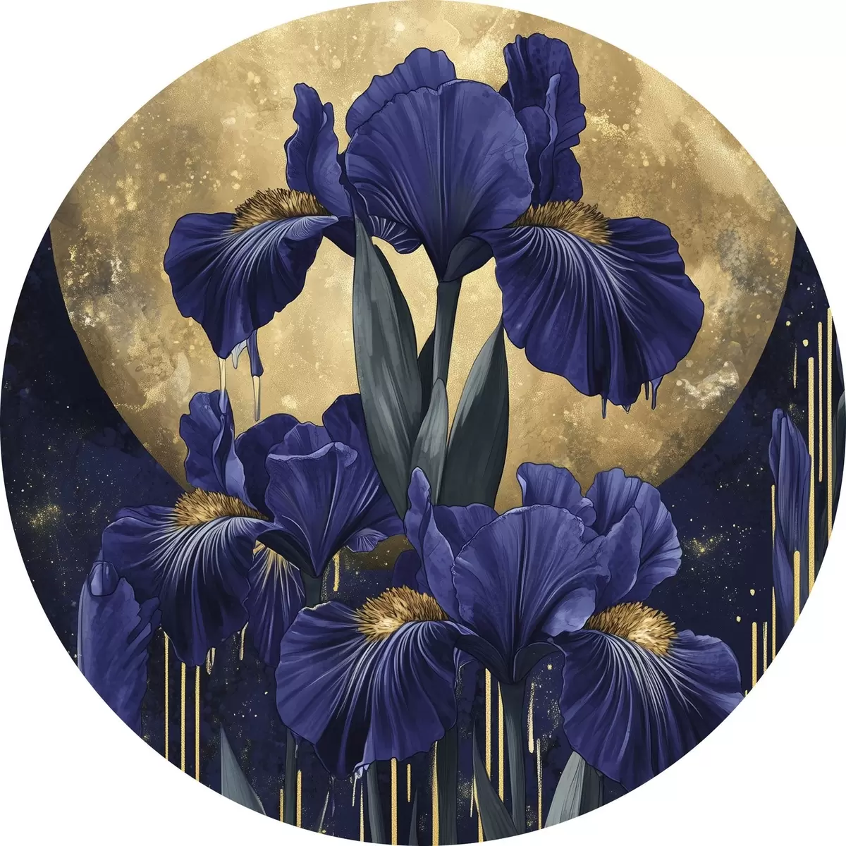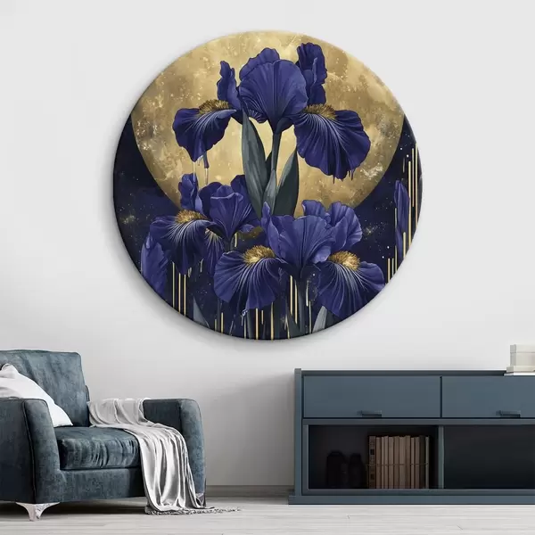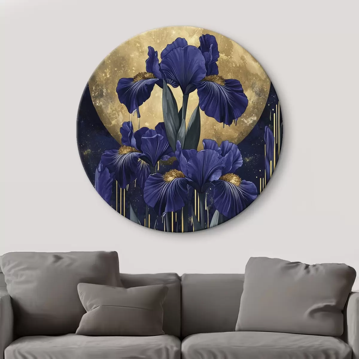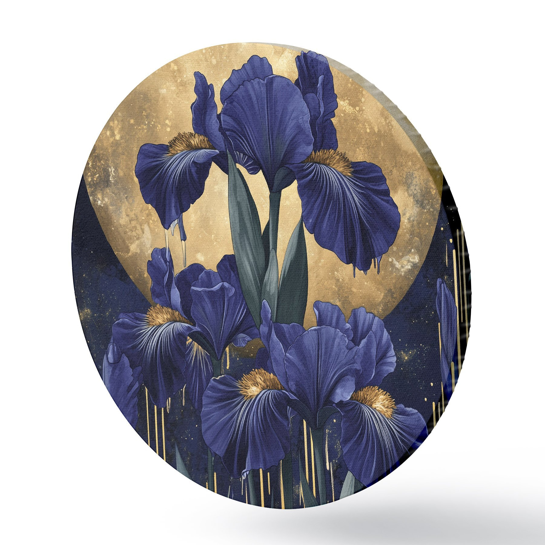 Runde Gemälde Irisblüten, leuchtender Mond, Nachthimmel, blaue Farben r44510
