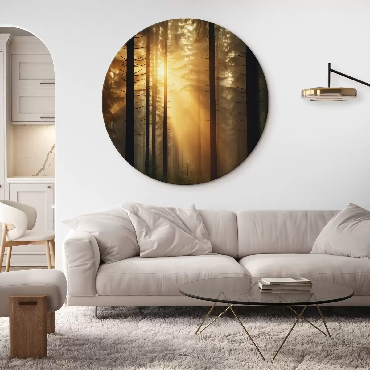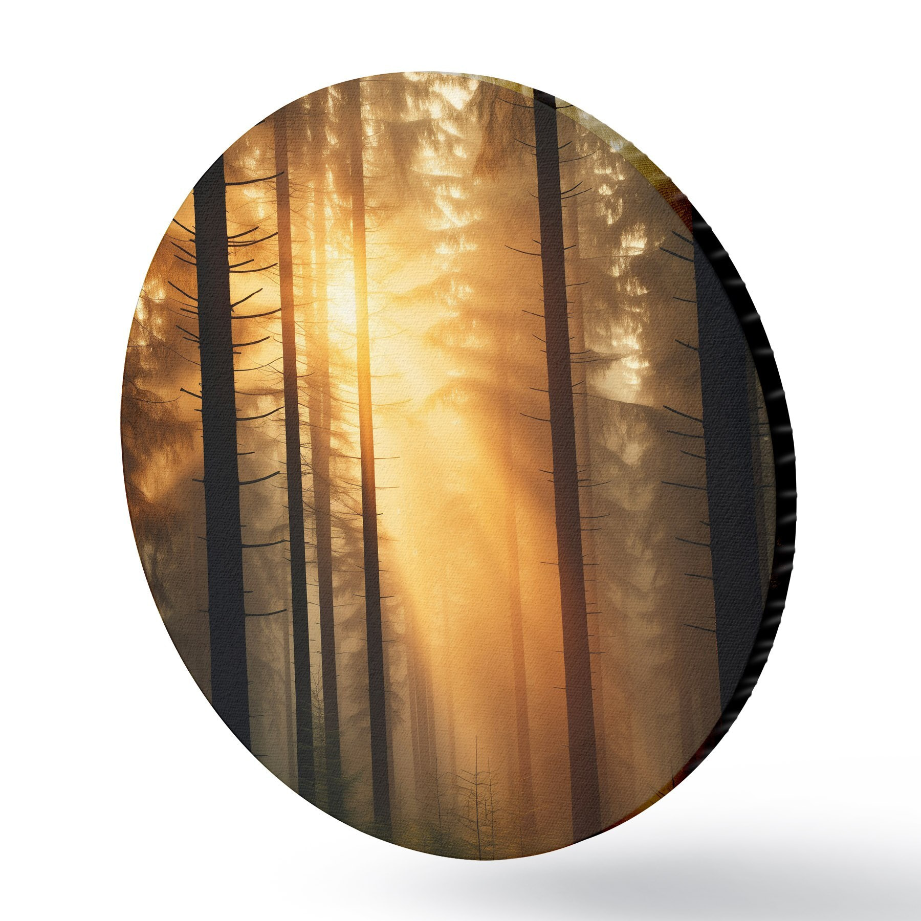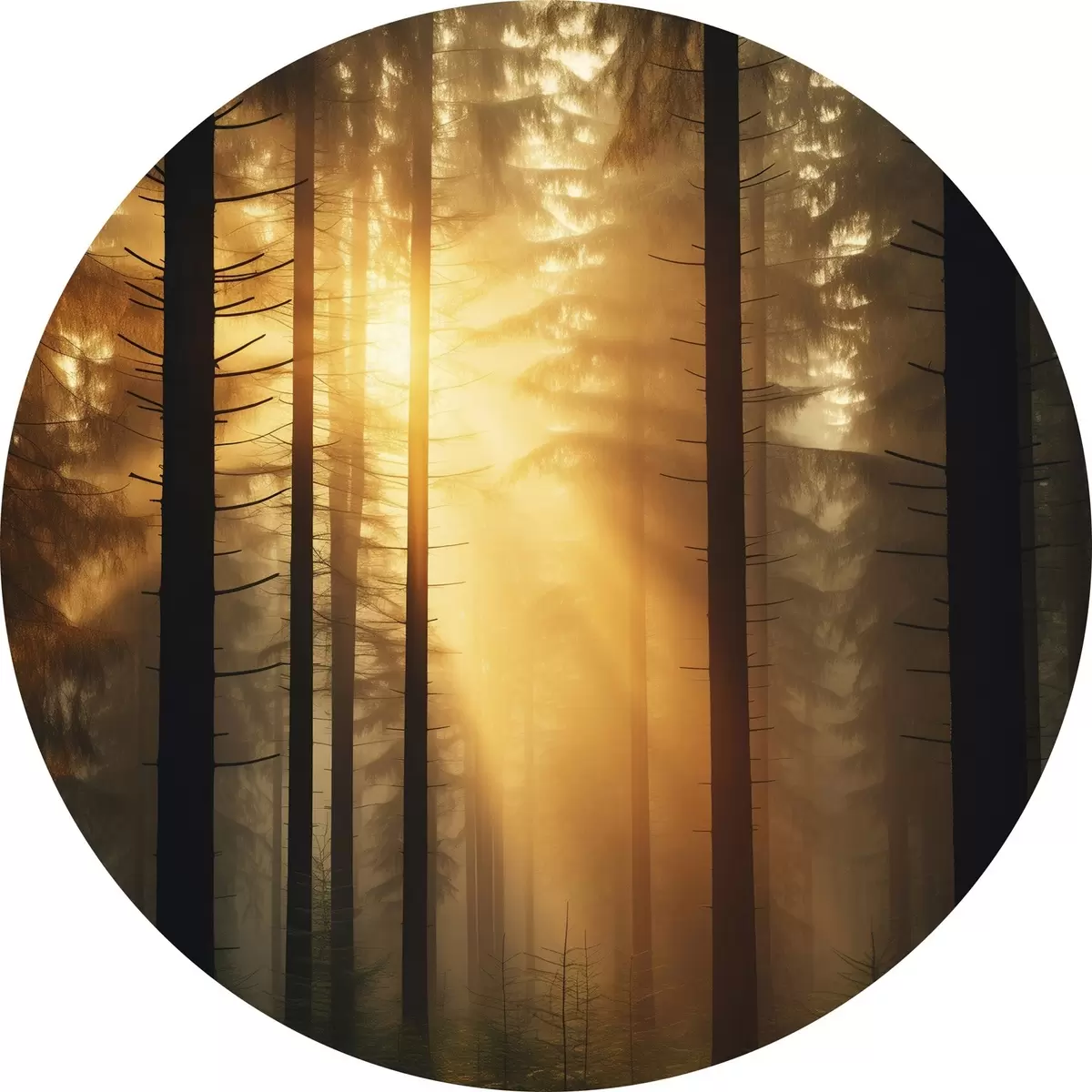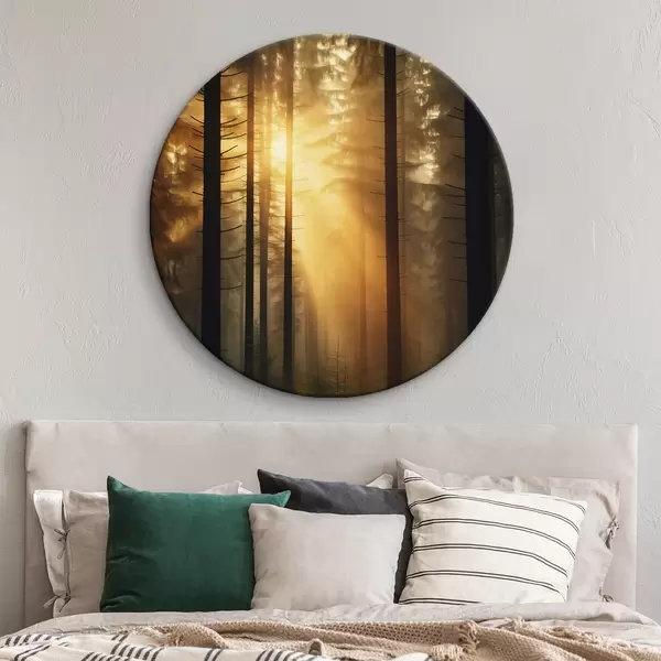Runde Gemälde Dichter Kiefernwald mit Sonnenuntergang Licht, Realismus, Natur r44615