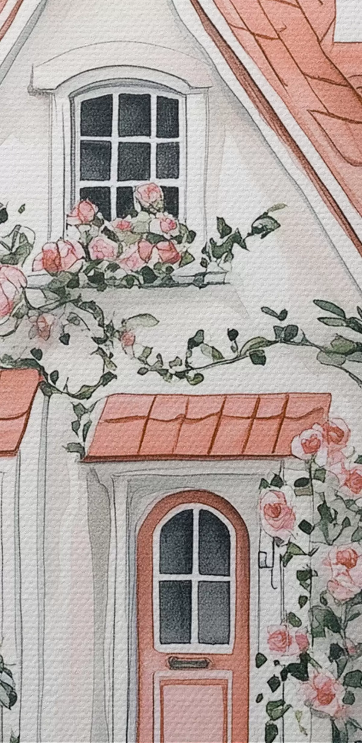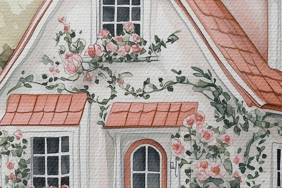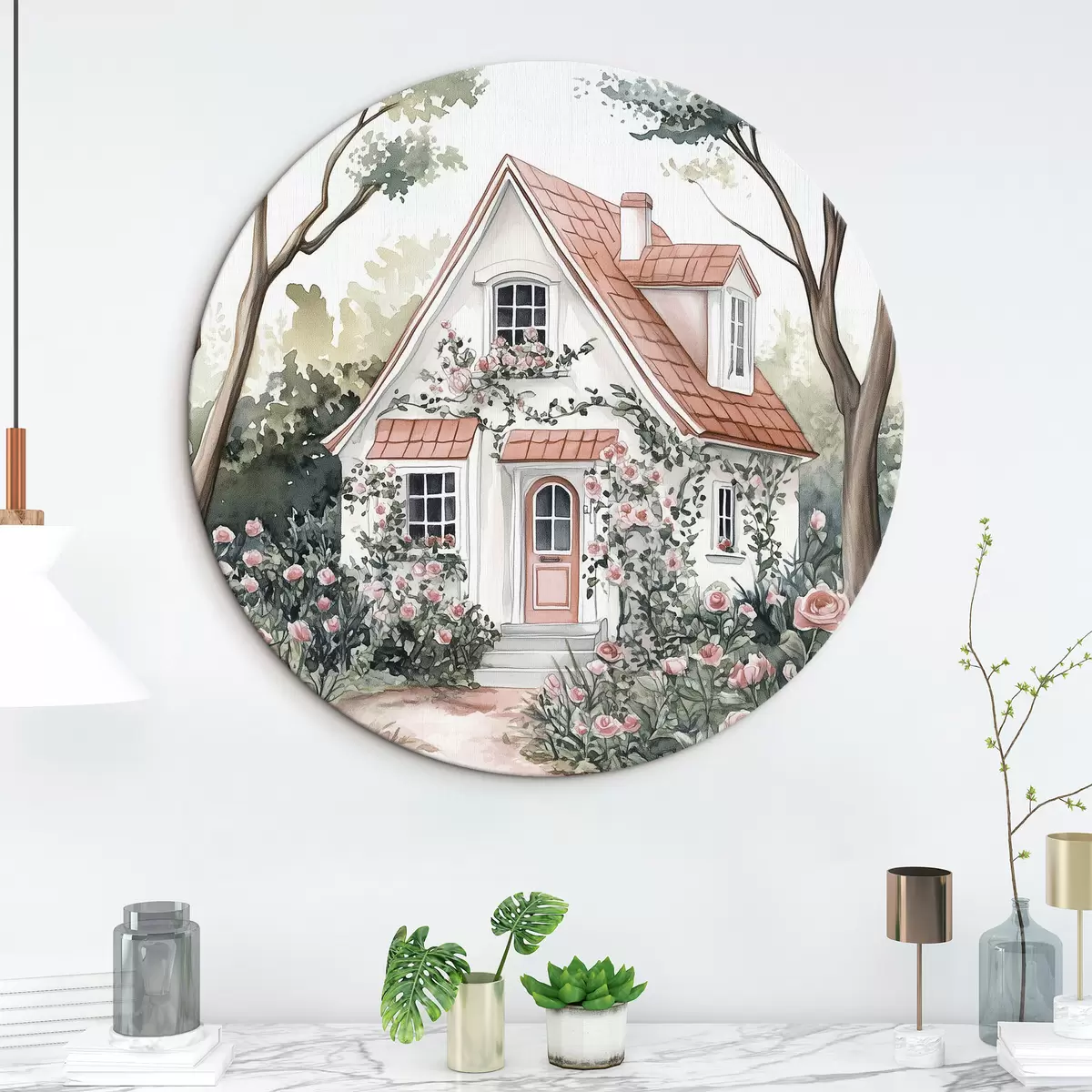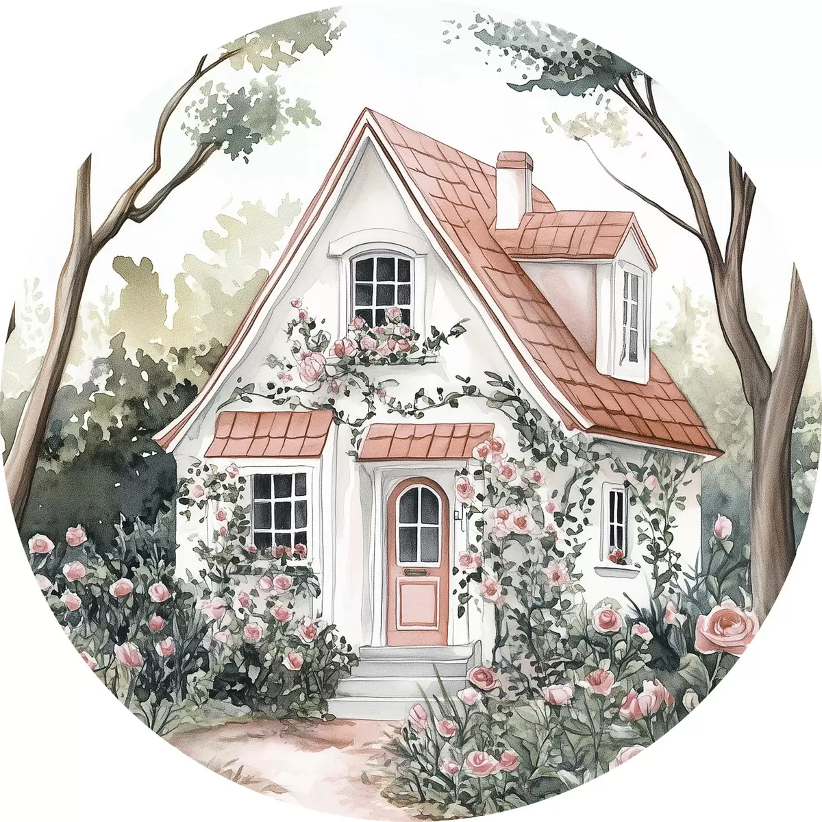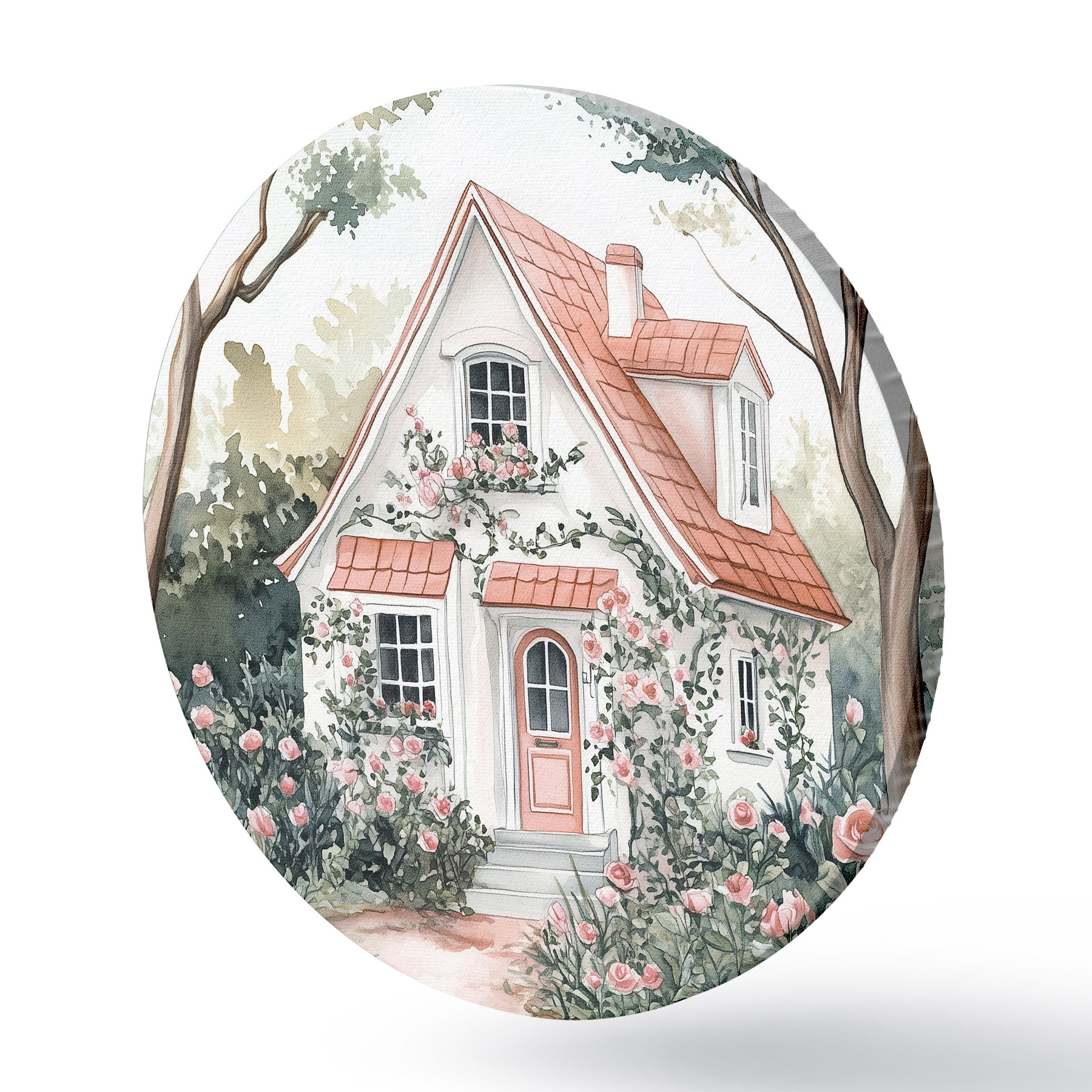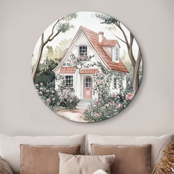 Runde Gemälde Weißes Haus mit Rosengarten im Wald r44716