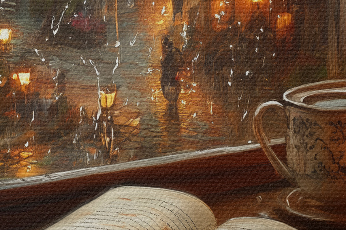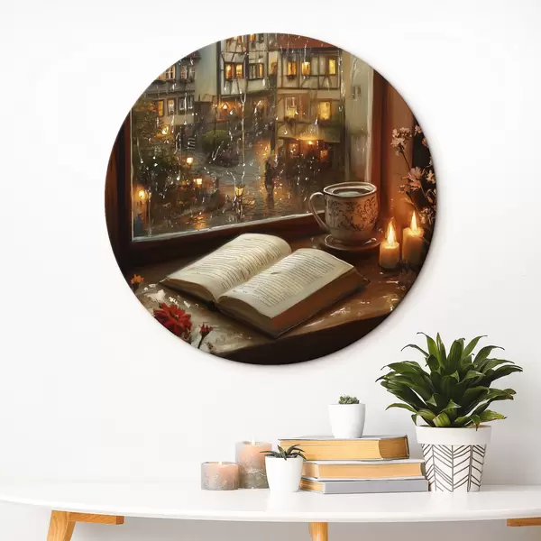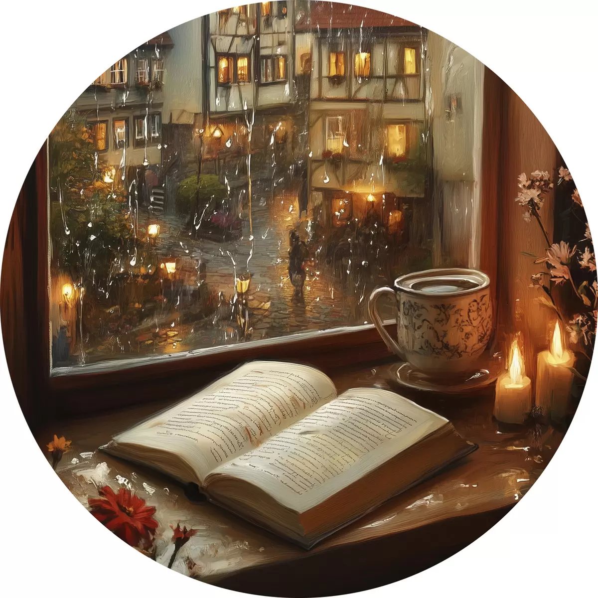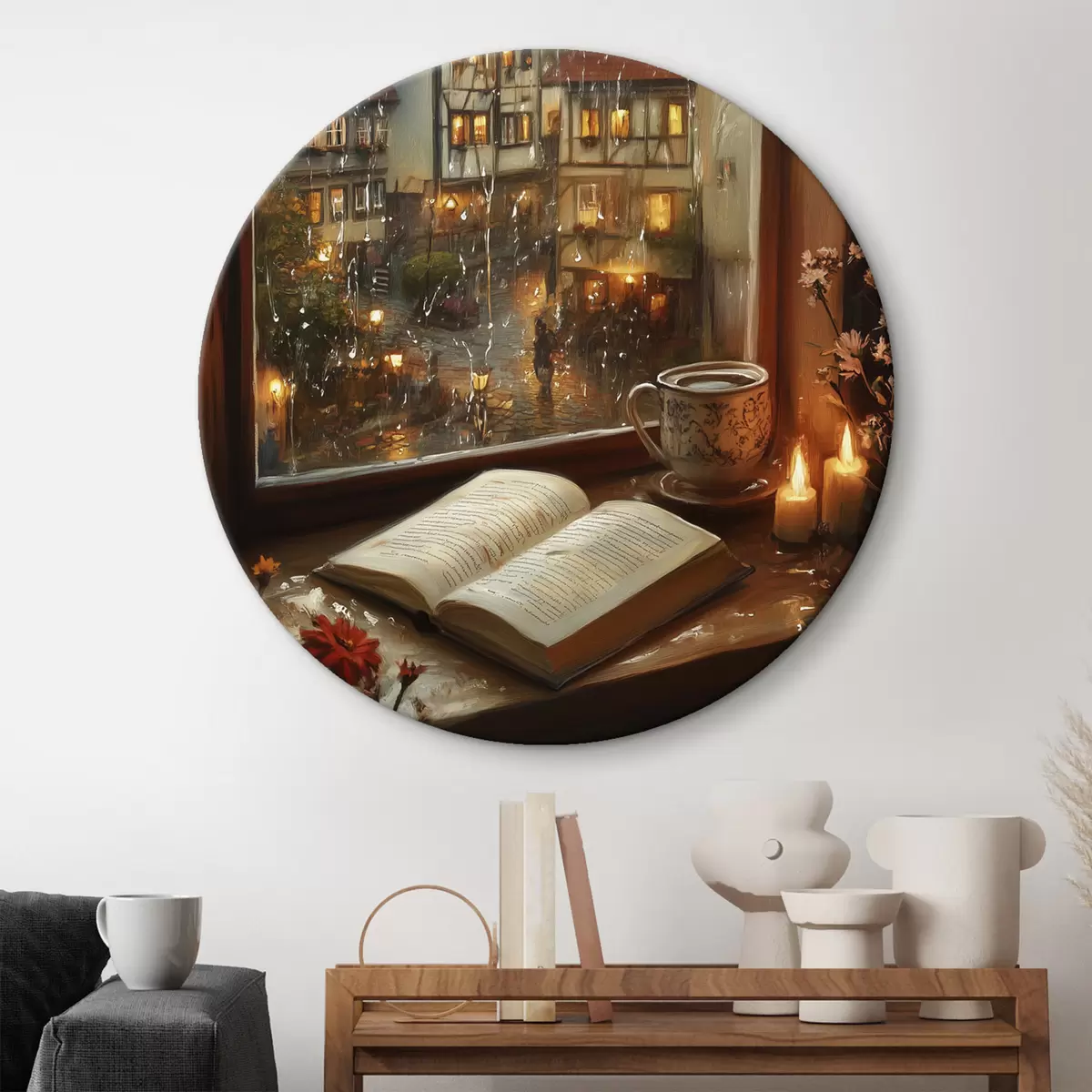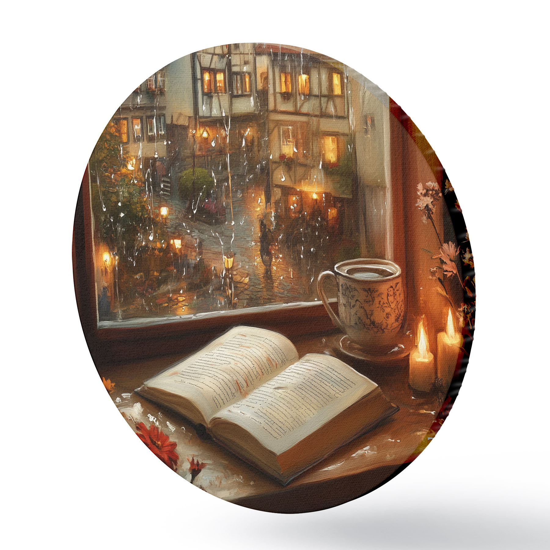 Runde Gemälde Buch auf der Fensterbank, Kerzen, Regentag, gemütlich r44722