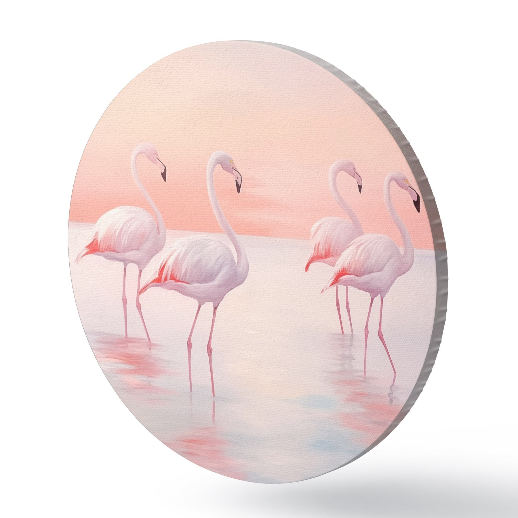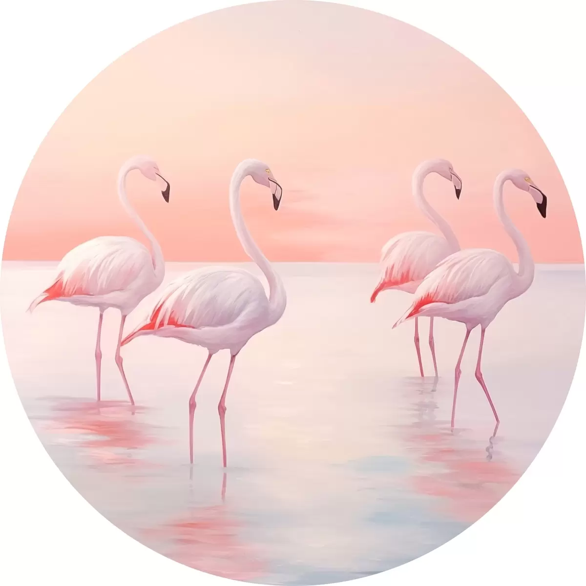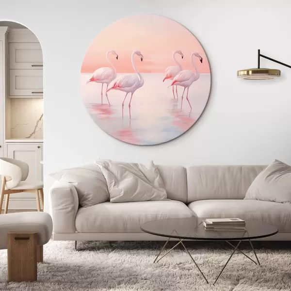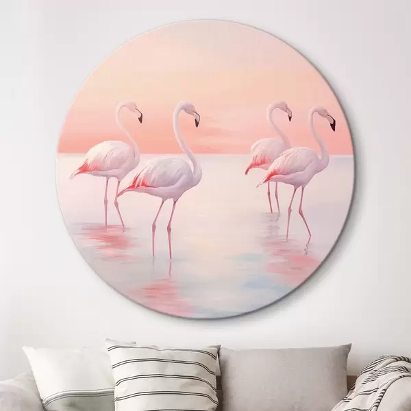 Runde Gemälde Flamingos im seichten Wasser bei Sonnenuntergang r44732
