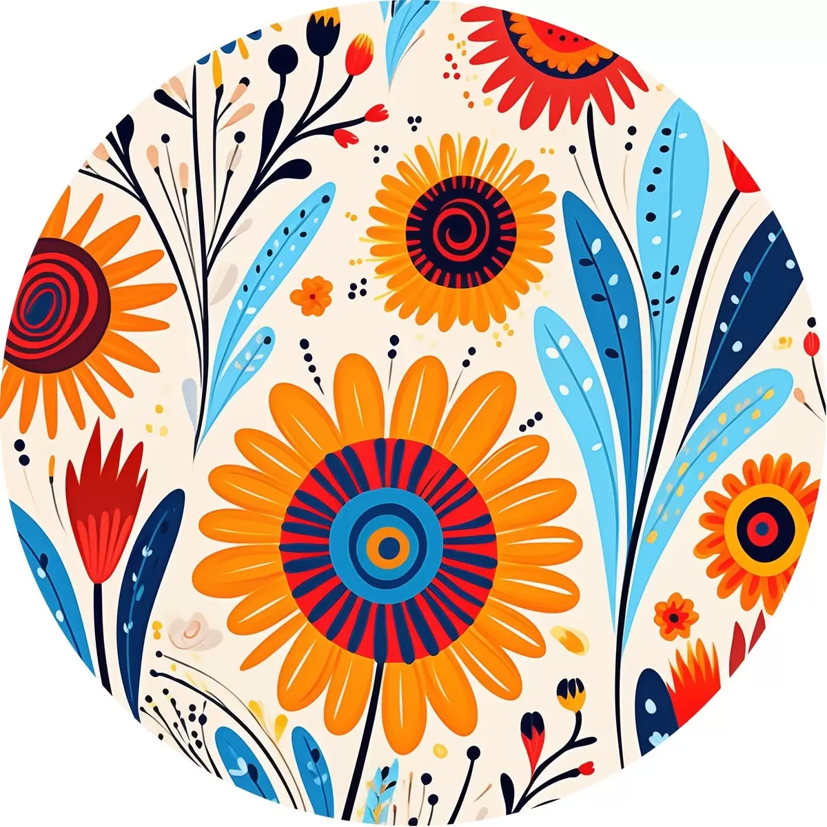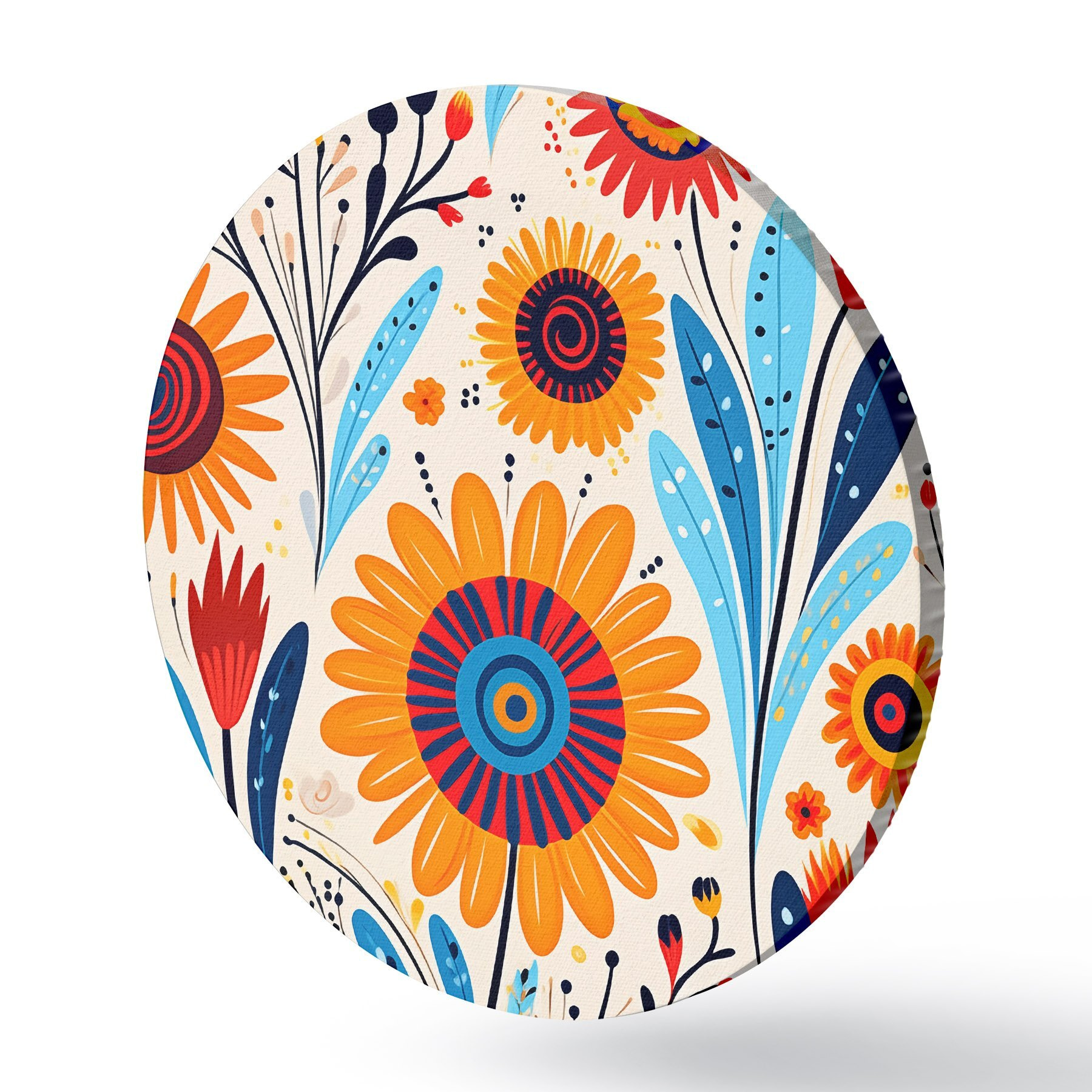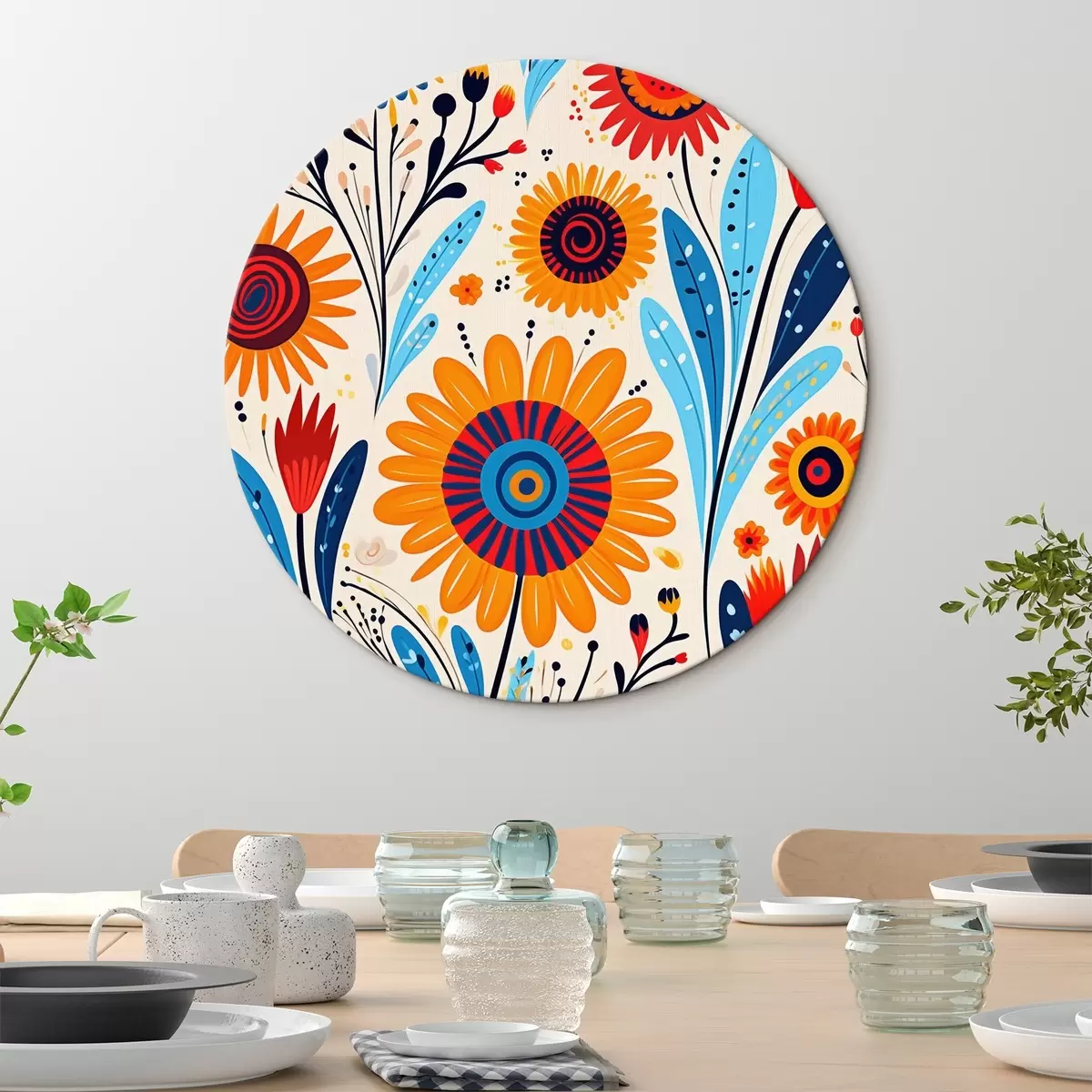 Runde Gemälde Stilisierte Blumen in blauer und orangefarbener Palette r44761