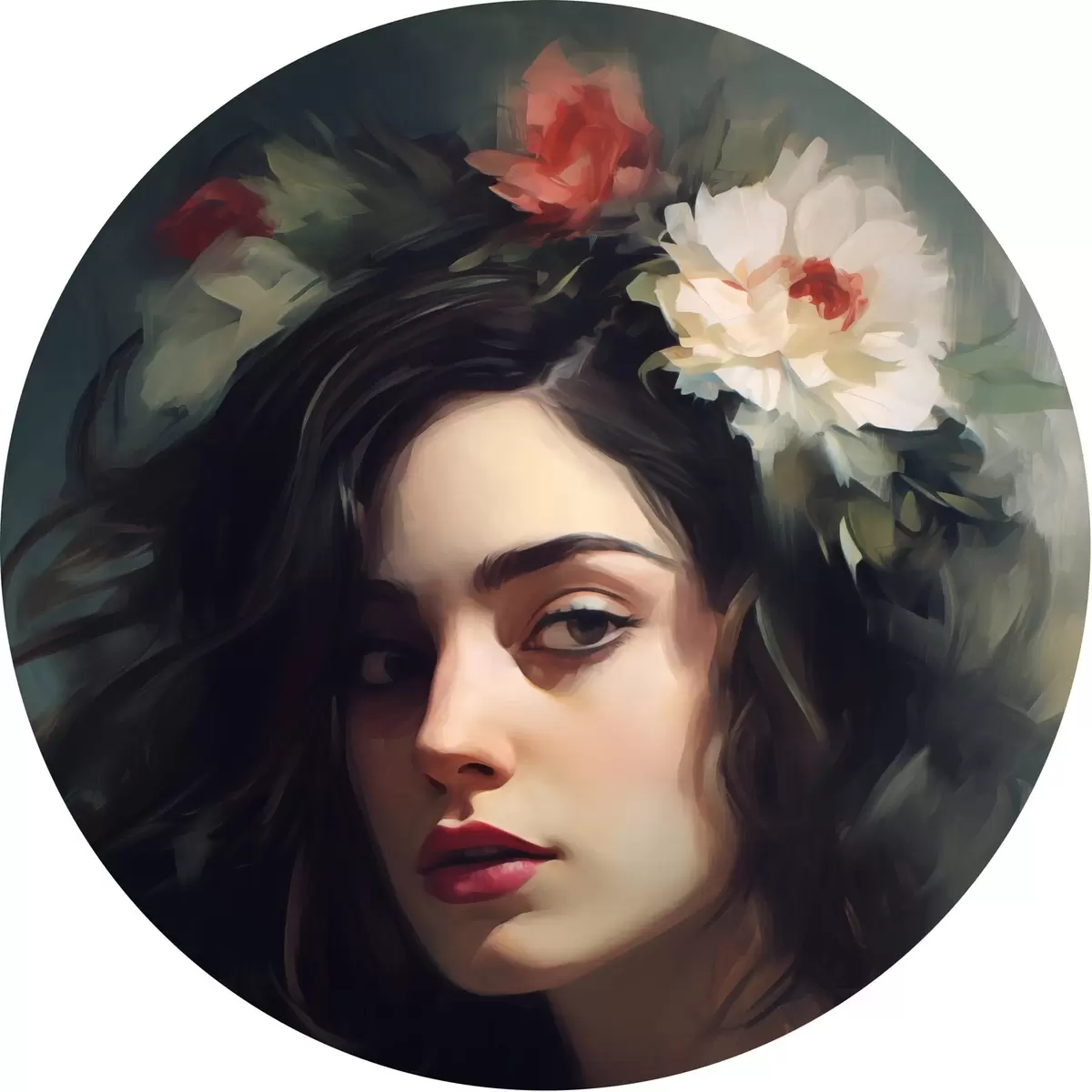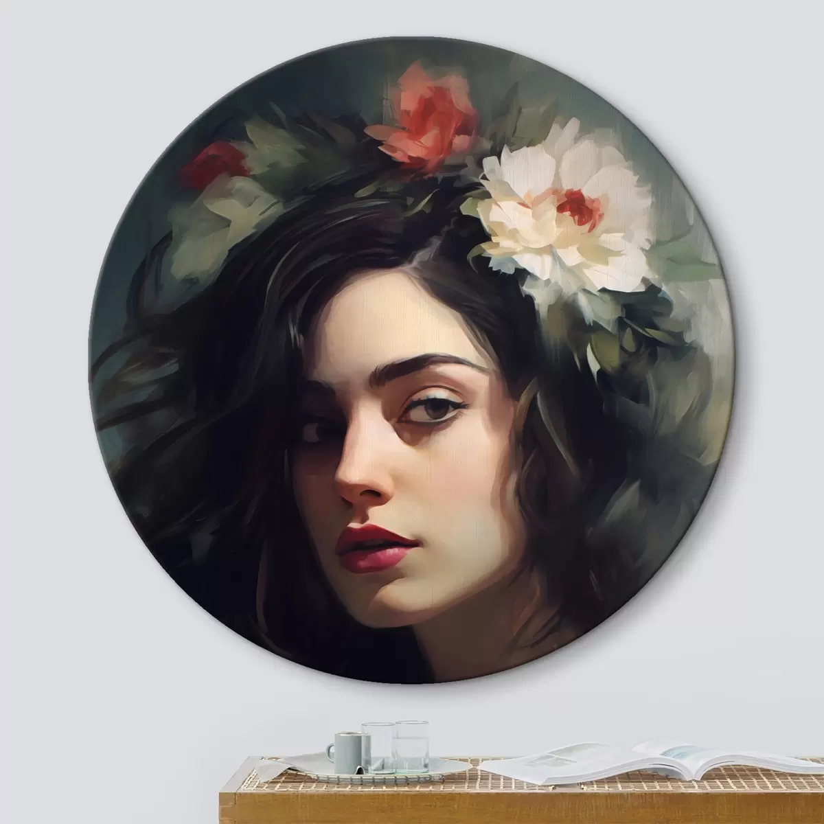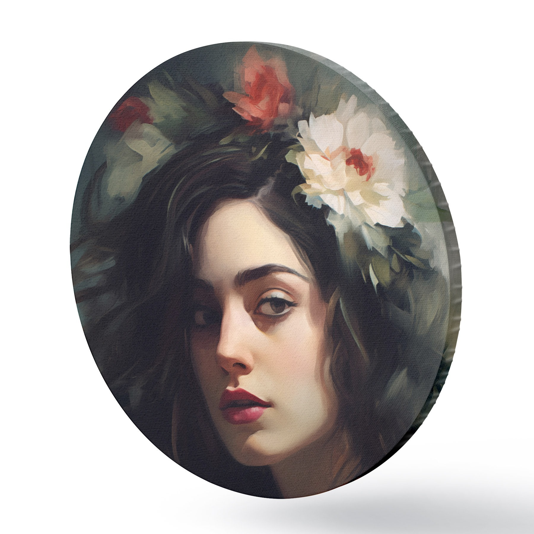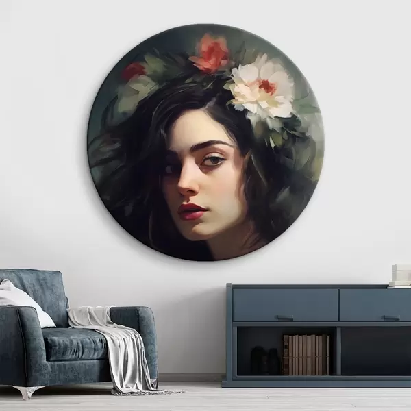 Runde Gemälde Dunkelhaarige Frau mit einer Blumenkrone r44762