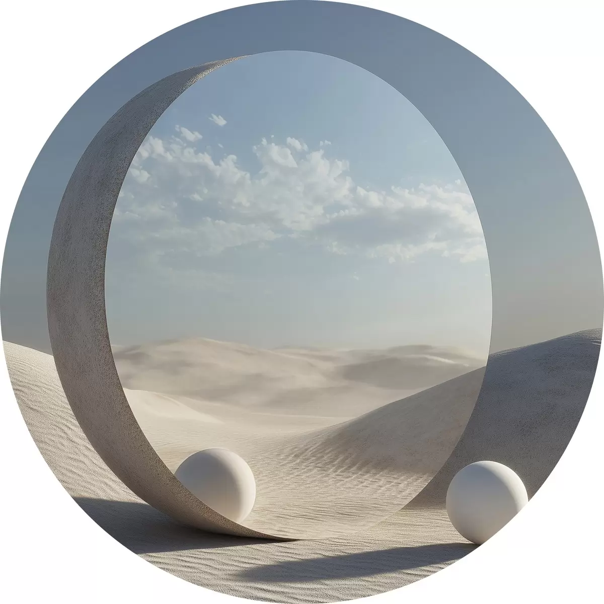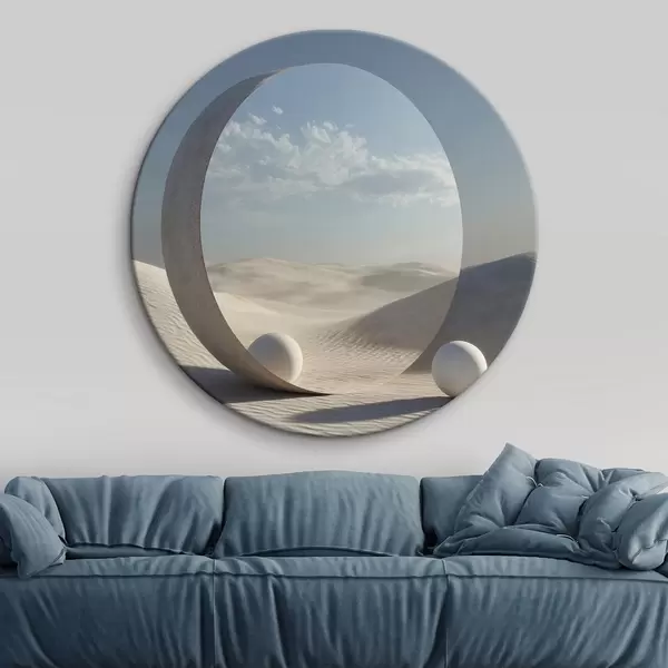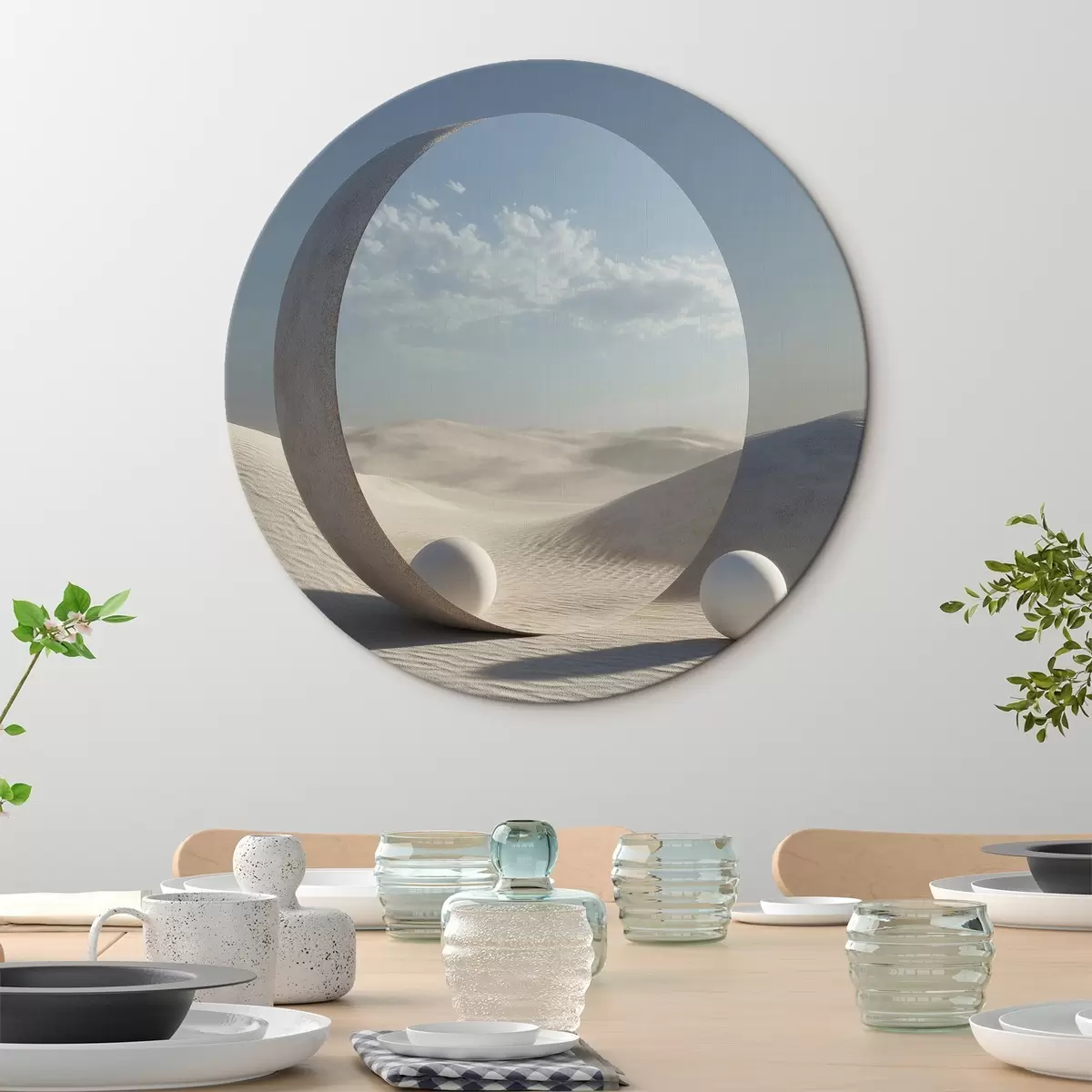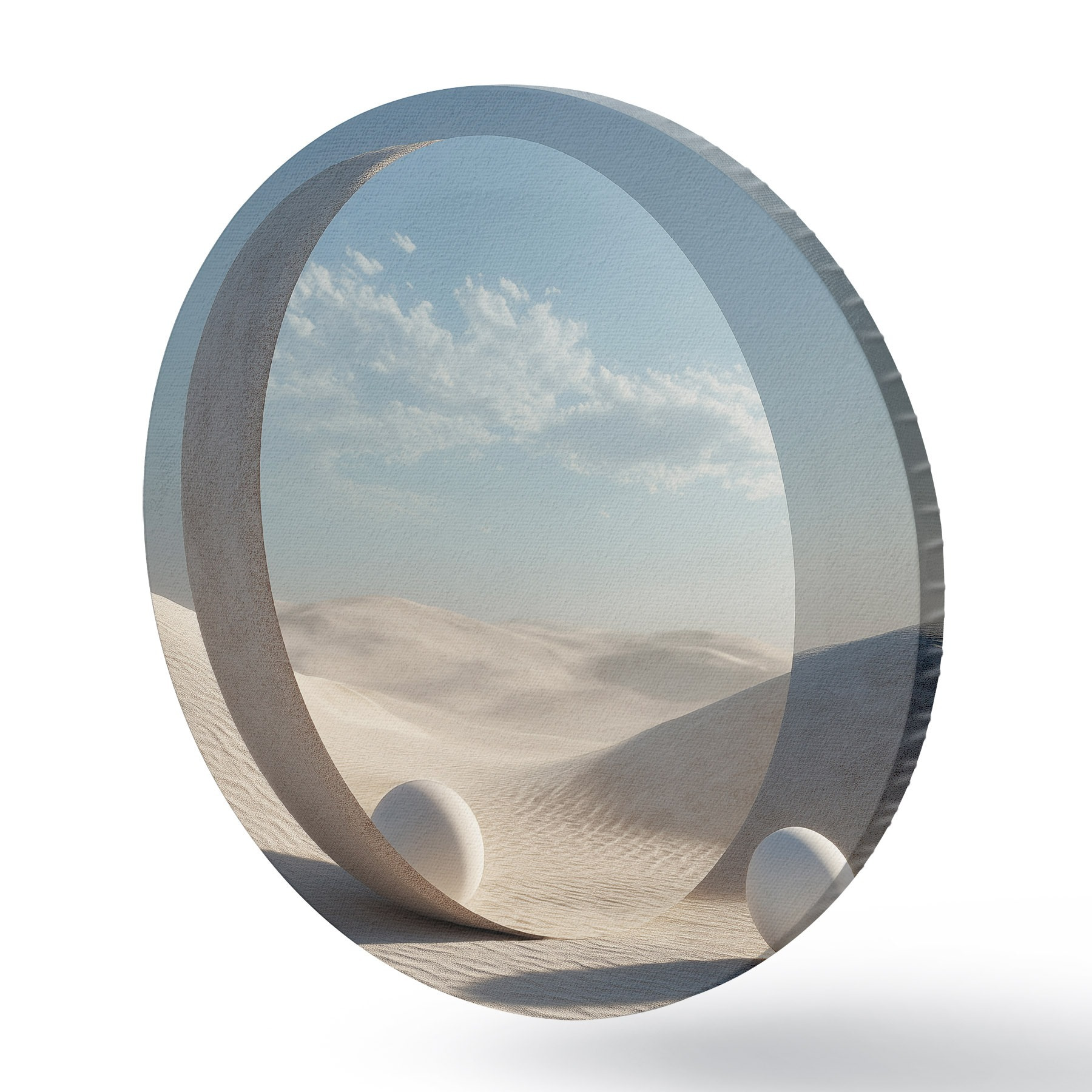 Runde Gemälde Surreale Wüstenlandschaft mit einem runden Spiegel, der den Himmel und den Mond reflektiert r44792