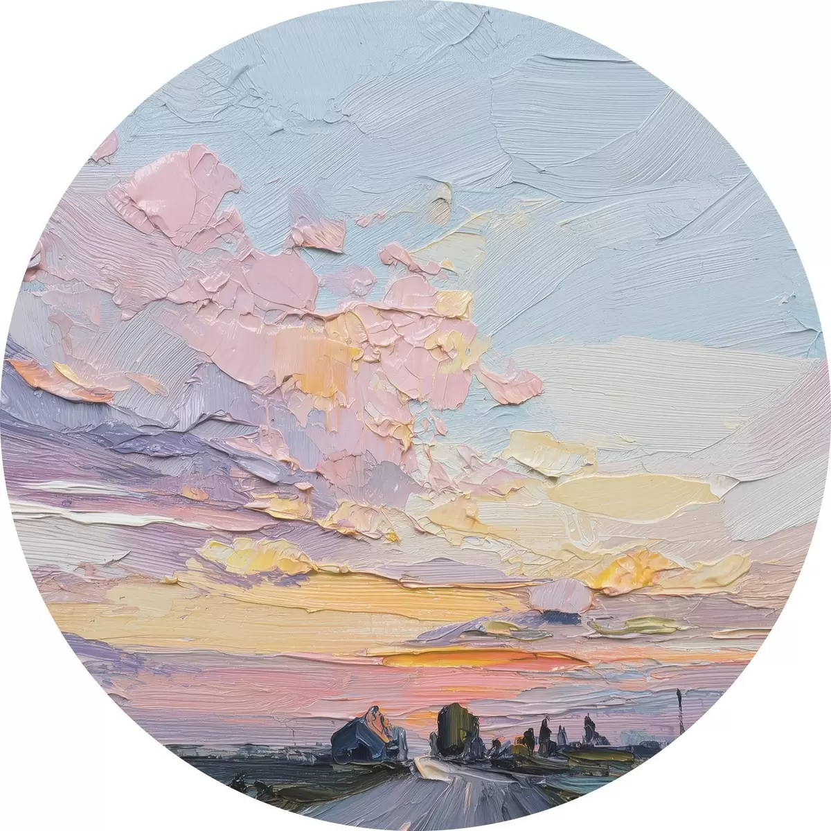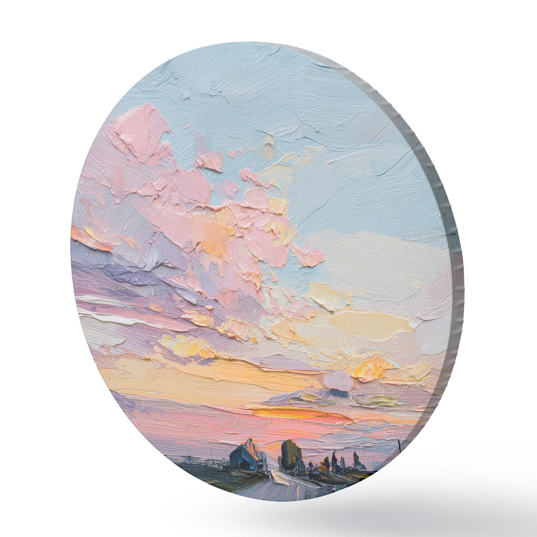Runde Gemälde Landschaften im Ölstil, Sonnenuntergang r44794