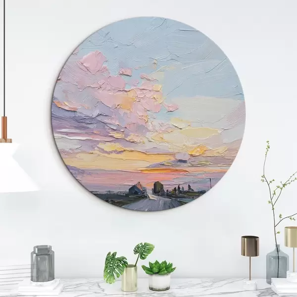Runde Gemälde Landschaften im Ölstil, Sonnenuntergang r44794