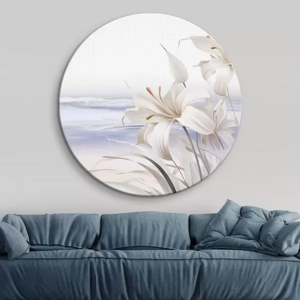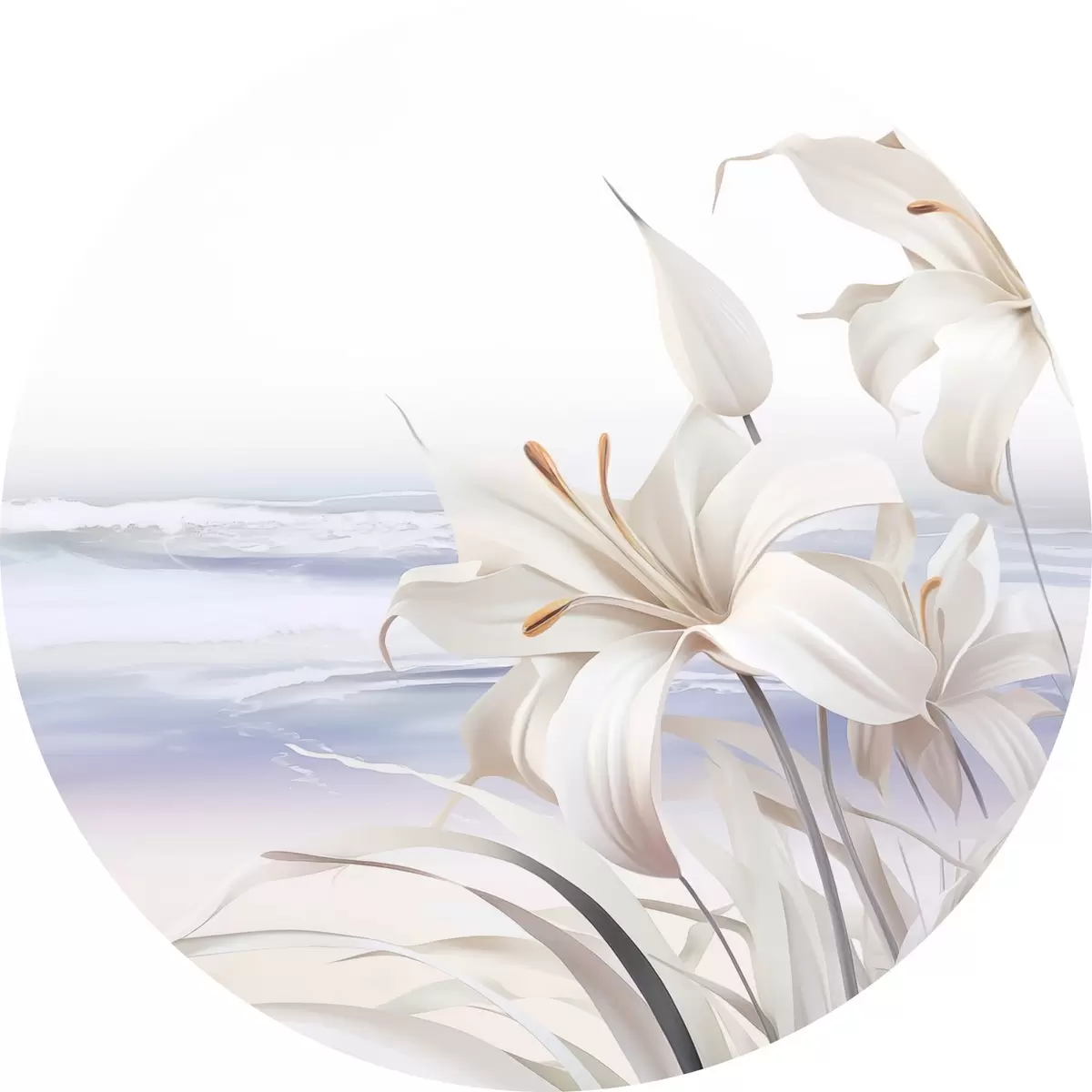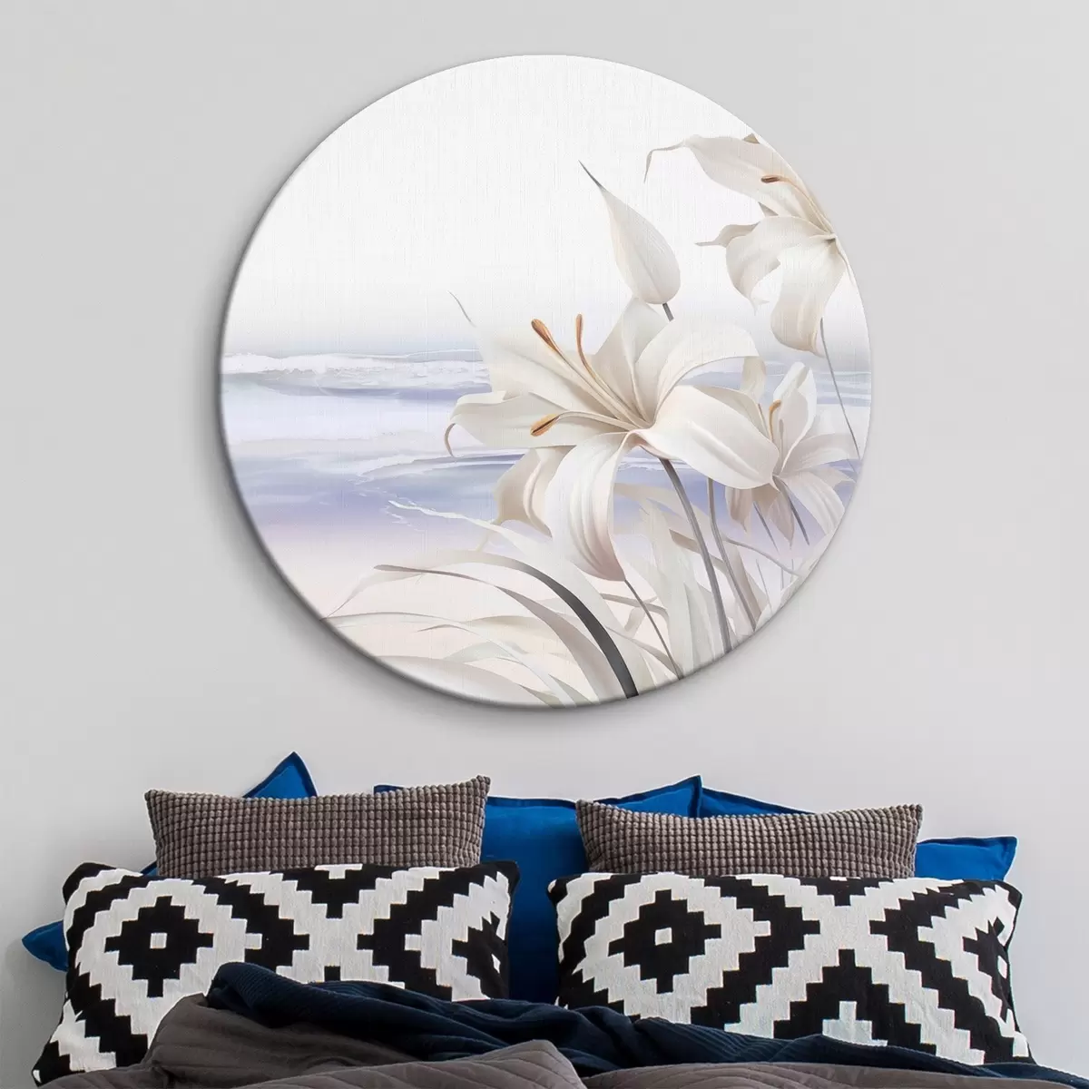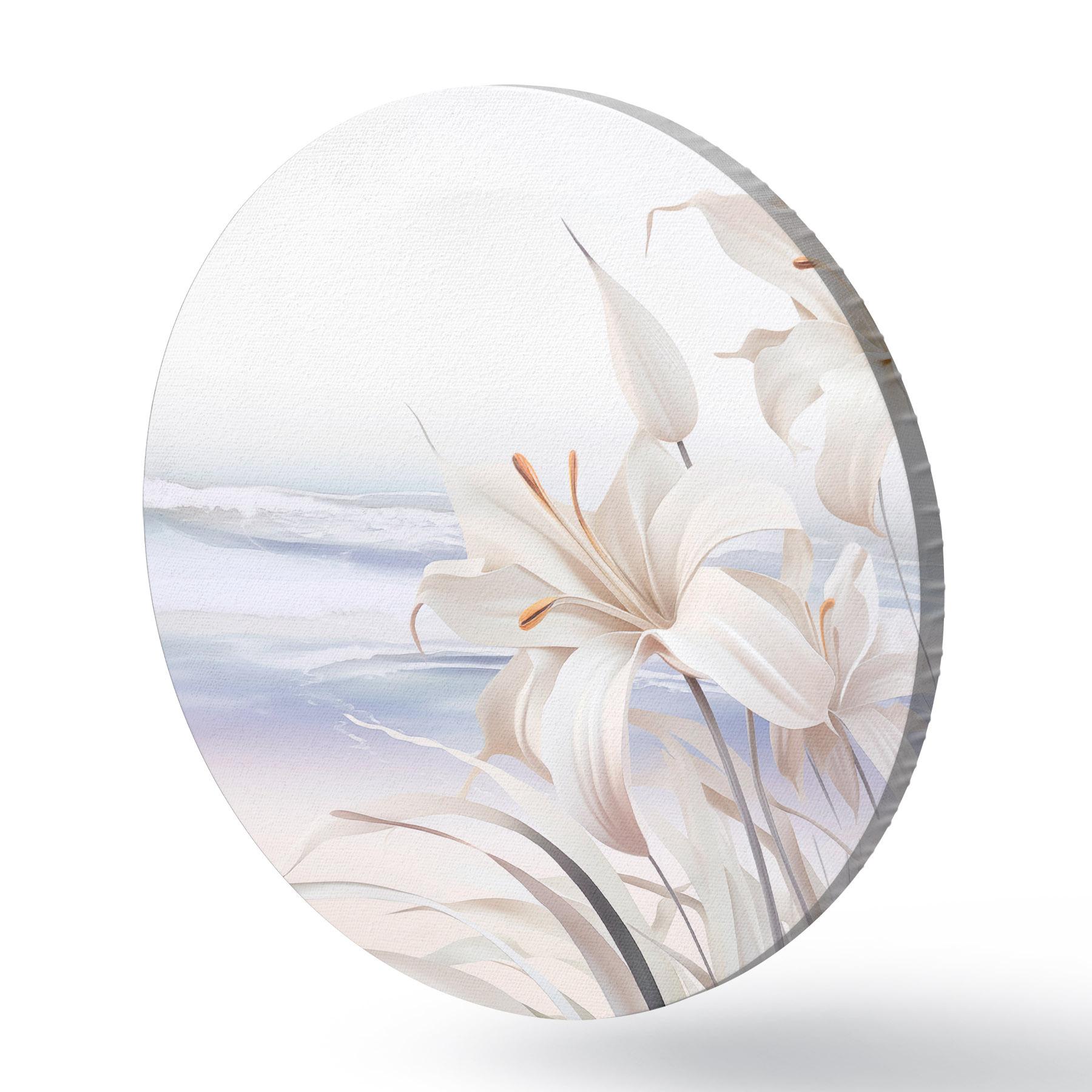 Runde Gemälde Weiße Lilien mit orangefarbenen Blütenstempeln und langen Blättern an einem Strand mit sanften Wellen im Hintergrund, Pastellfarben r44850