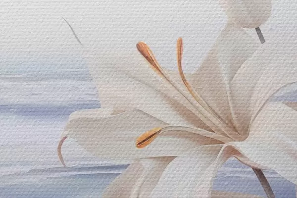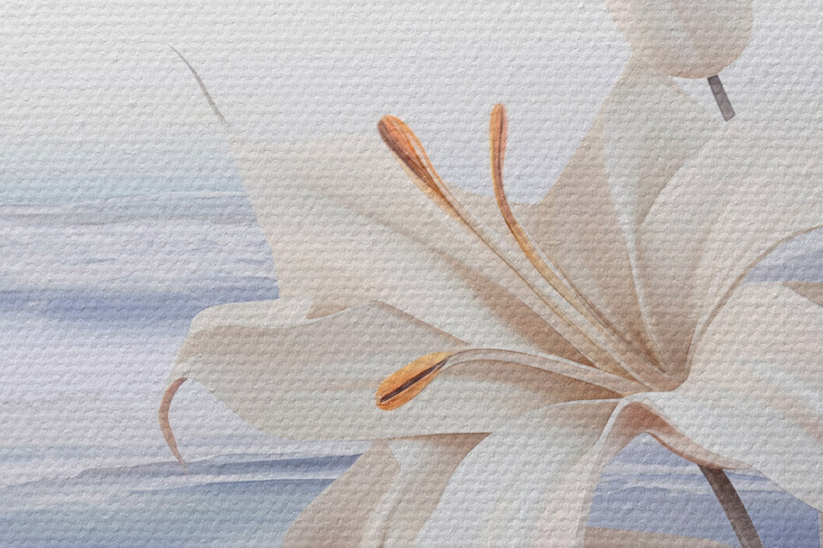 Bild Weiße Lilien mit orangefarbenen Blütenstempeln und langen Blättern an einem Strand mit sanften Wellen im Hintergrund, Pastellfarben Nr r44850
