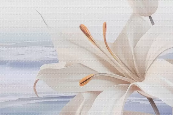 Bild Weiße Lilien mit orangefarbenen Blütenstempeln und langen Blättern an einem Strand mit sanften Wellen im Hintergrund, Pastellfarben Nr r44850