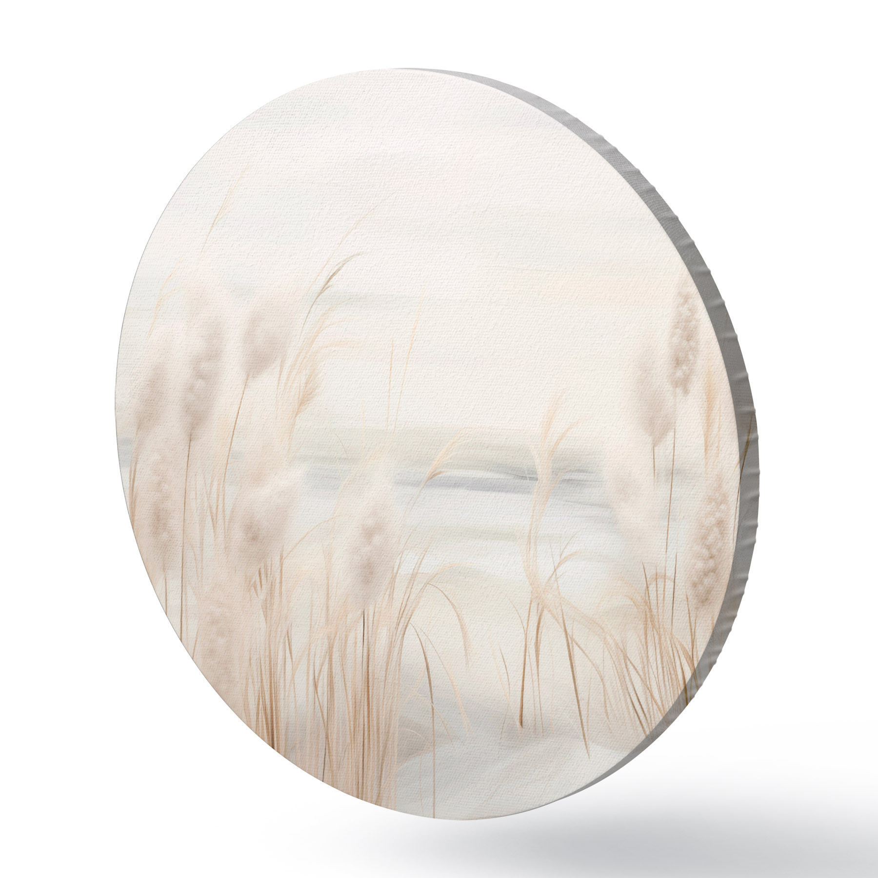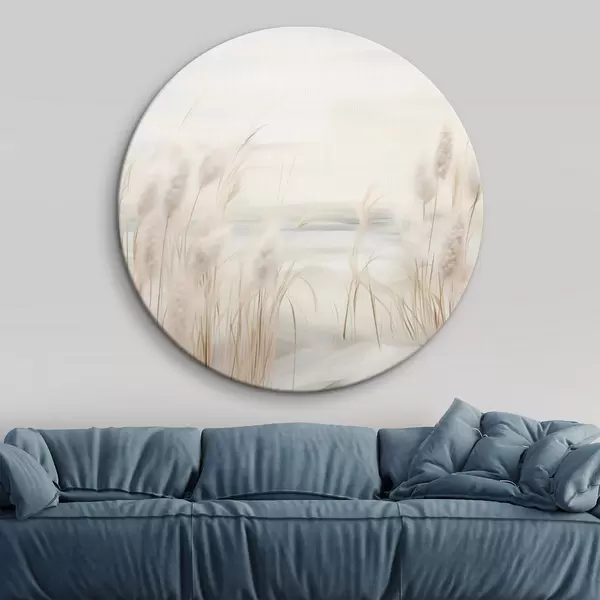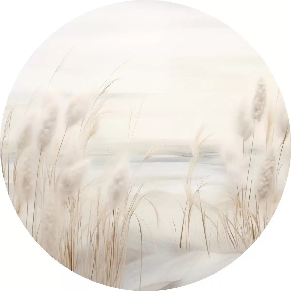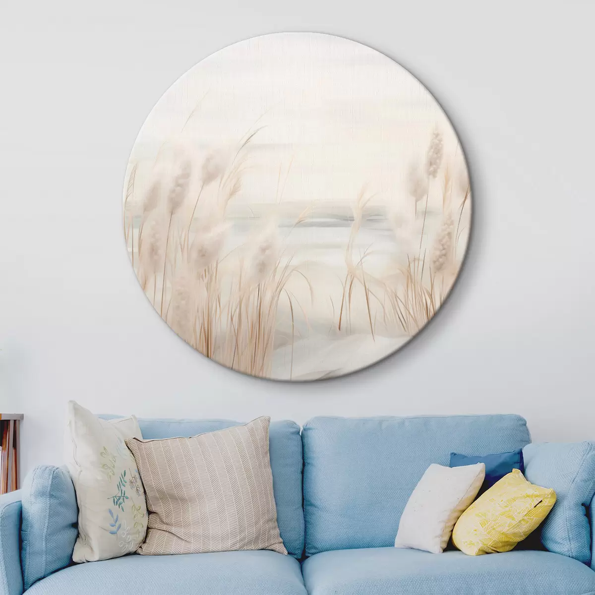 Runde Gemälde Beigefarbenes Schilf im Vordergrund, mit Samenköpfen, weich und zart, ein verschwommener Hintergrund und ein heller Himmel r44851
