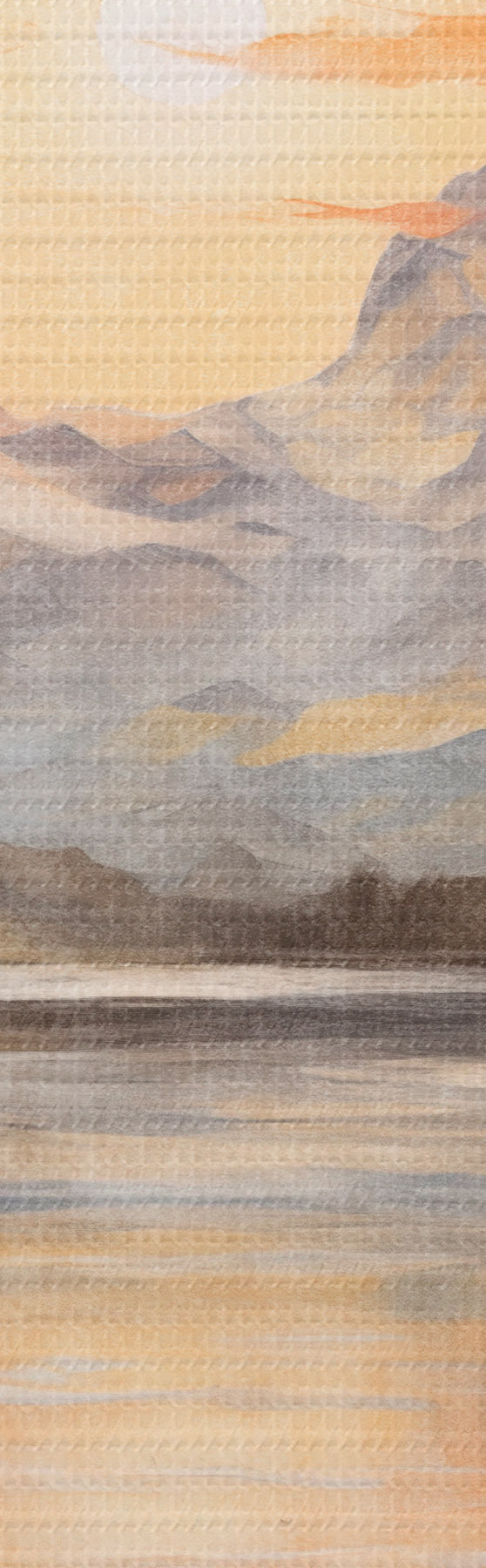 Runde Gemälde Landschaft mit einem See, umgeben von Bäumen und Bergen im Hintergrund, orangefarbener Himmel mit Sonne r44857