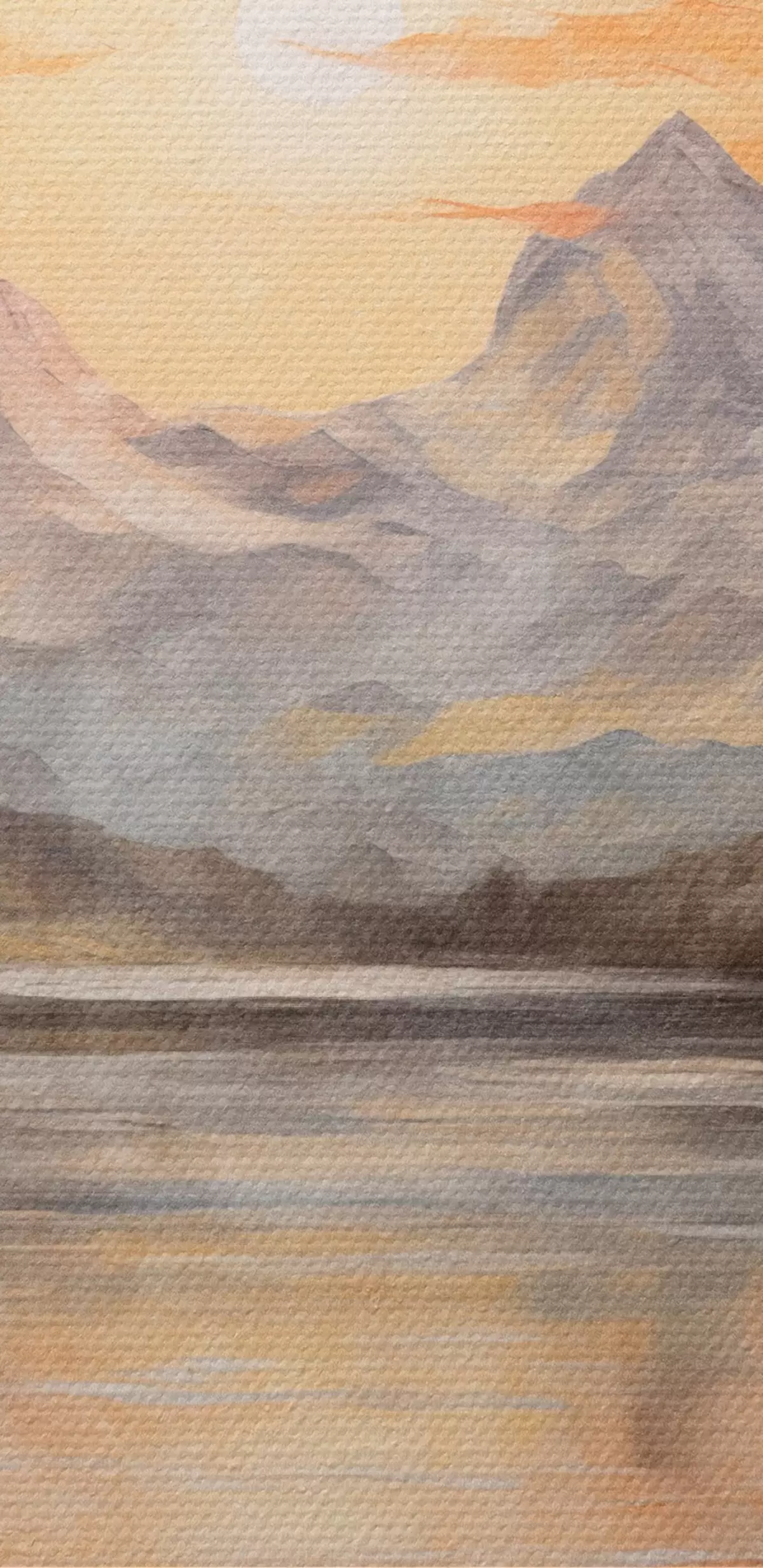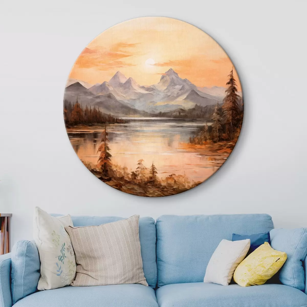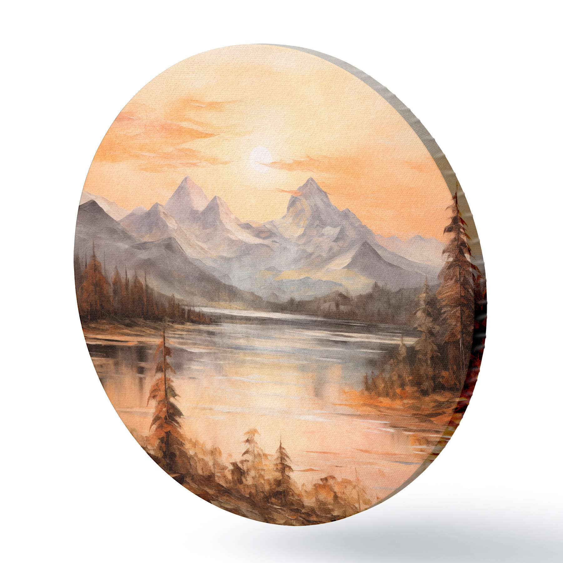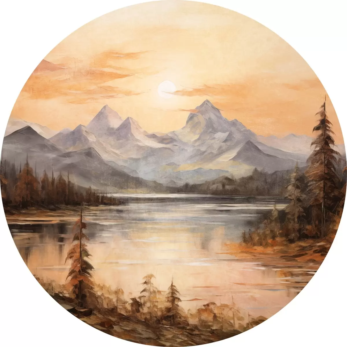 Runde Gemälde Landschaft mit einem See, umgeben von Bäumen und Bergen im Hintergrund, orangefarbener Himmel mit Sonne r44857