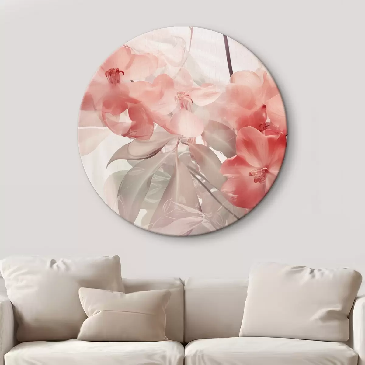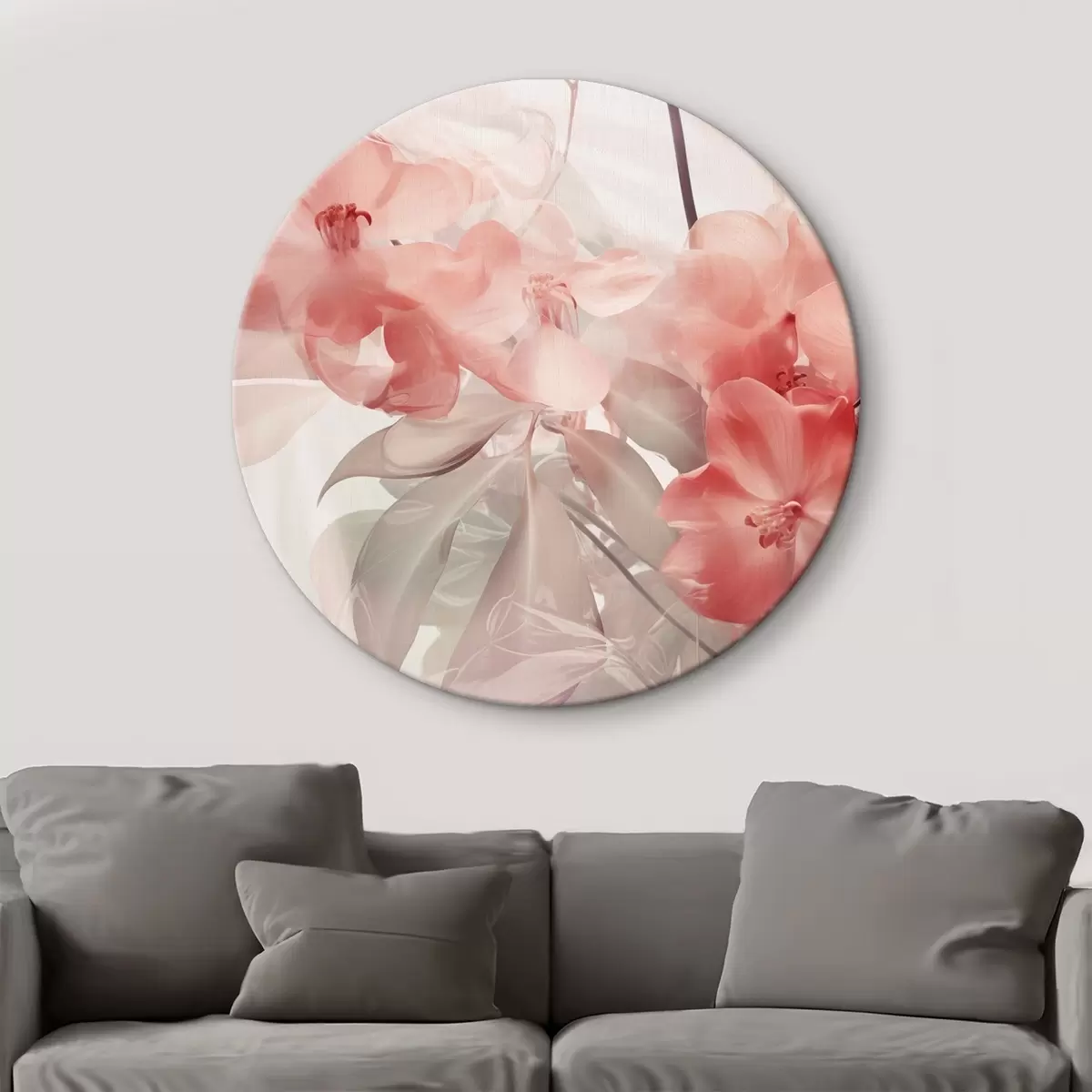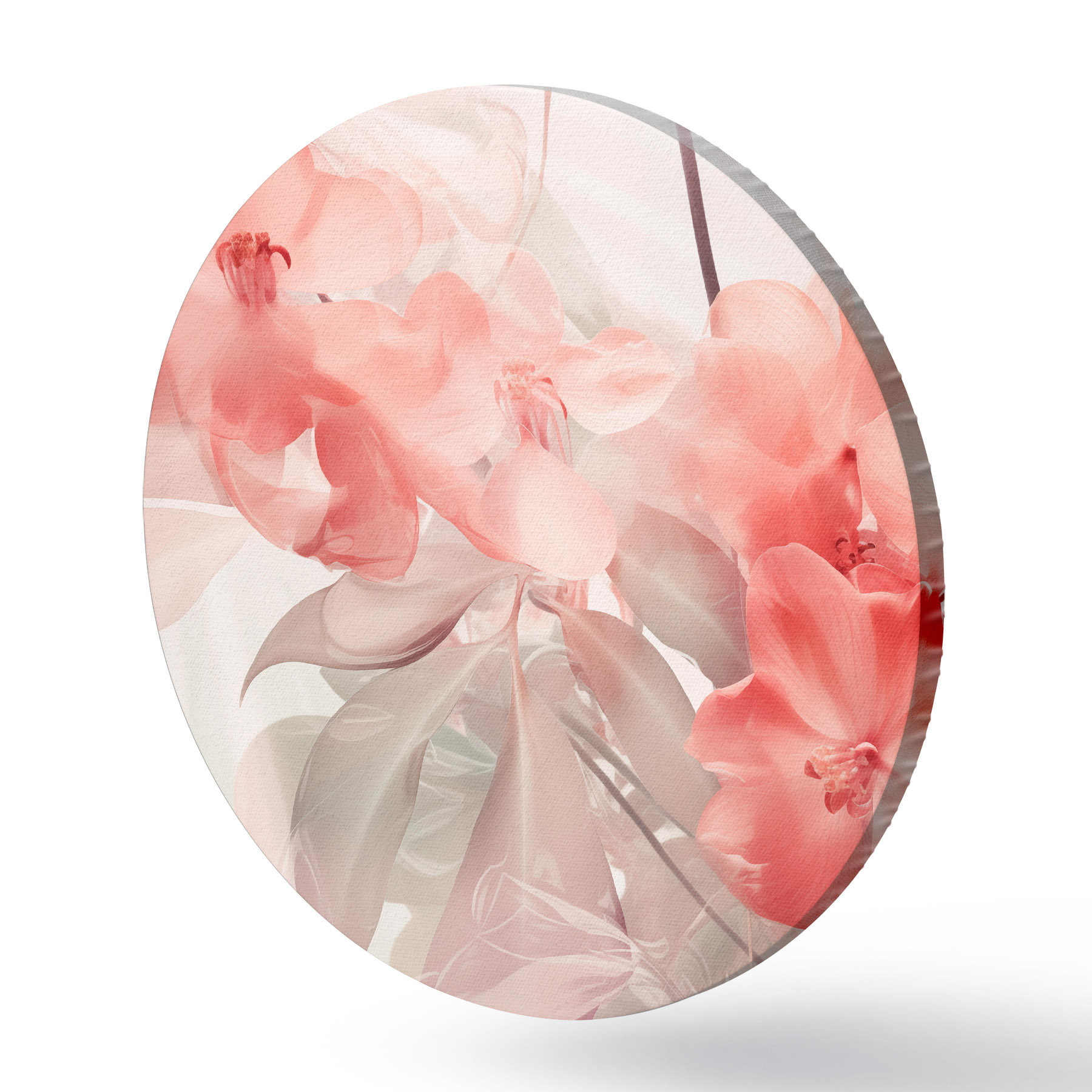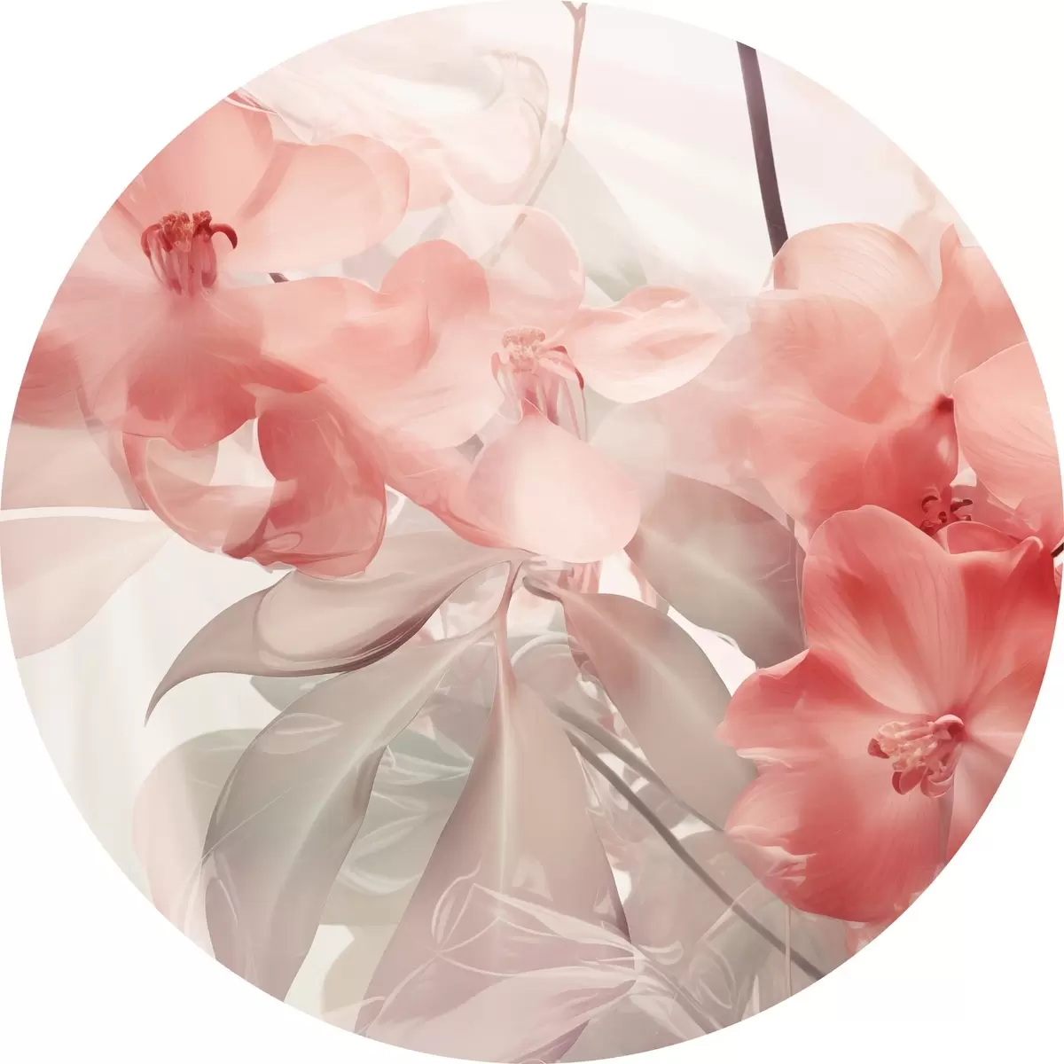 Runde Gemälde Leuchtend rosa tropische Blüten mit zarten, gedämpften grünen Blättern, die eine traumhaft zarte Textur ergeben r44861