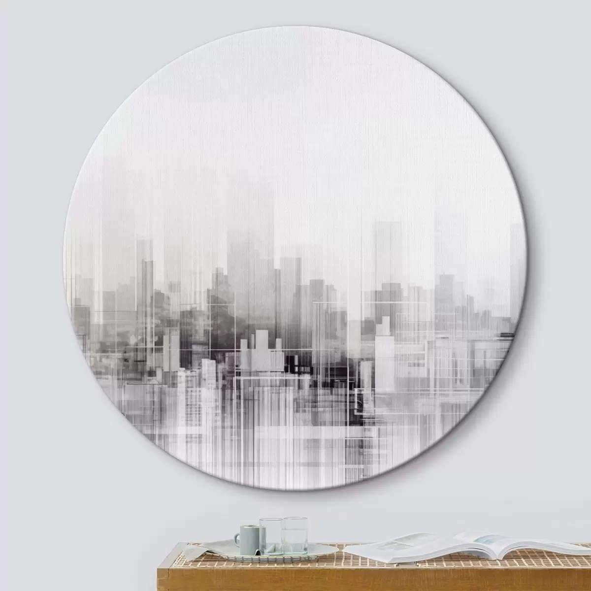 Runde Gemälde Texturierte minimalistische Stadtlandschaft mit hohen Gebäuden und Wolkenkratzern, die sich gegen einen weißen Himmel abheben r44863
