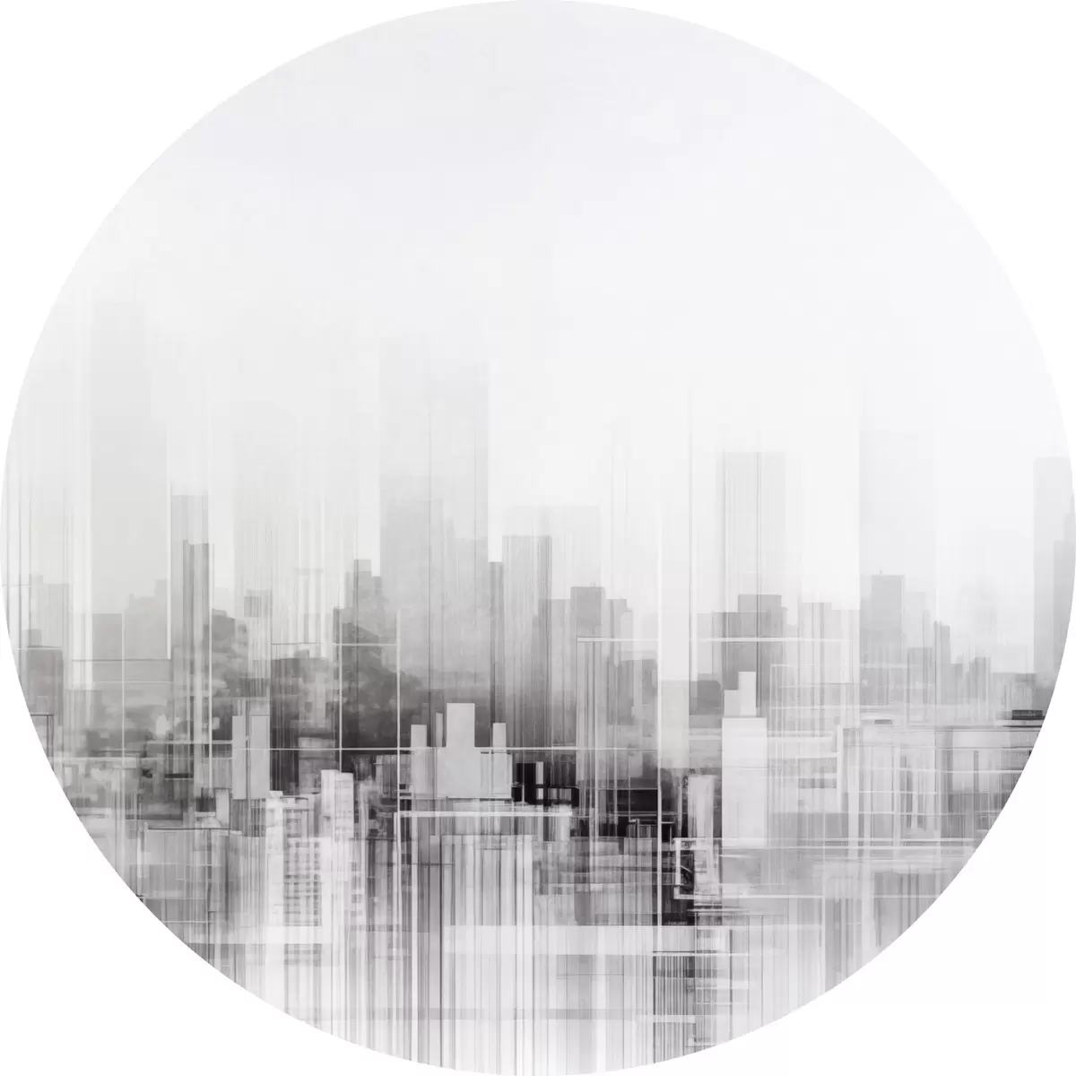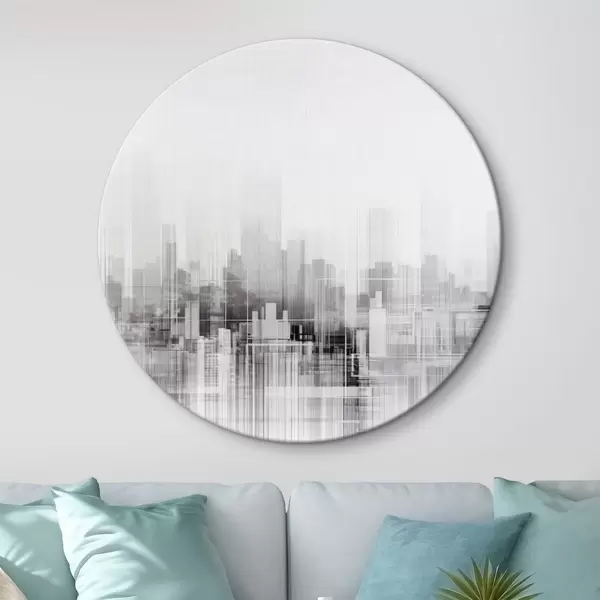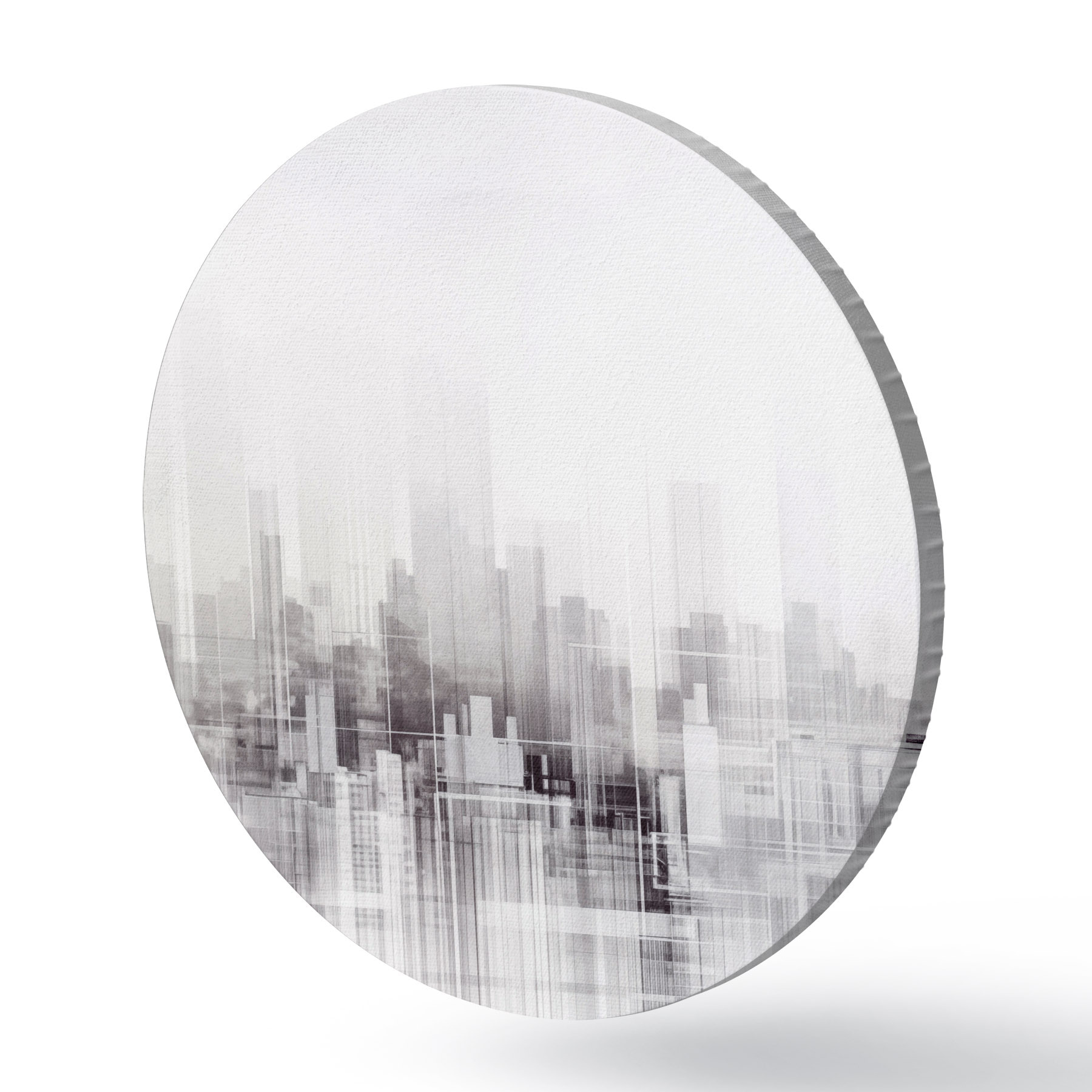 Runde Gemälde Texturierte minimalistische Stadtlandschaft mit hohen Gebäuden und Wolkenkratzern, die sich gegen einen weißen Himmel abheben r44863