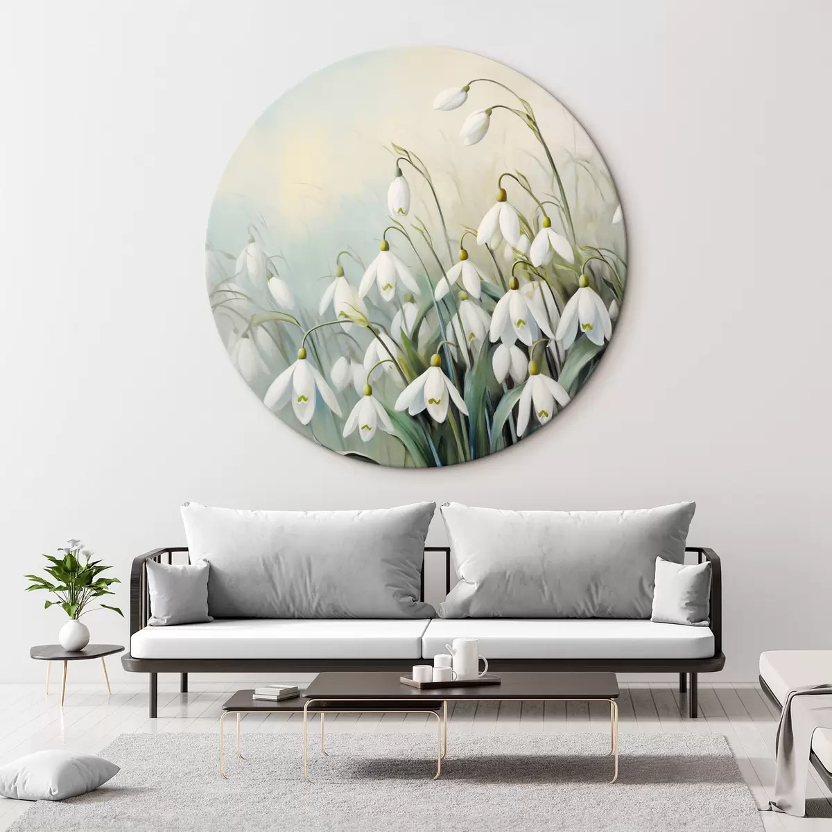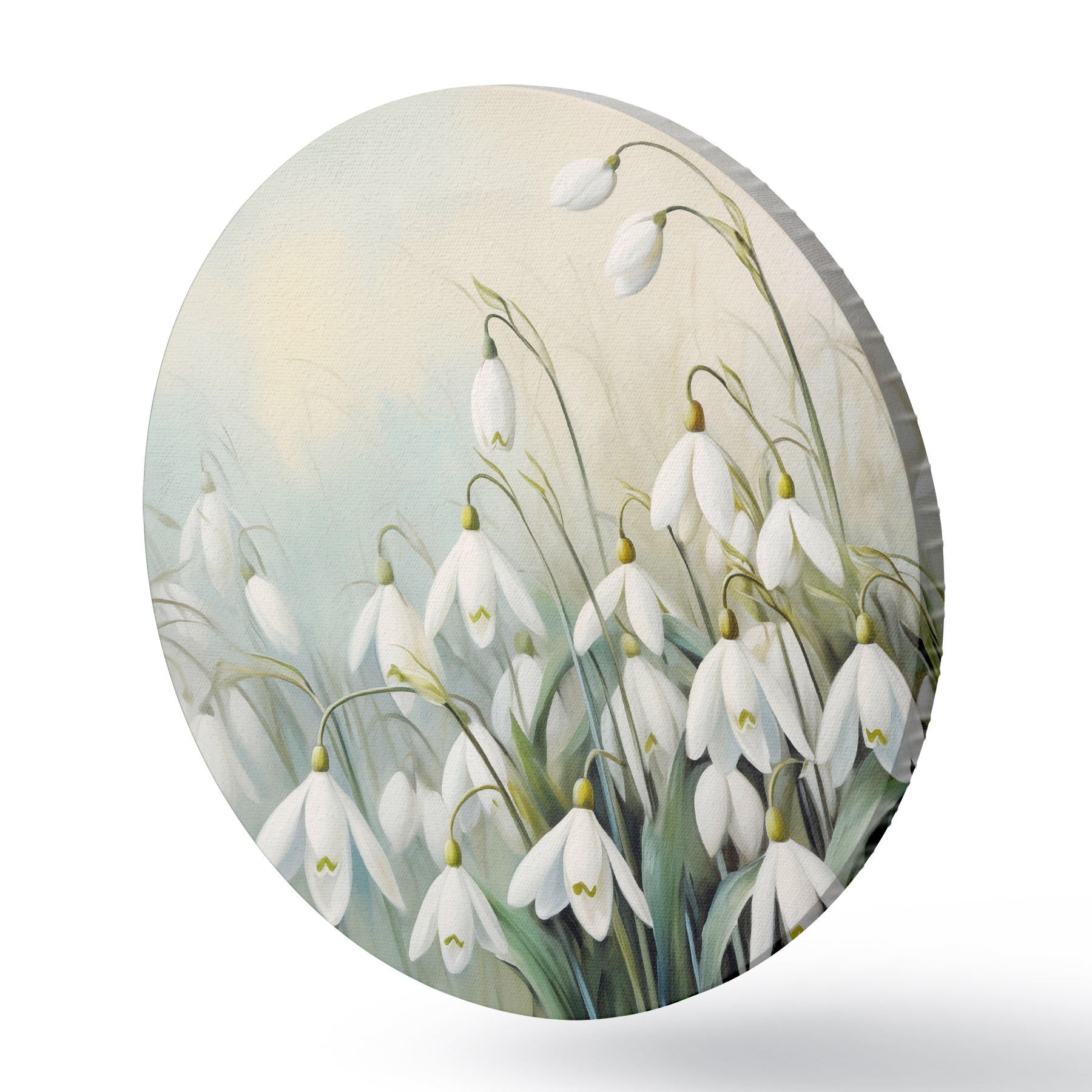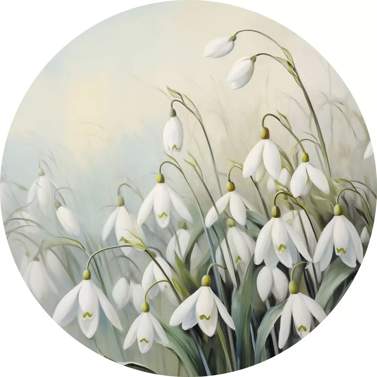 Runde Gemälde Weiße Schneeglöckchenblüten mit blauen und grünen Stängeln und Blättern, weiche Pinselstriche, unscharfer Hintergrund r44864