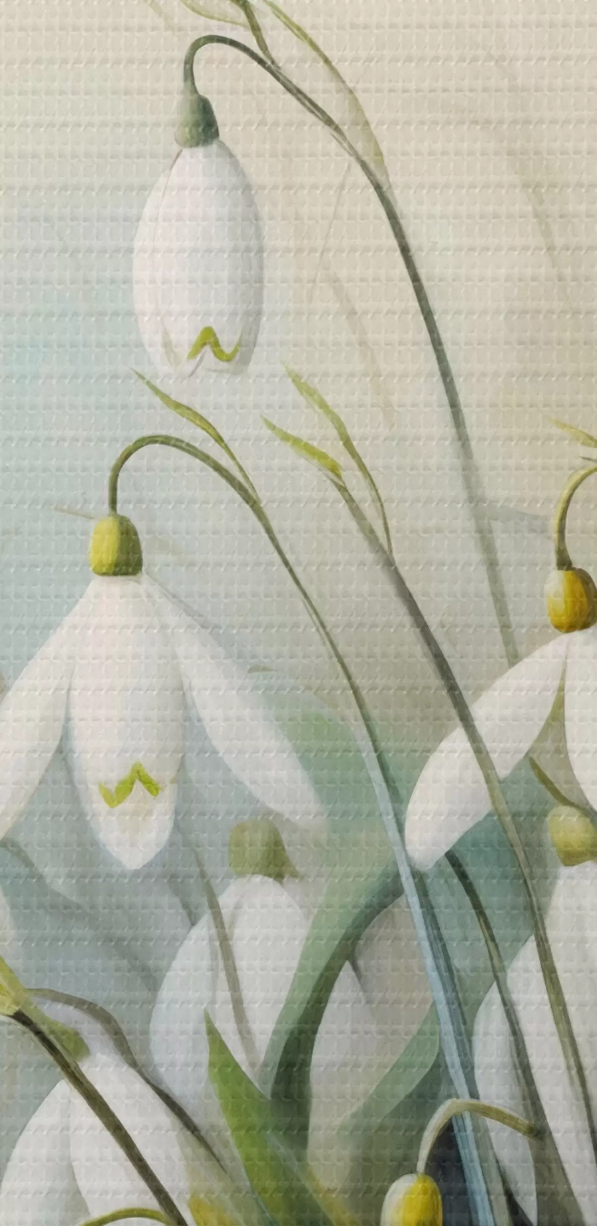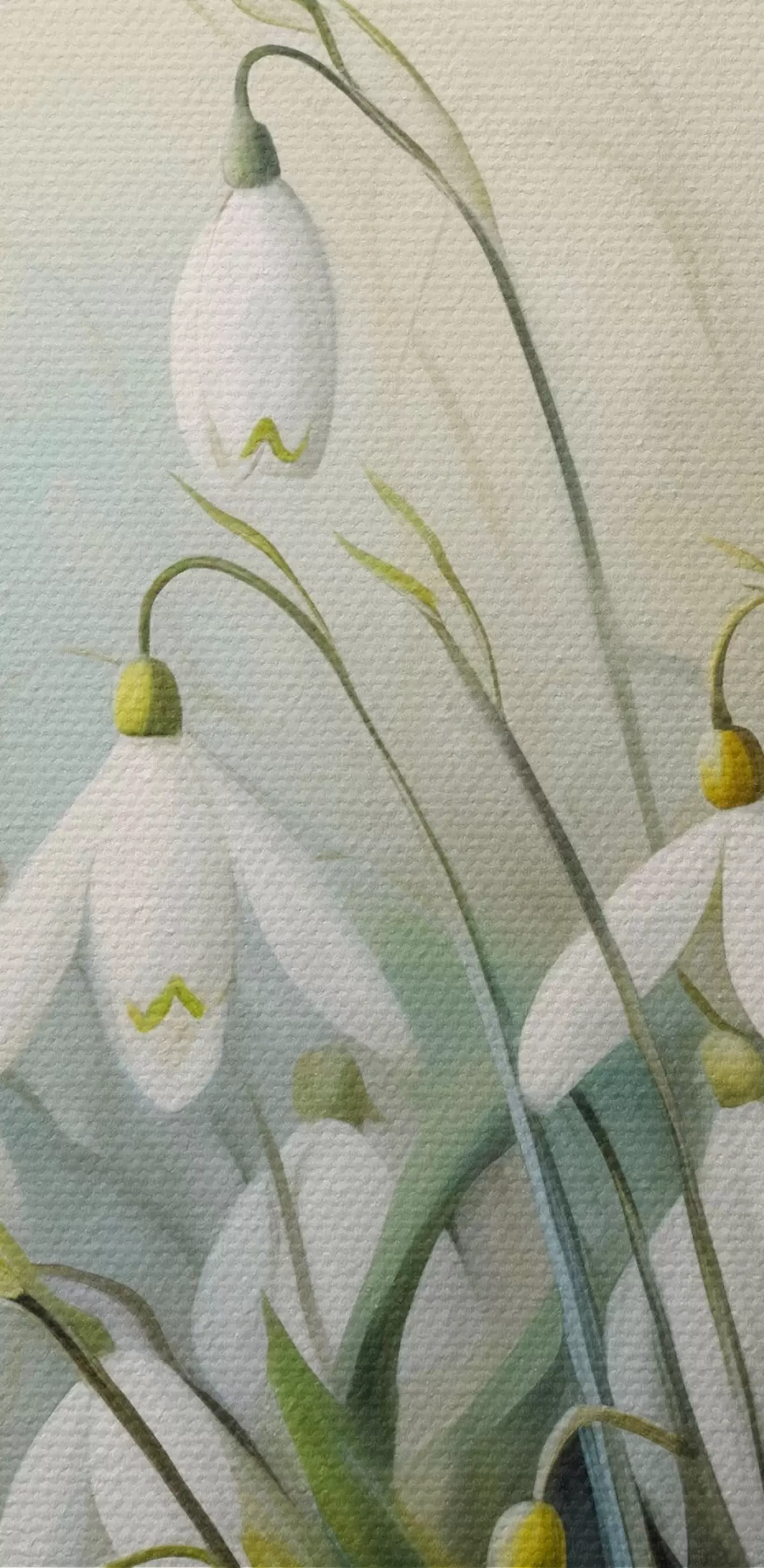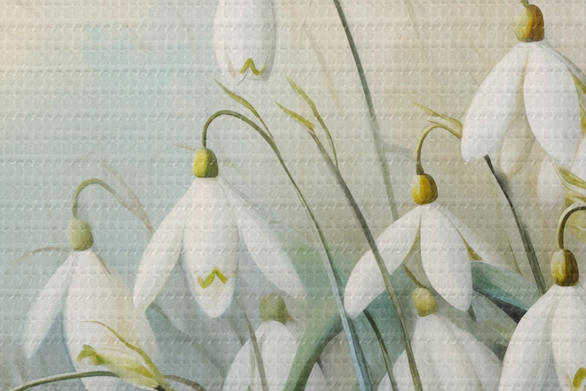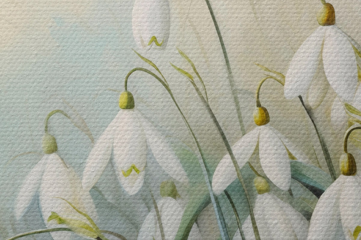 Bild Weiße Schneeglöckchenblüten mit blauen und grünen Stängeln und Blättern, weiche Pinselstriche, unscharfer Hintergrund Nr r44864