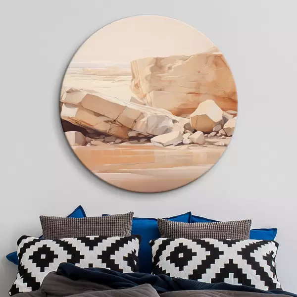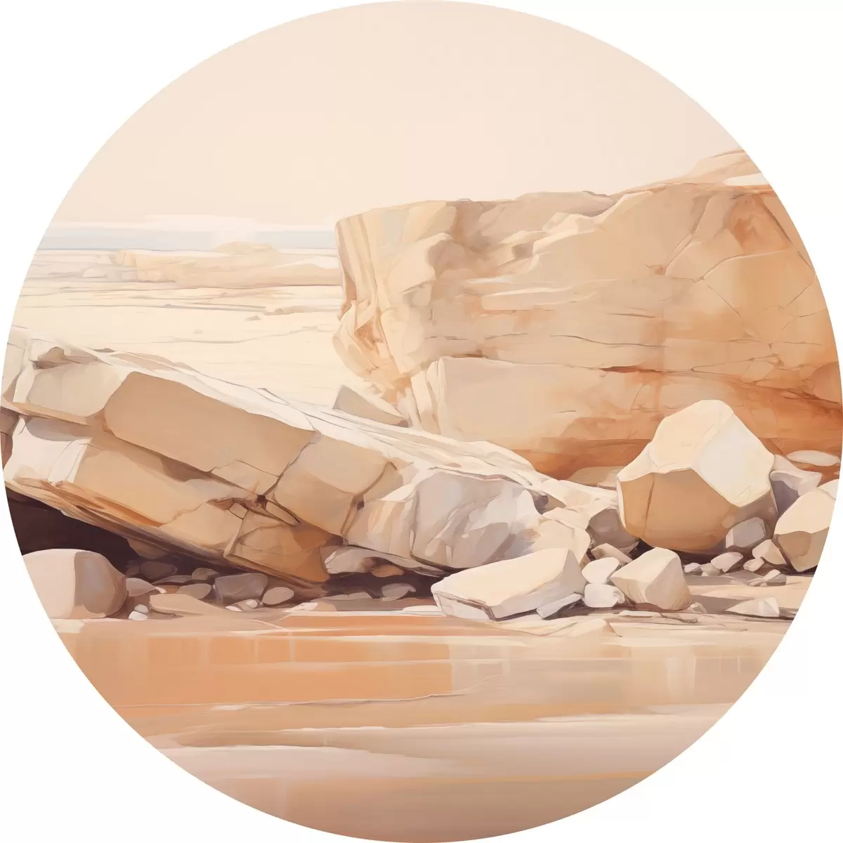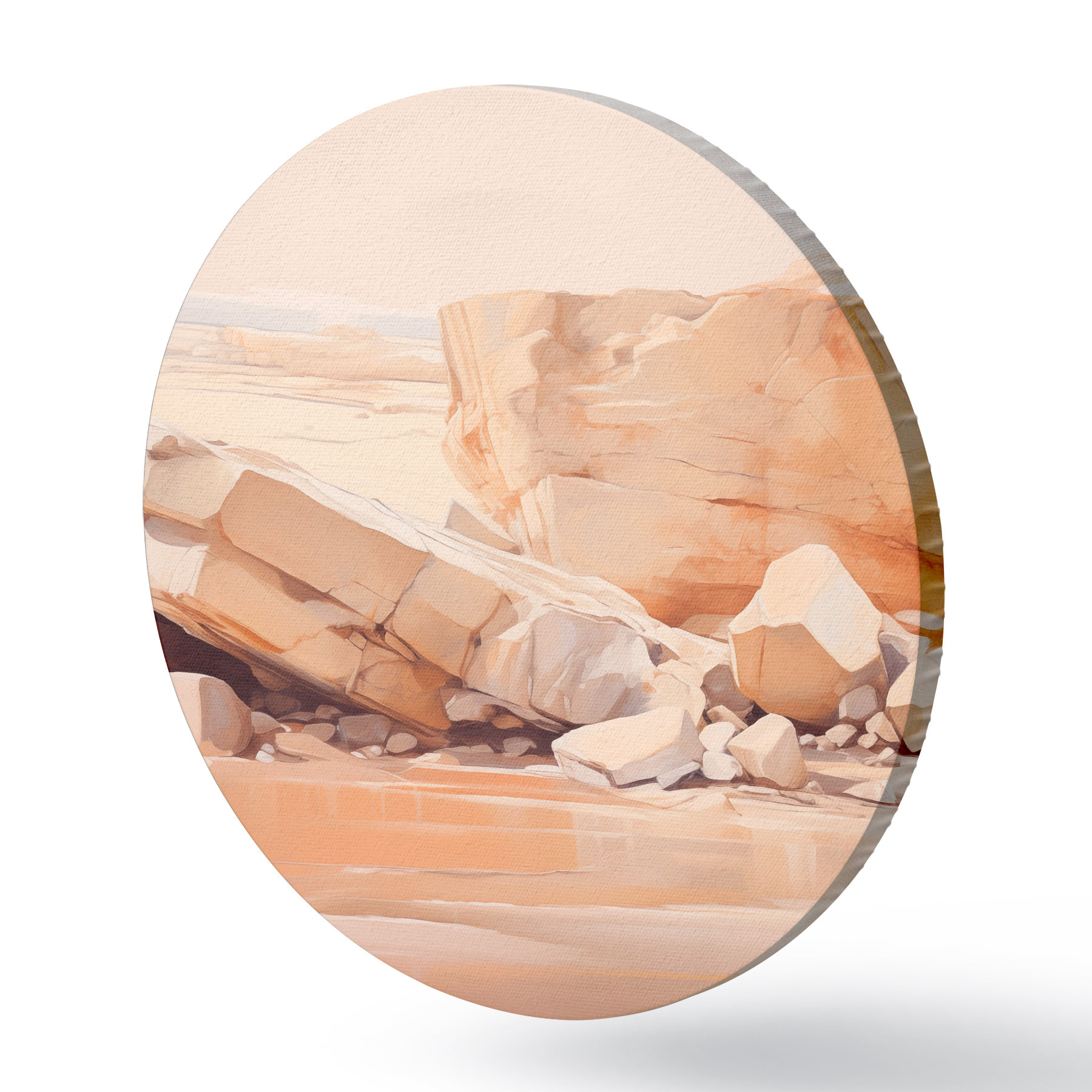 Runde Gemälde Minimalistische felsige Strandlandschaft mit großen hellbraunen Felsblöcken und klarem Wasser r44865