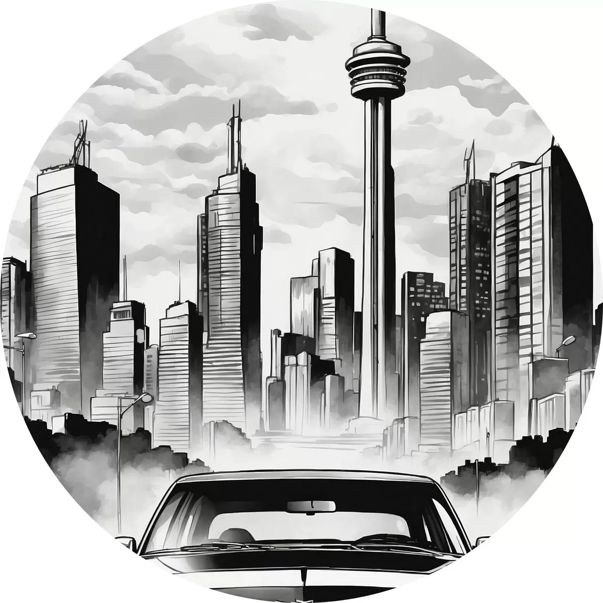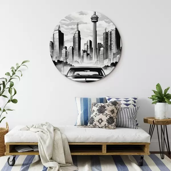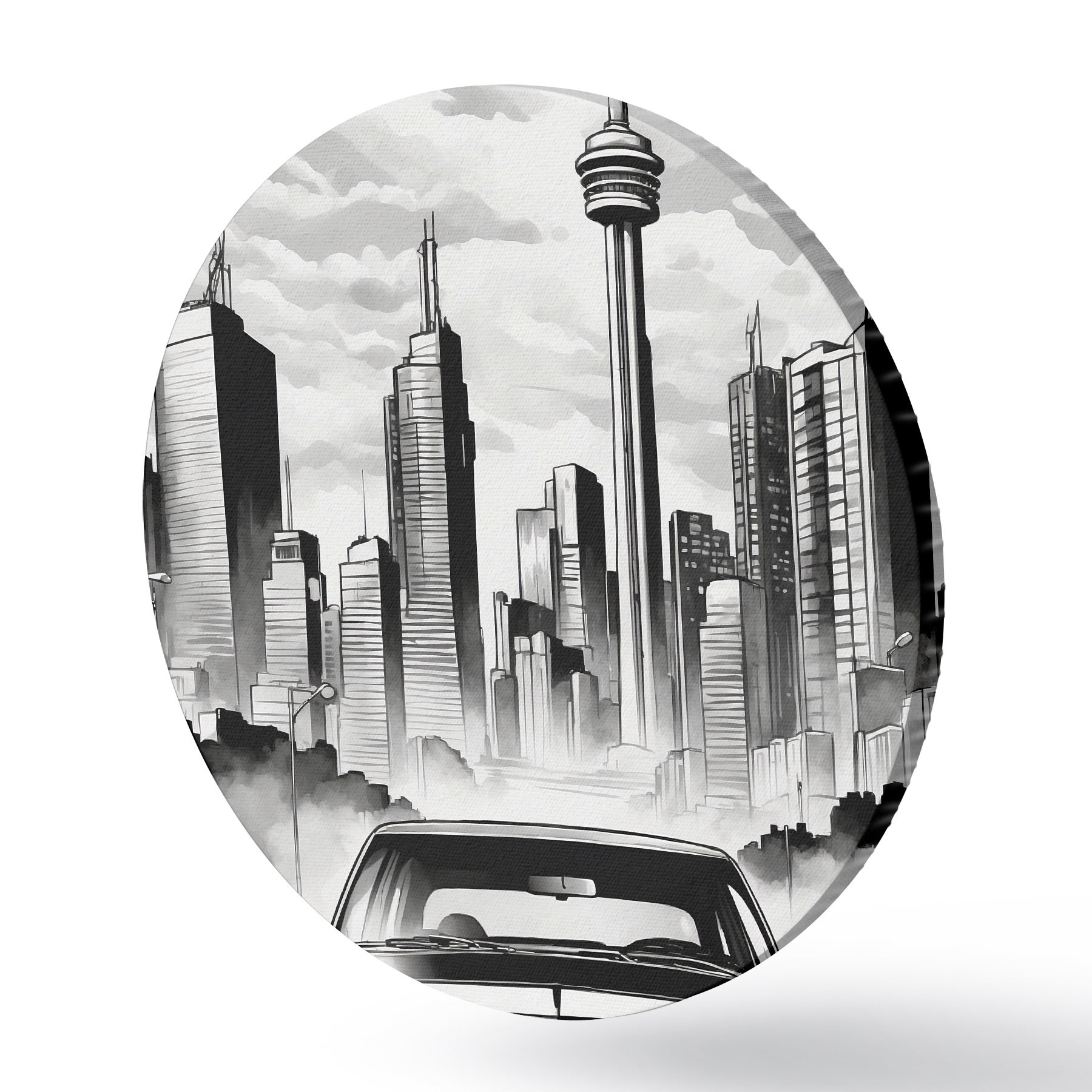 Runde Gemälde Retro-Auto auf dem Hintergrund der monochromen Stadt mit Wolkenkratzern r44871