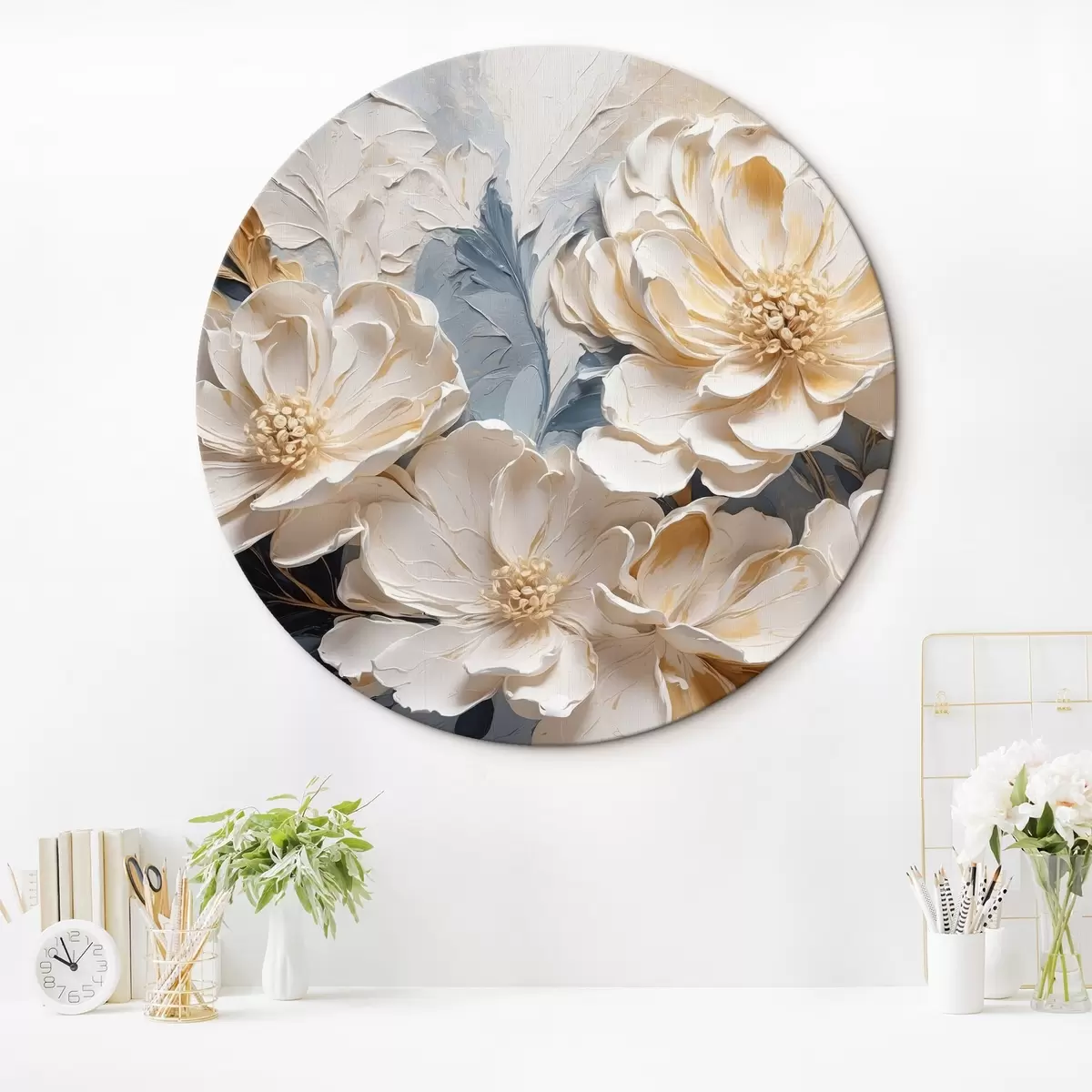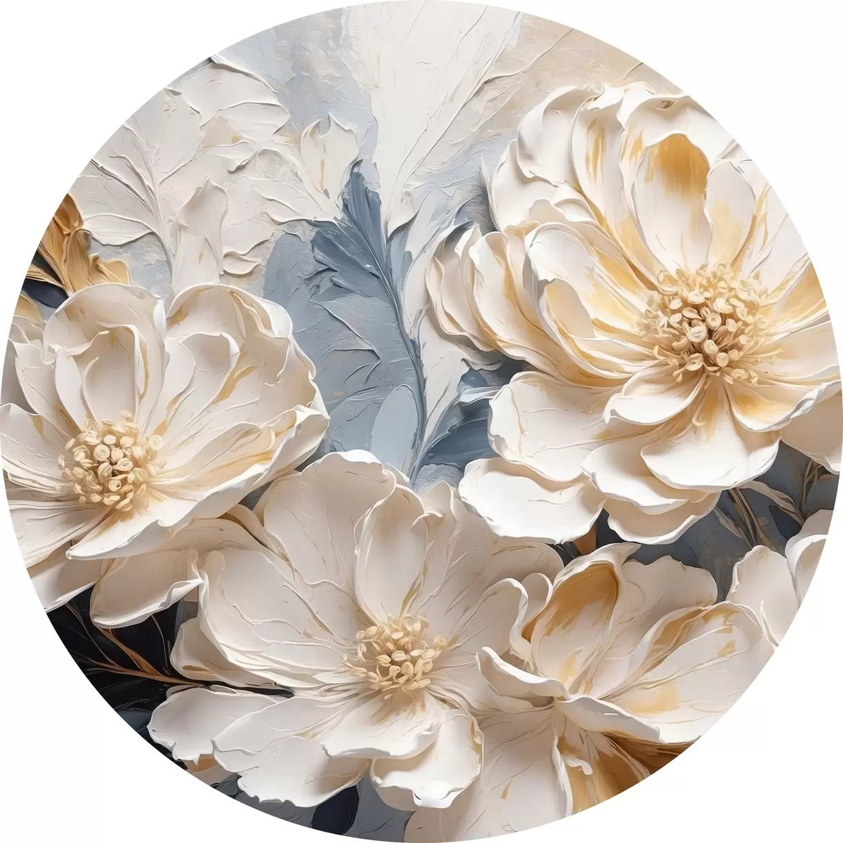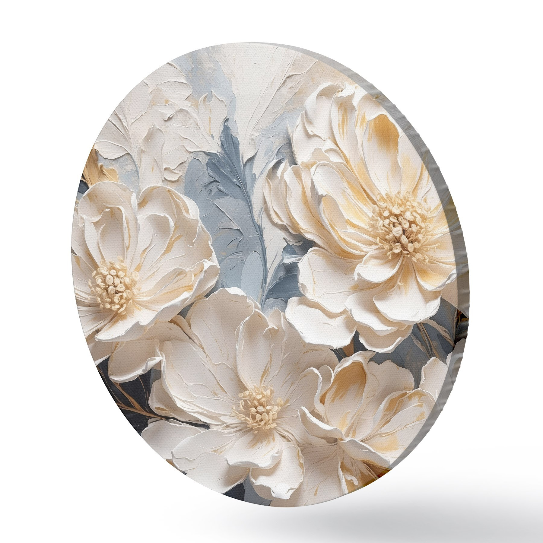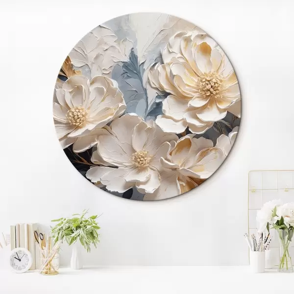 Runde Gemälde Volumetrische cremefarbene Pfingstrosen auf einem hellblauen Hintergrund r44880