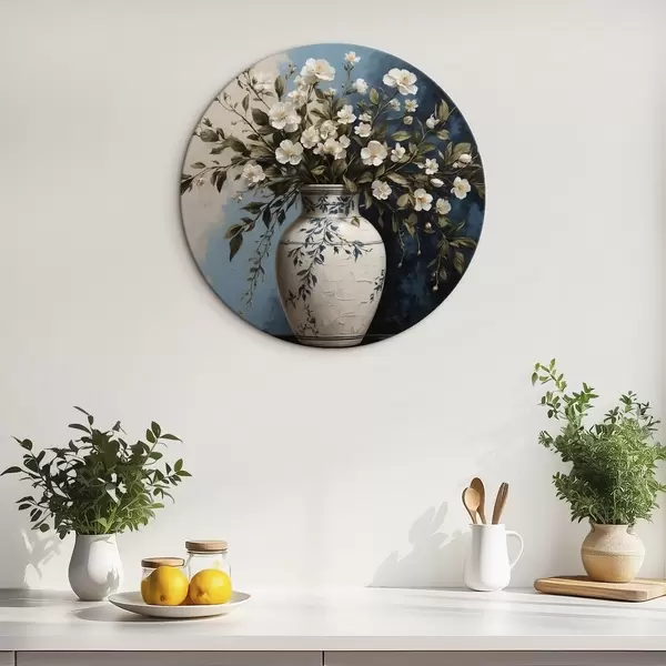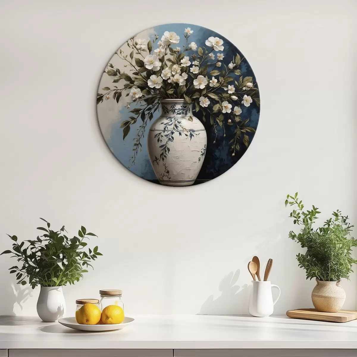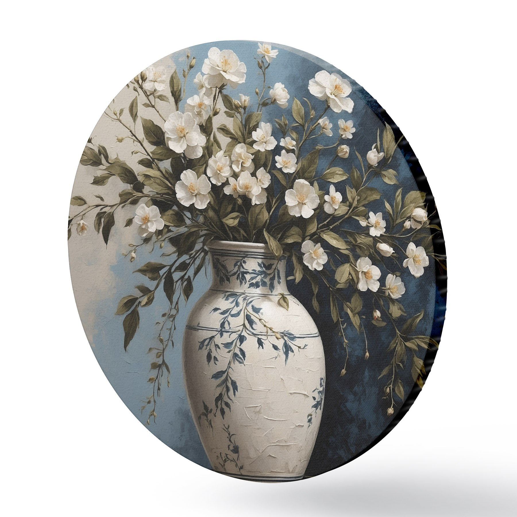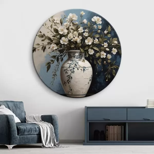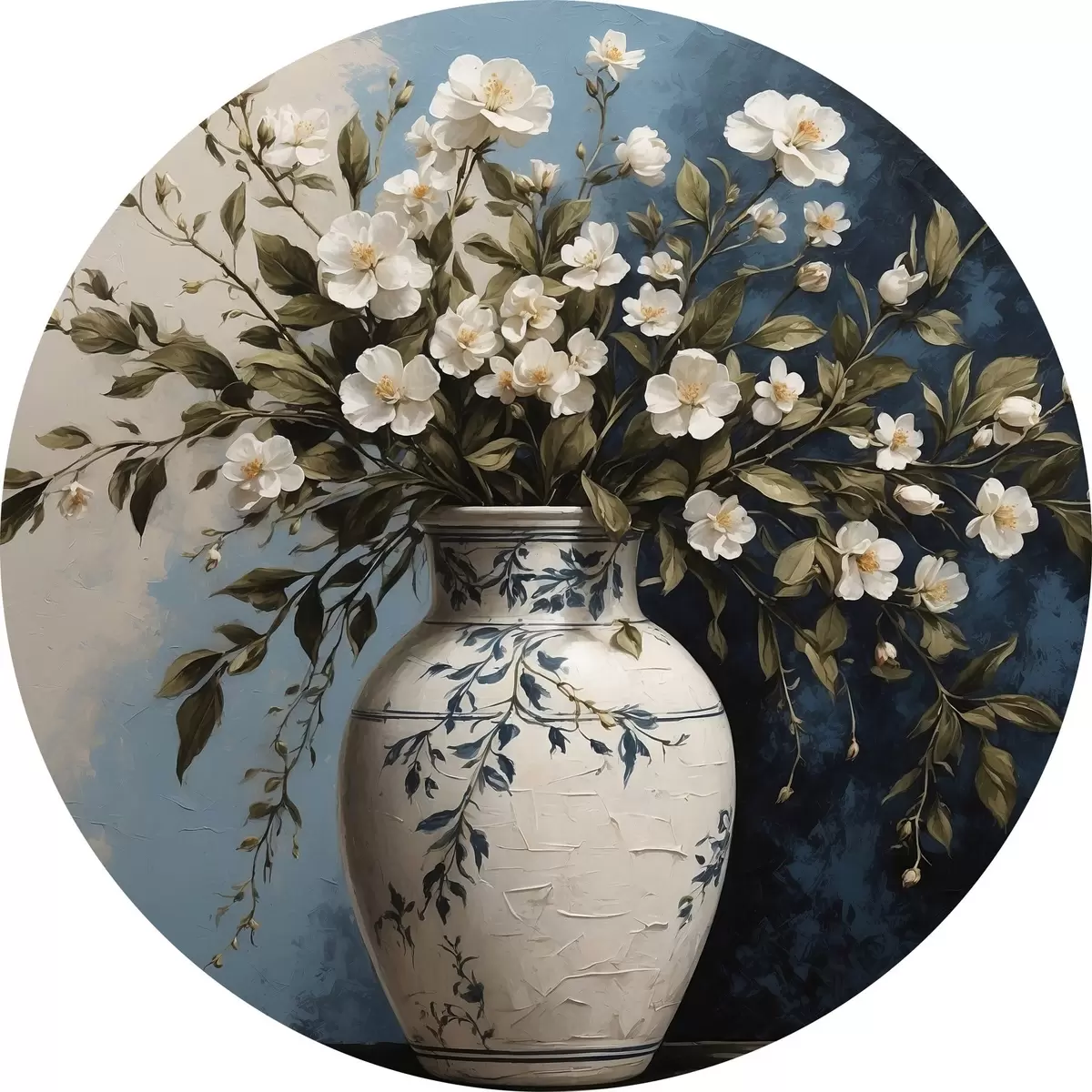 Runde Gemälde Weiße und gelbe Blumen in einer großen Vase auf blauem Hintergrund r44893