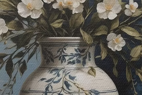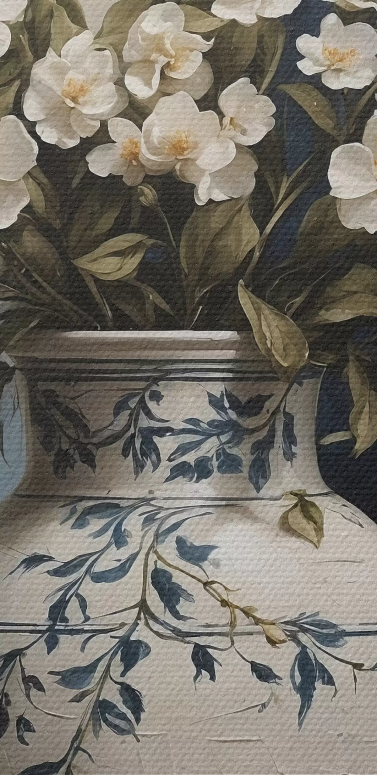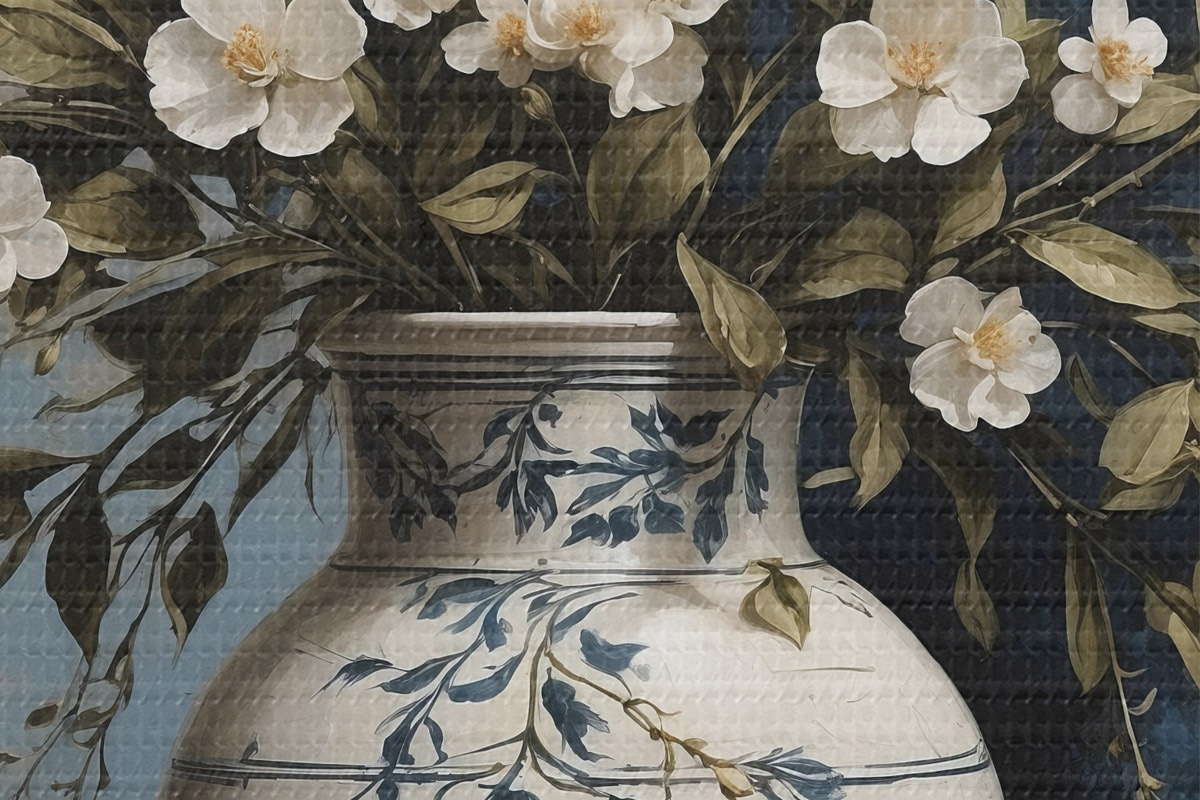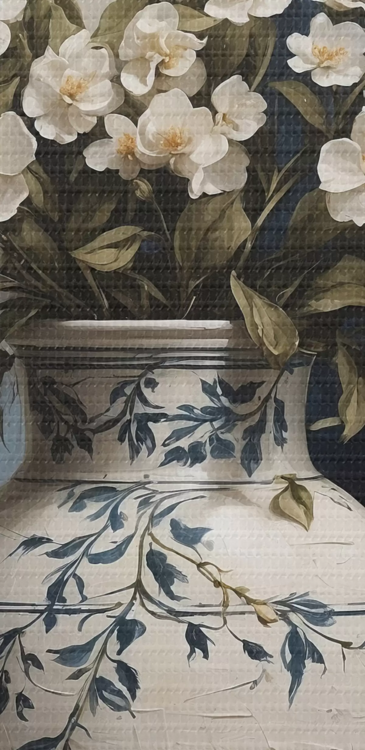Bild Weiße und gelbe Blumen in einer großen Vase auf blauem Hintergrund Nr r44893