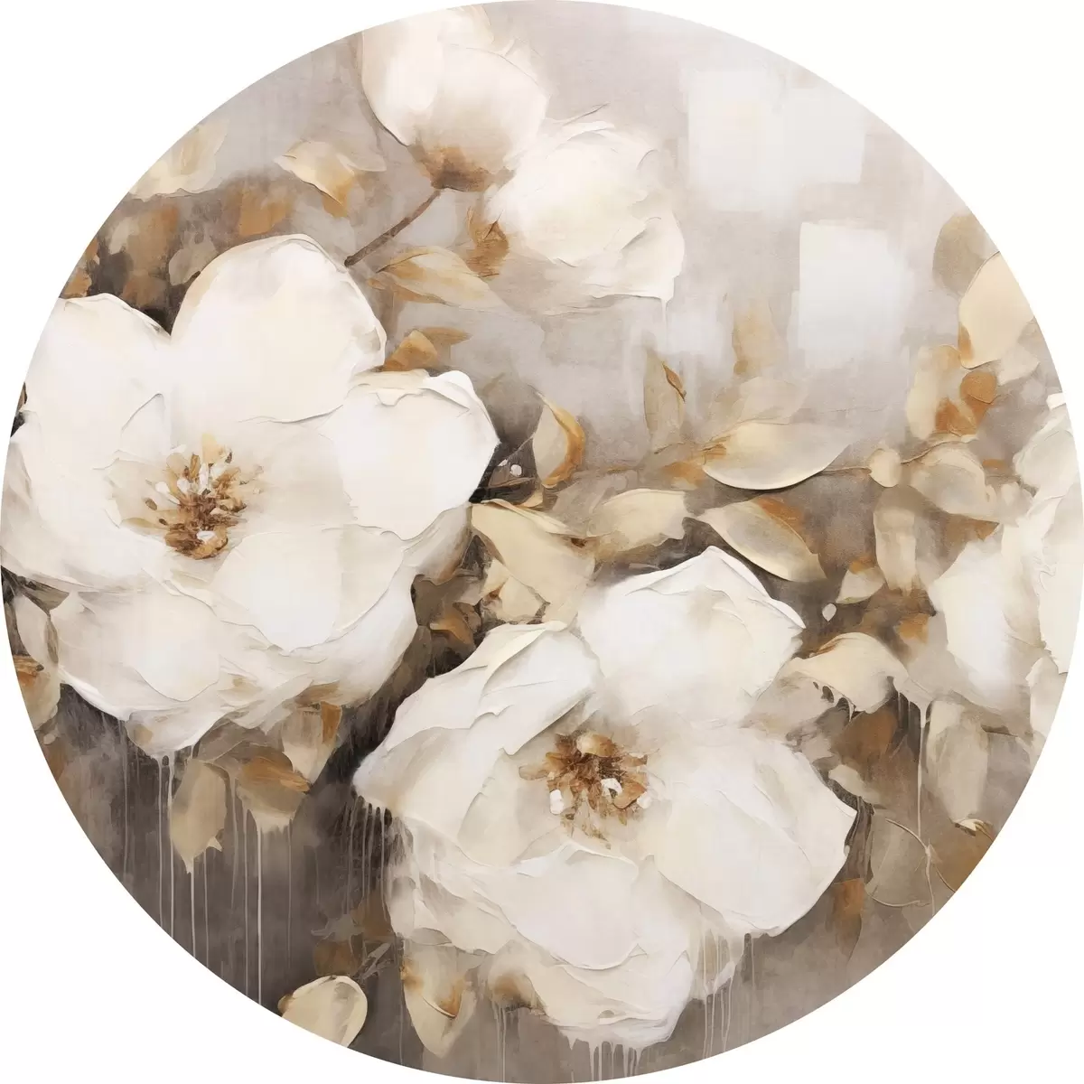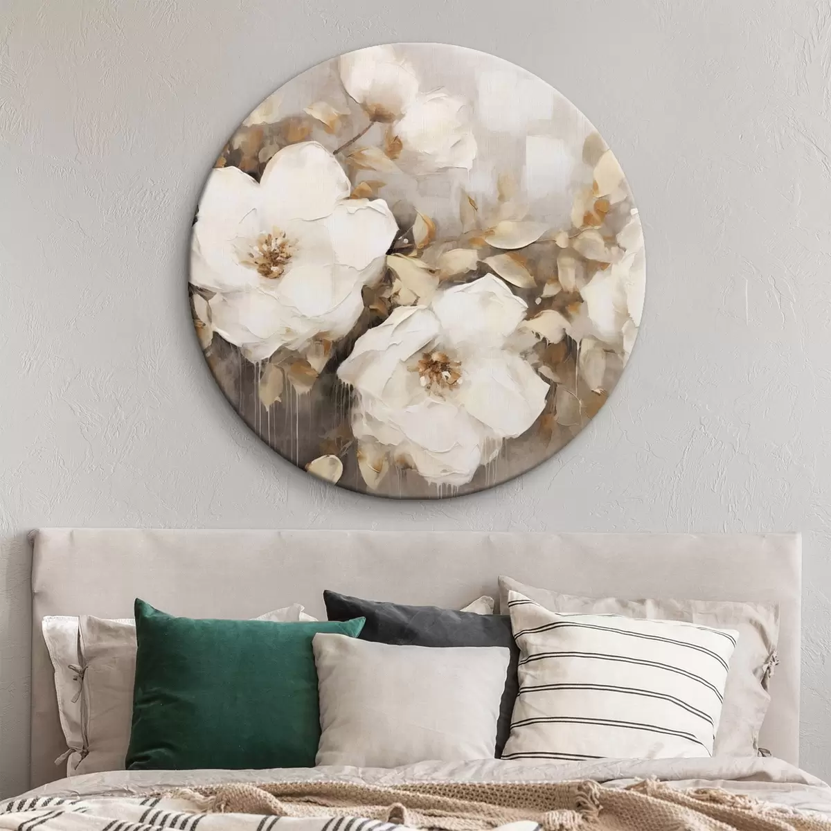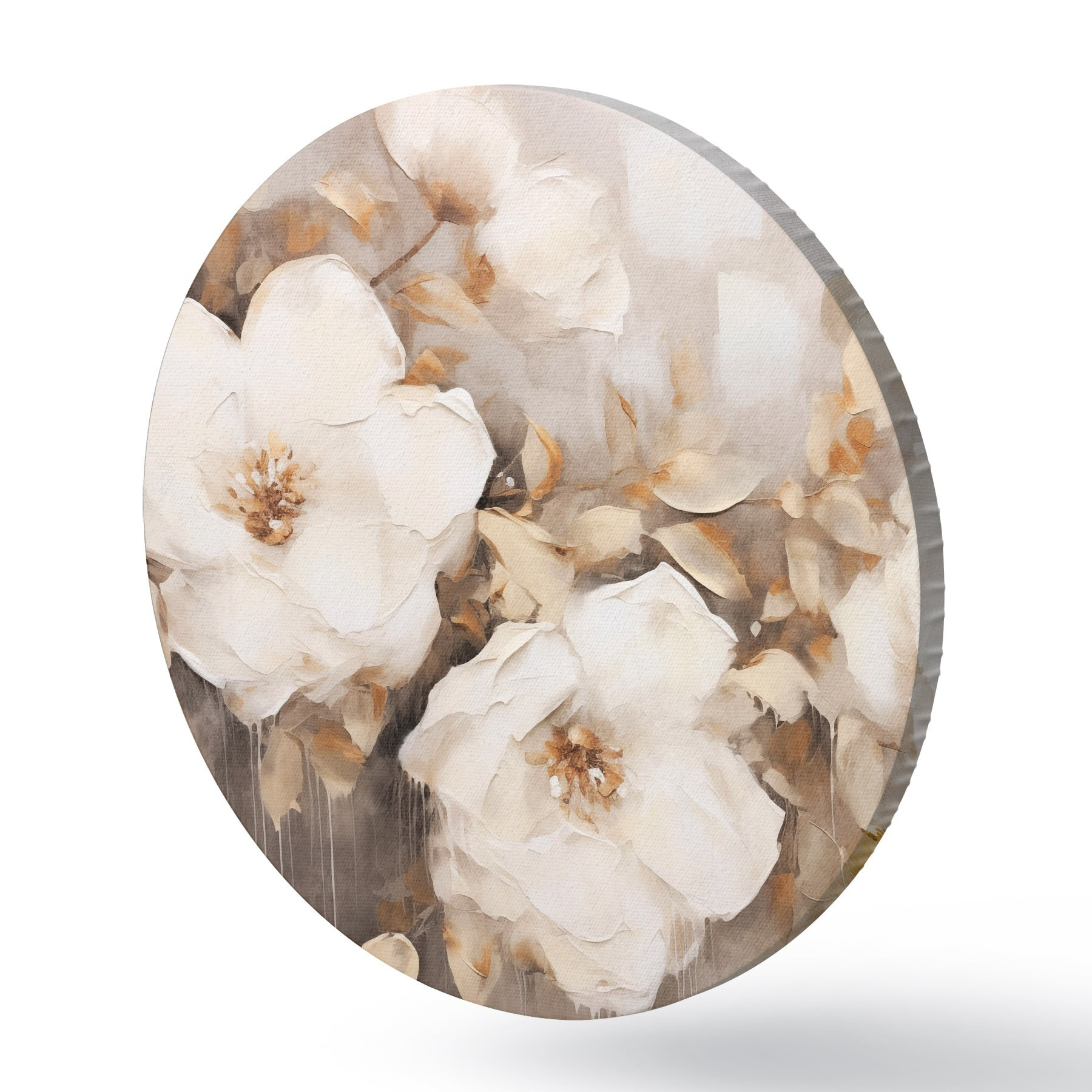 Runde Gemälde Weiße Blumen mit braunen Blättern in einem beigen Hintergrund, Ölgemälde Nachahmung, Blumenarrangement, botanische Kunst r44922