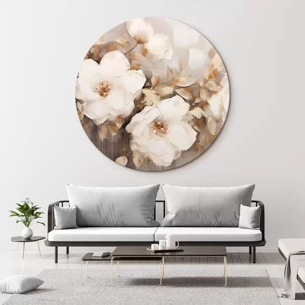 Runde Gemälde Weiße Blumen mit braunen Blättern in einem beigen Hintergrund, Ölgemälde Nachahmung, Blumenarrangement, botanische Kunst r44922