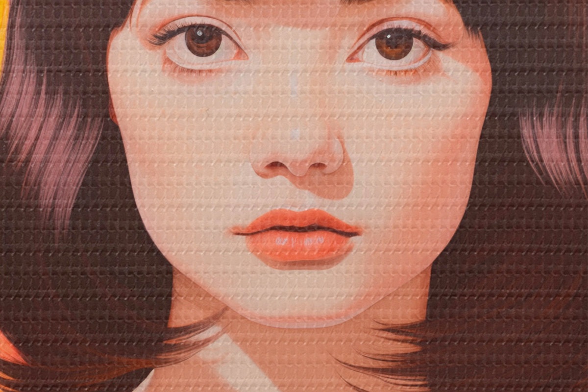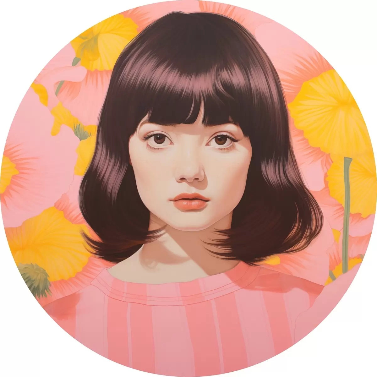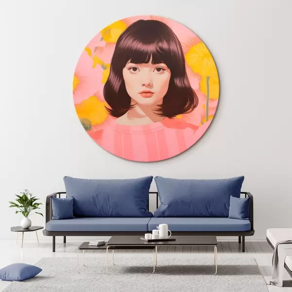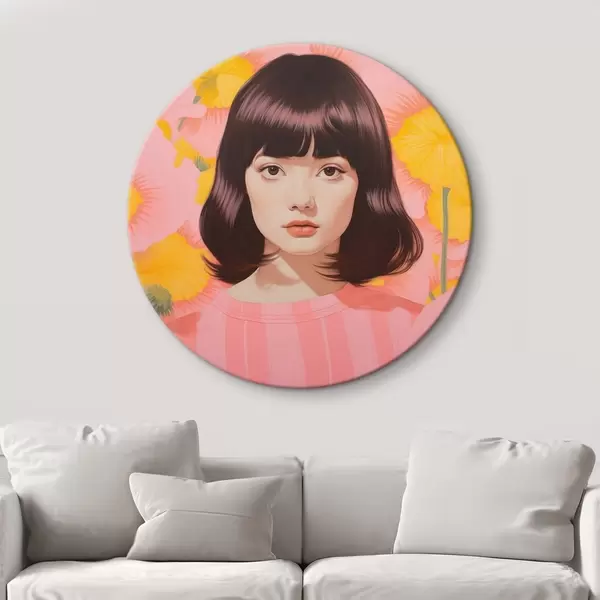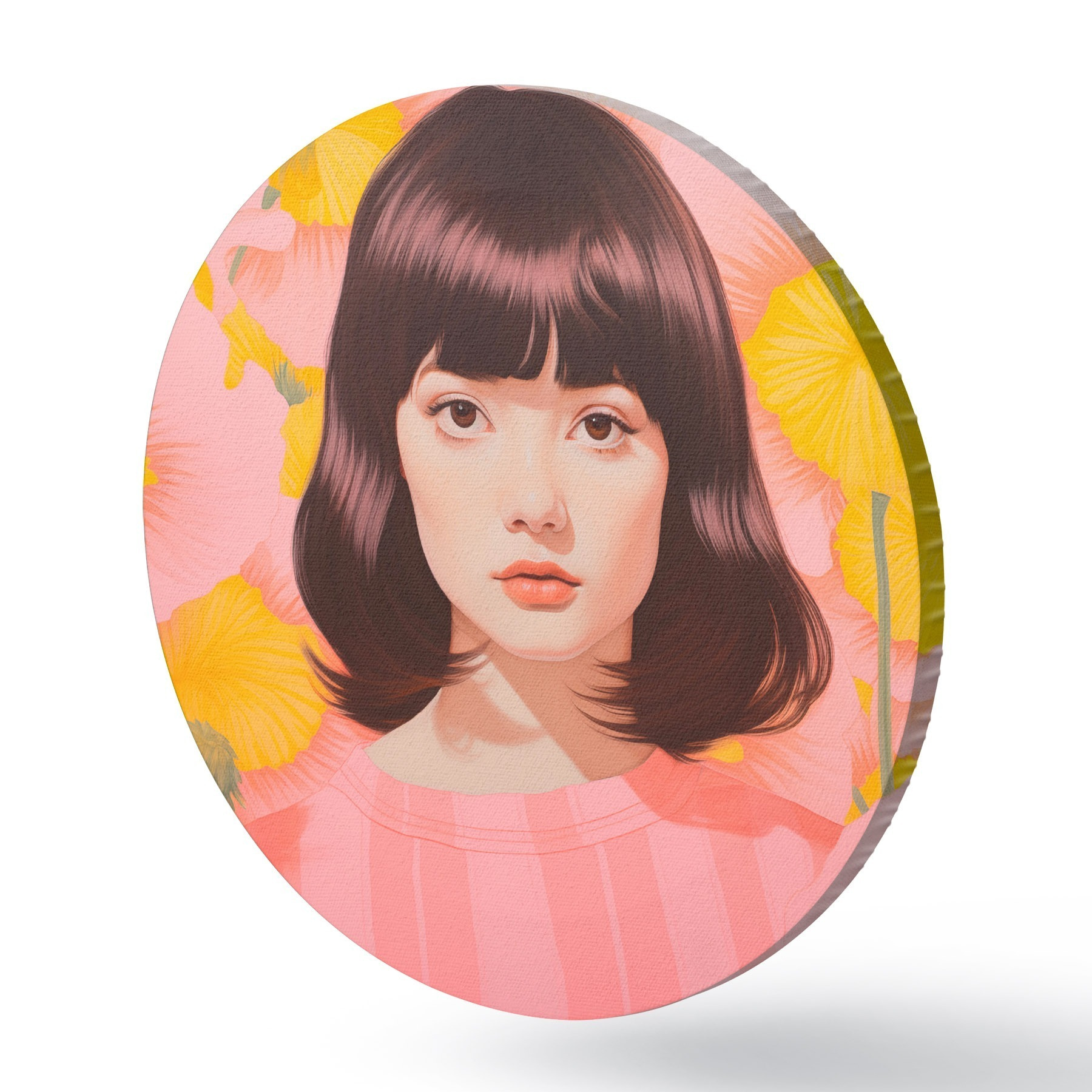 Runde Gemälde Ein dekoratives minimalistisches Porträt von asiatischen Mädchen in einem Feld von gelben und rosa Blumen r44924