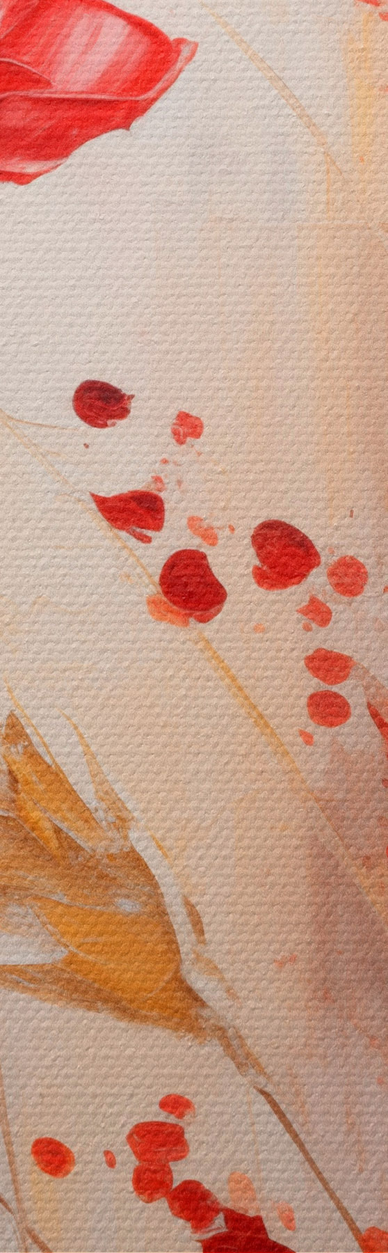 Runde Gemälde Rote Mohnblumen mit gelben Weizenhalmen, vor einem weichen, neutralen Hintergrund mit roten Farbspritzern r44926