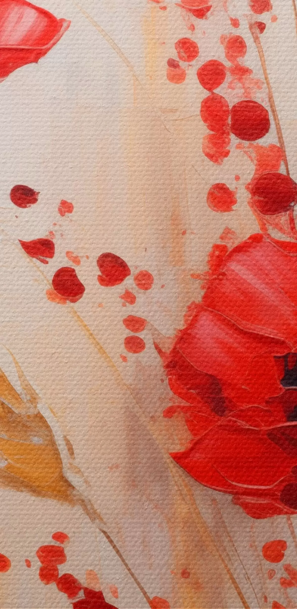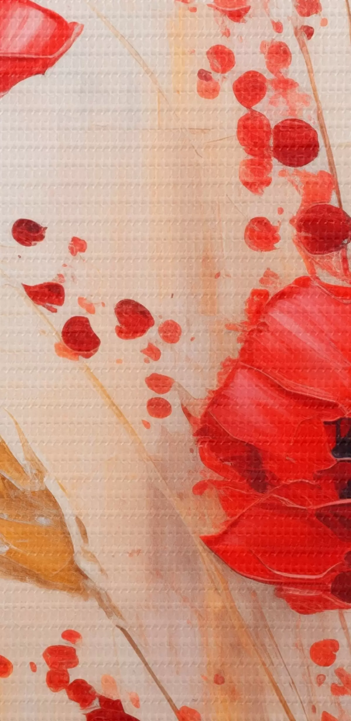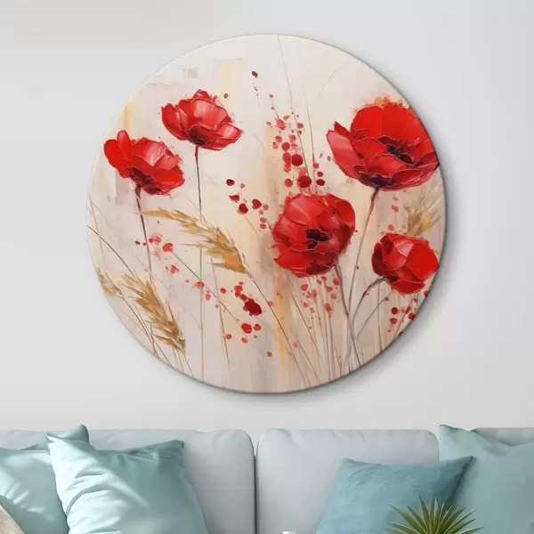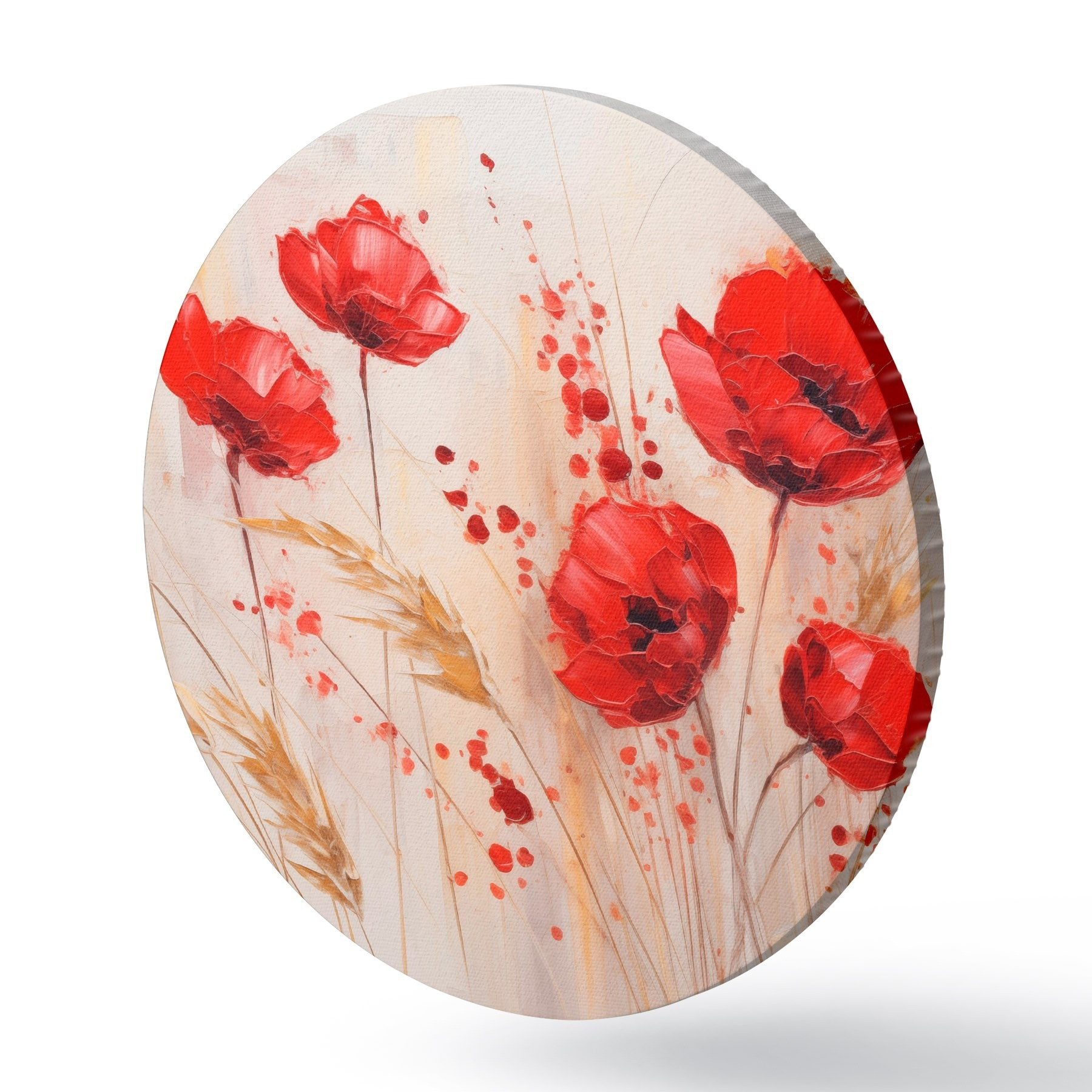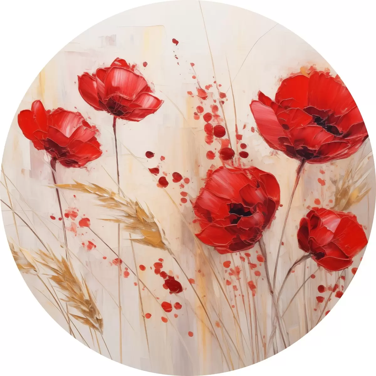 Runde Gemälde Rote Mohnblumen mit gelben Weizenhalmen, vor einem weichen, neutralen Hintergrund mit roten Farbspritzern r44926