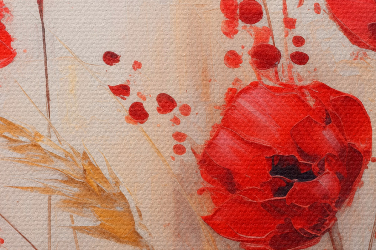 Bild Rote Mohnblumen mit gelben Weizenhalmen, vor einem weichen, neutralen Hintergrund mit roten Farbspritzern Nr r44926