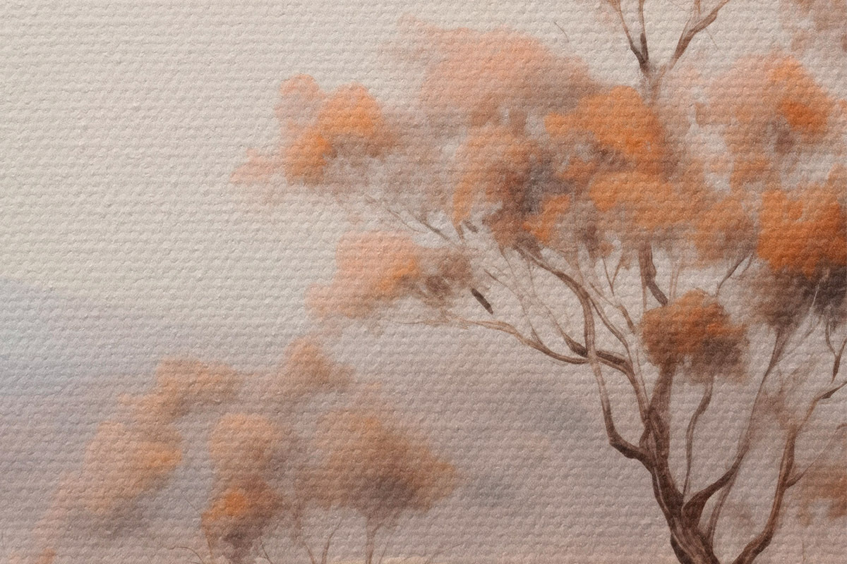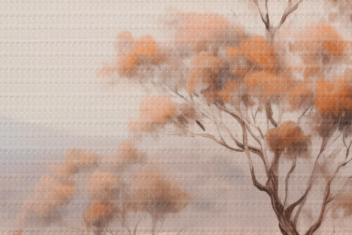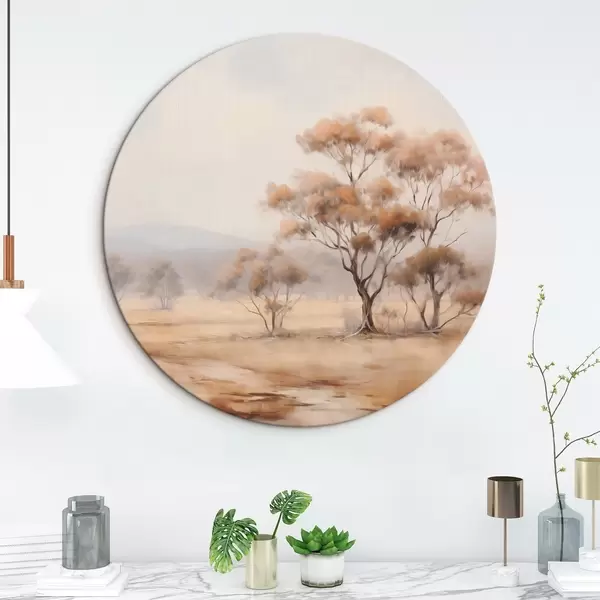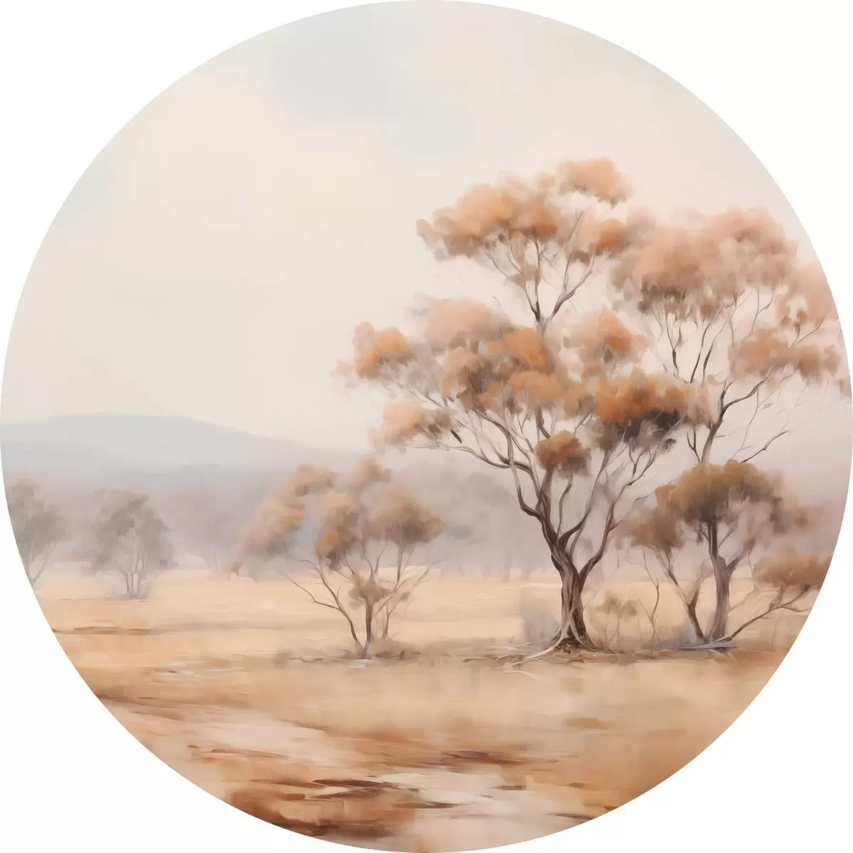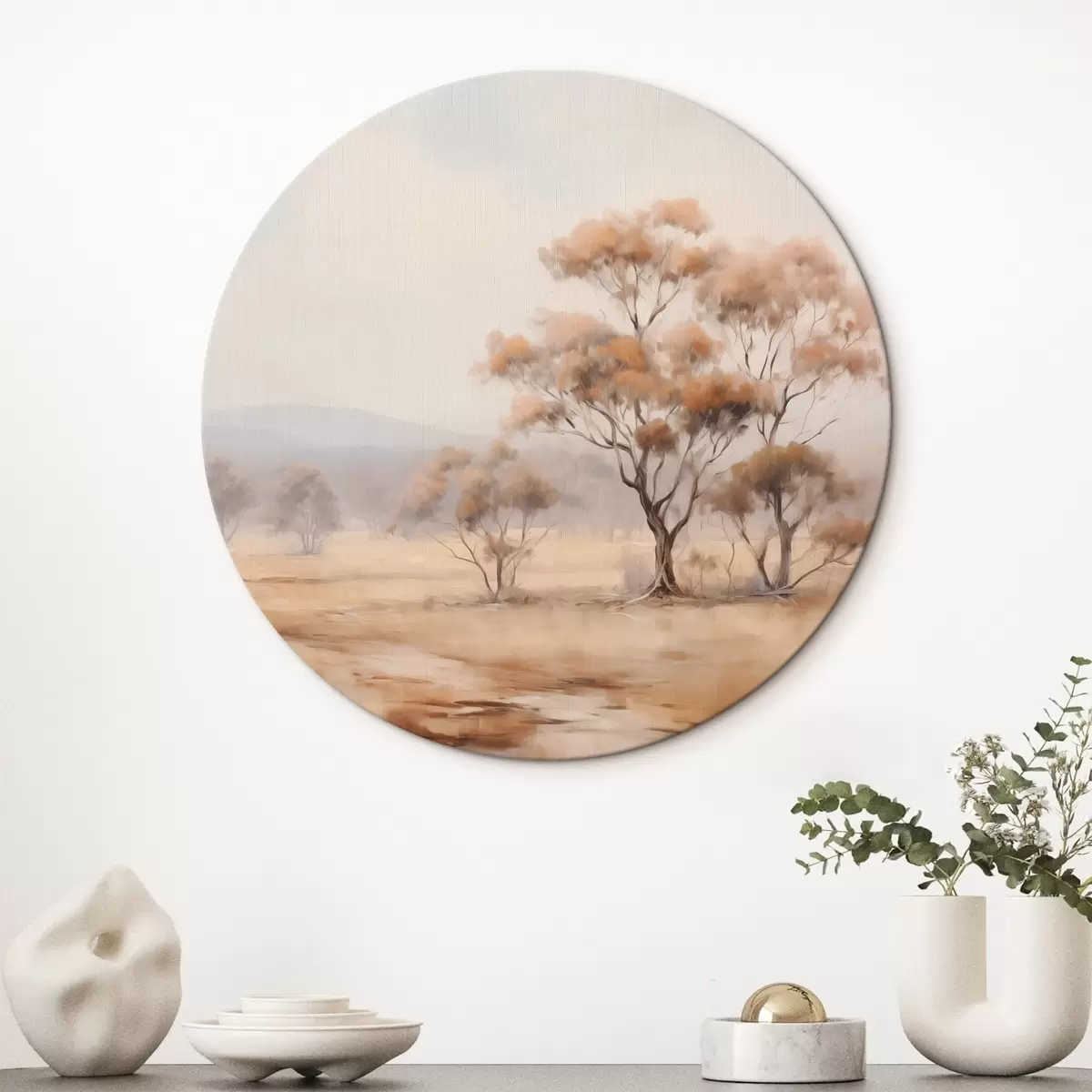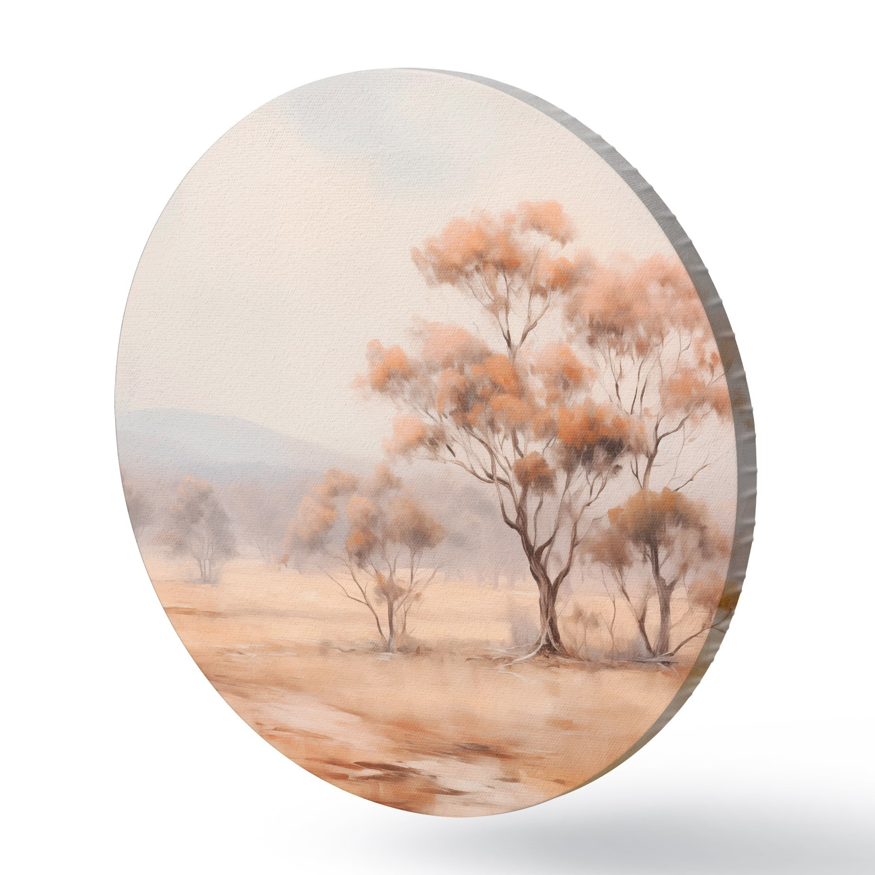 Runde Gemälde Ein Feld mit orangefarbenem Gras und einige Bäume mit orangefarbenen Blättern, Berge im Hintergrund mit einem bewölkten Himmel r44927