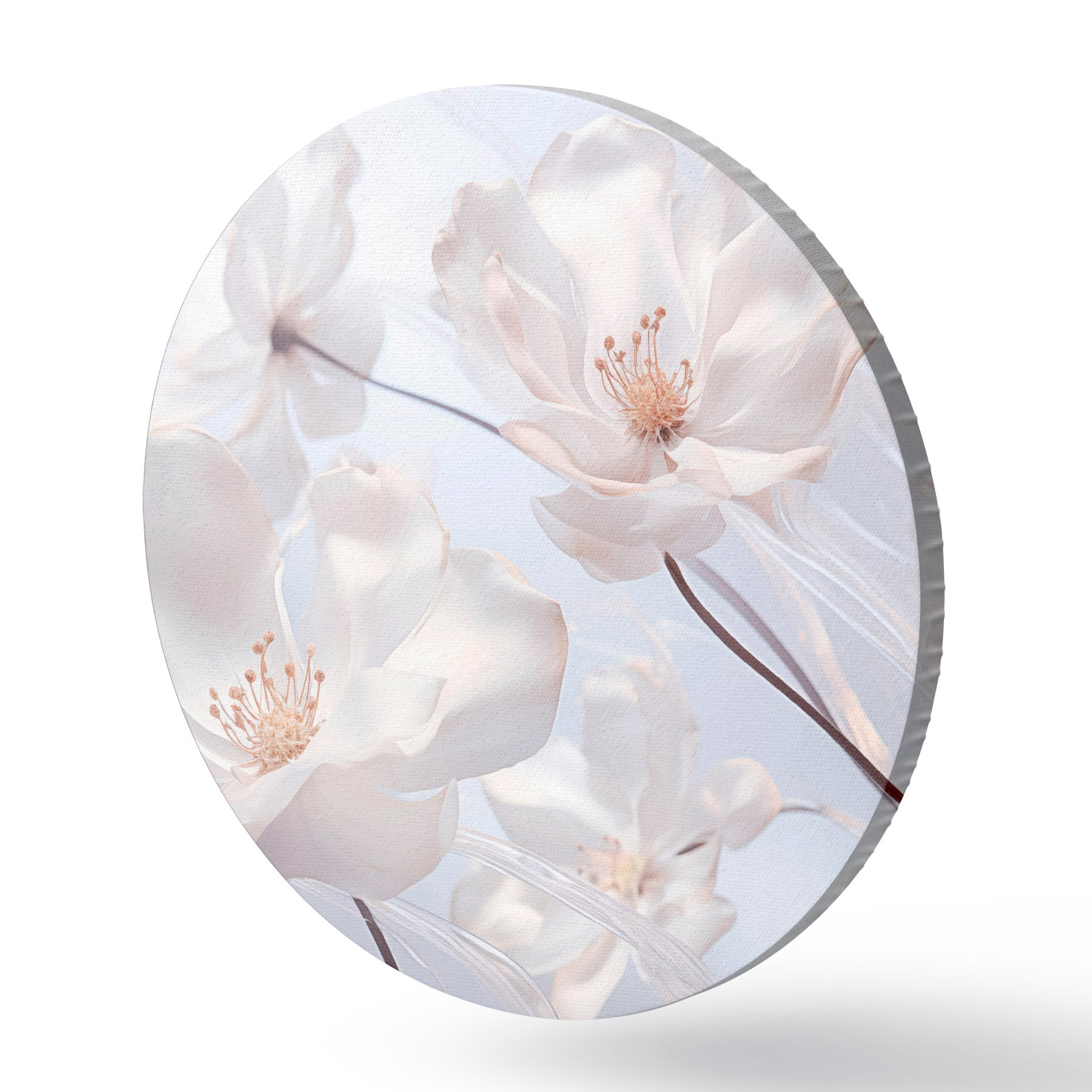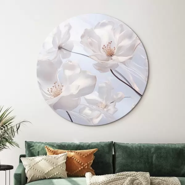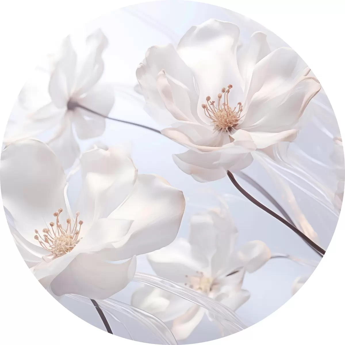 Runde Gemälde Weiße Blumen mit durchscheinenden Blütenblättern, weicher hellblauer Hintergrund, elegant, romantisch, zart, verträumt r44931