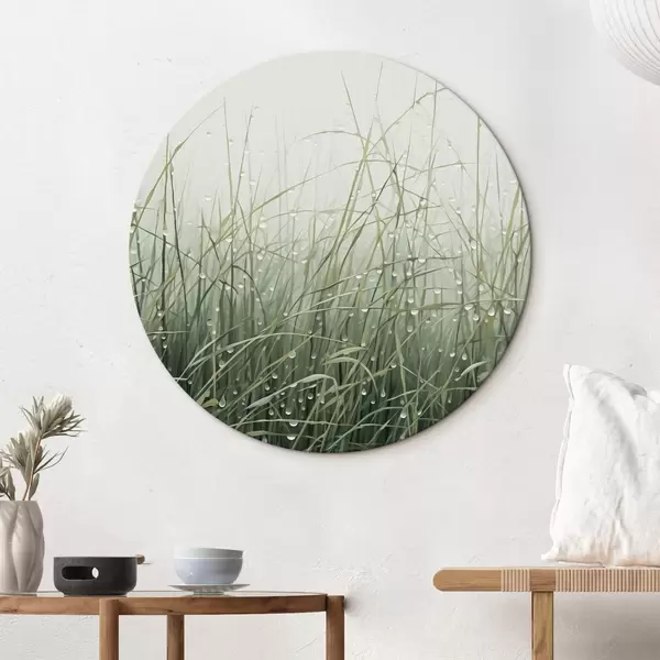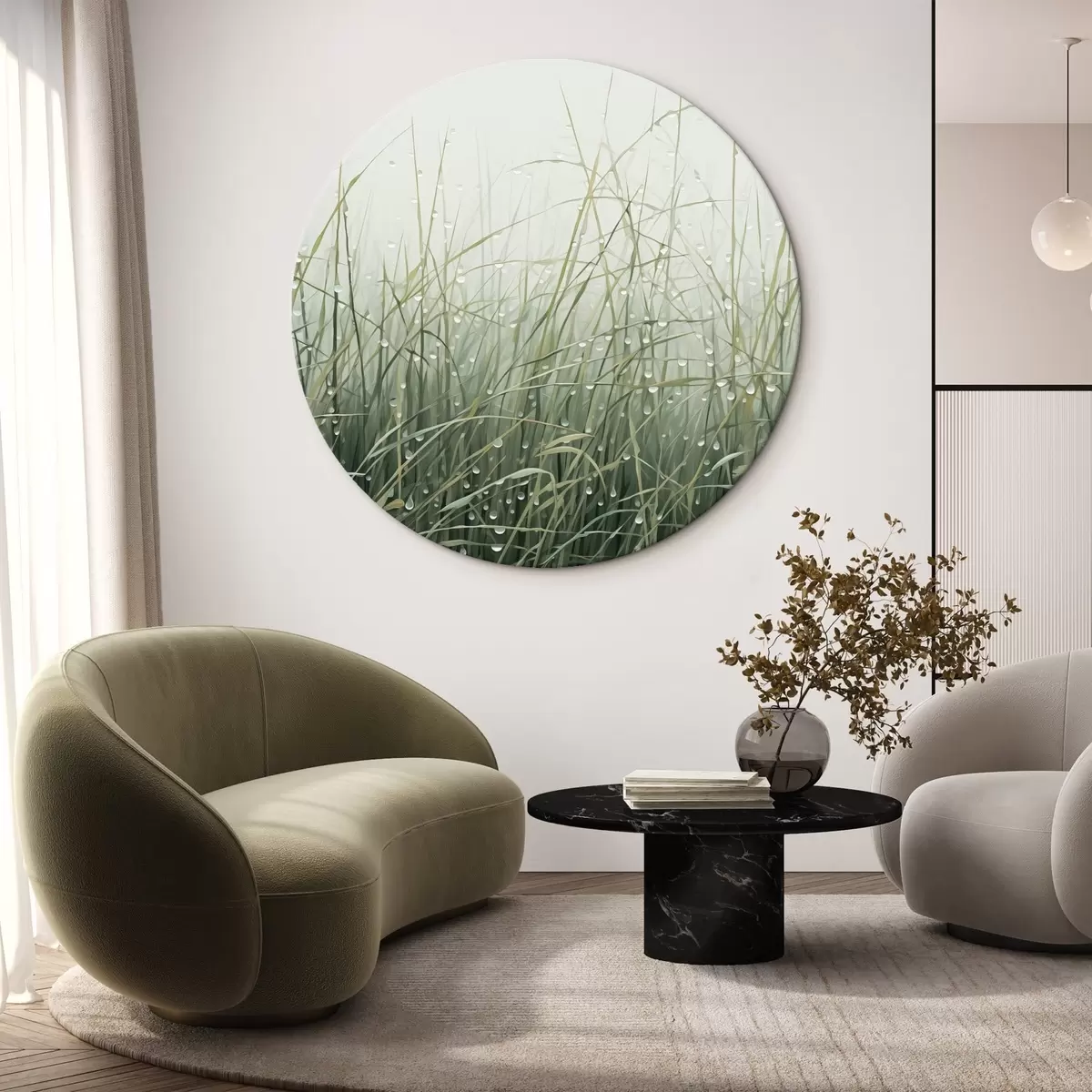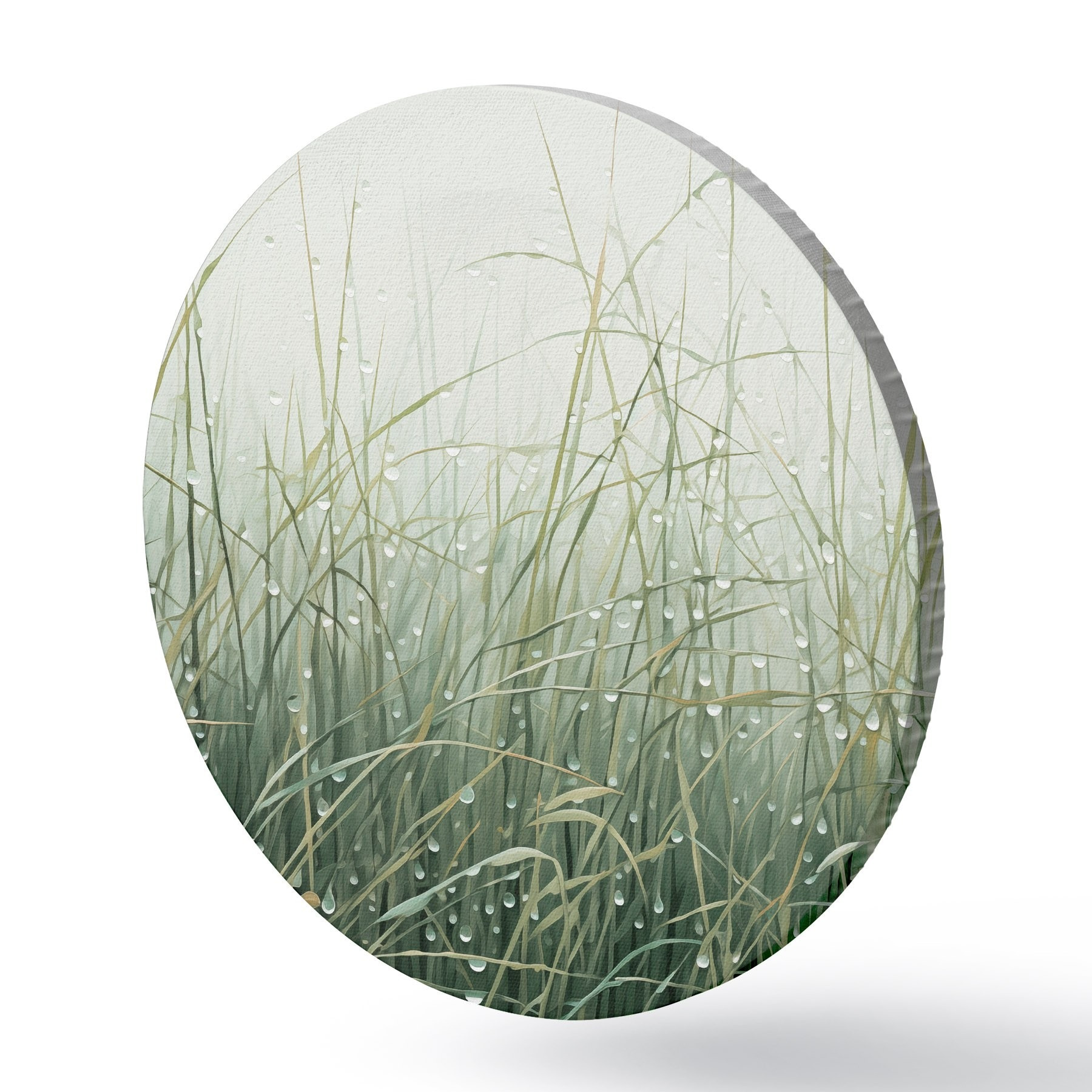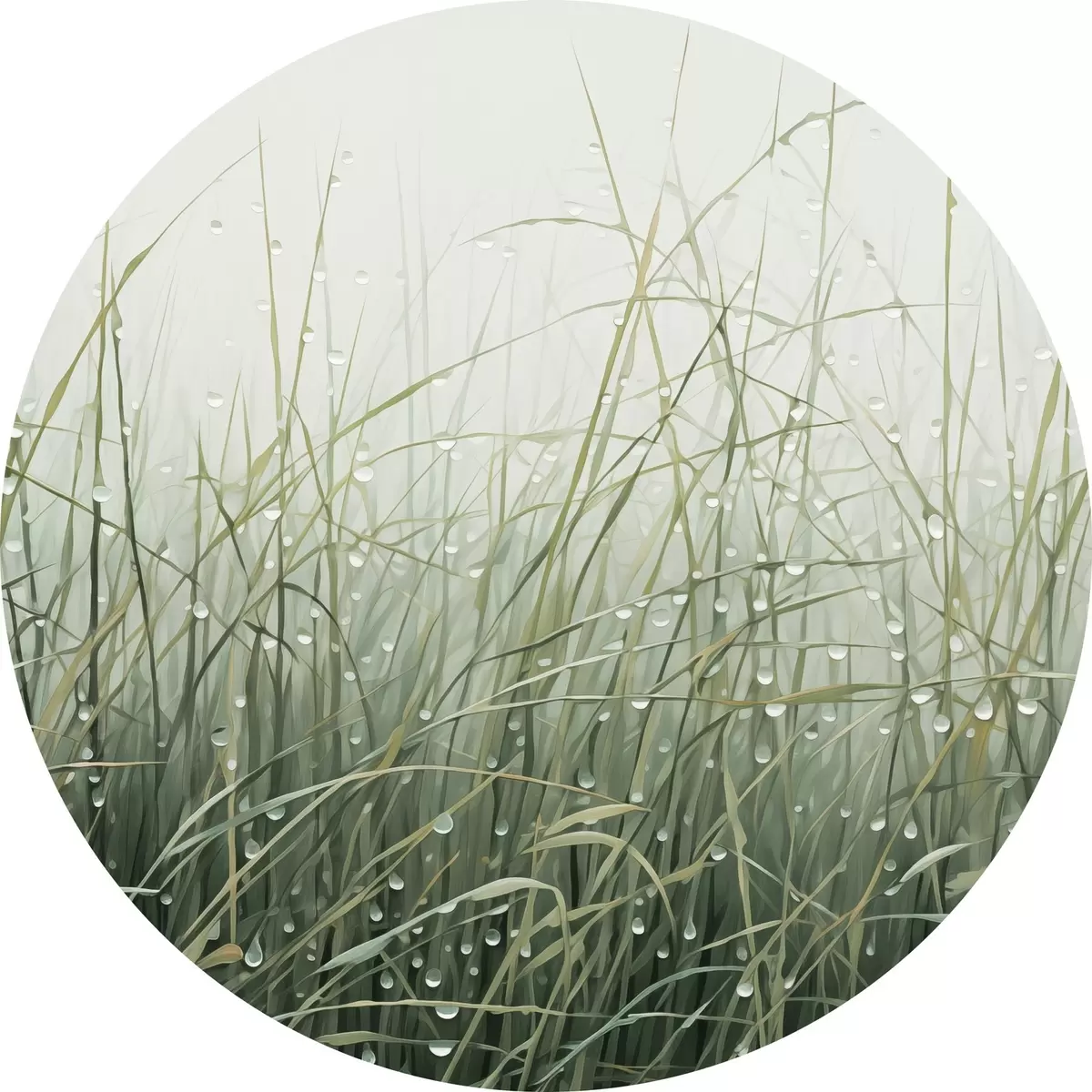Runde Gemälde Gras mit Wassertropfen, Grüntöne, weiches Licht, nebliger Hintergrund, abstrakter minimalistischer strukturierter Stil r44932