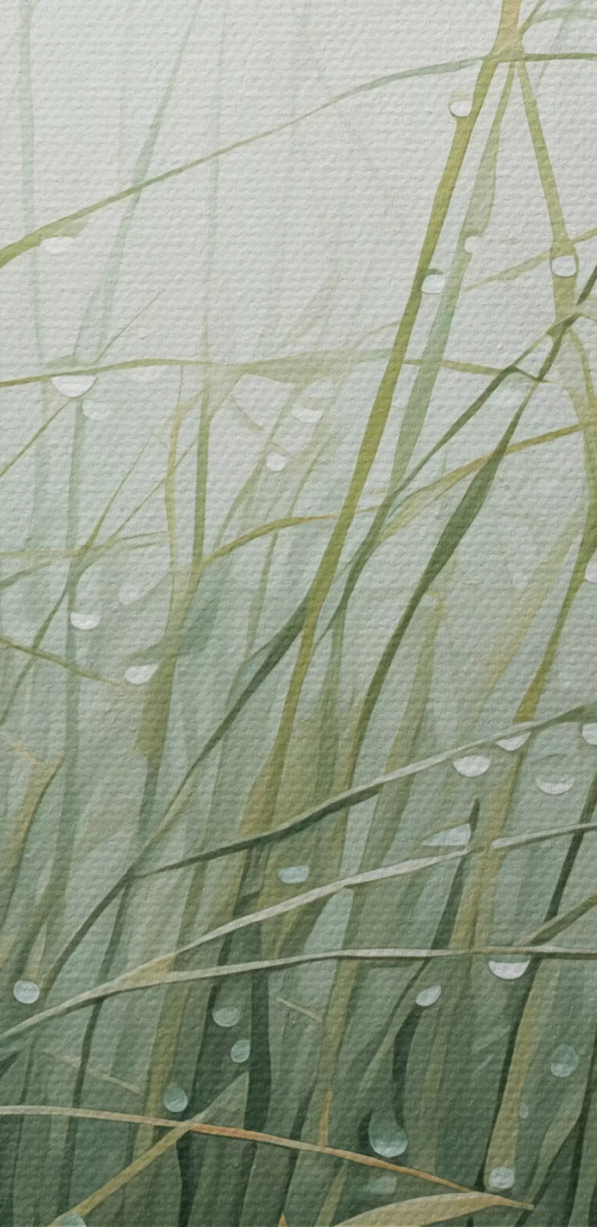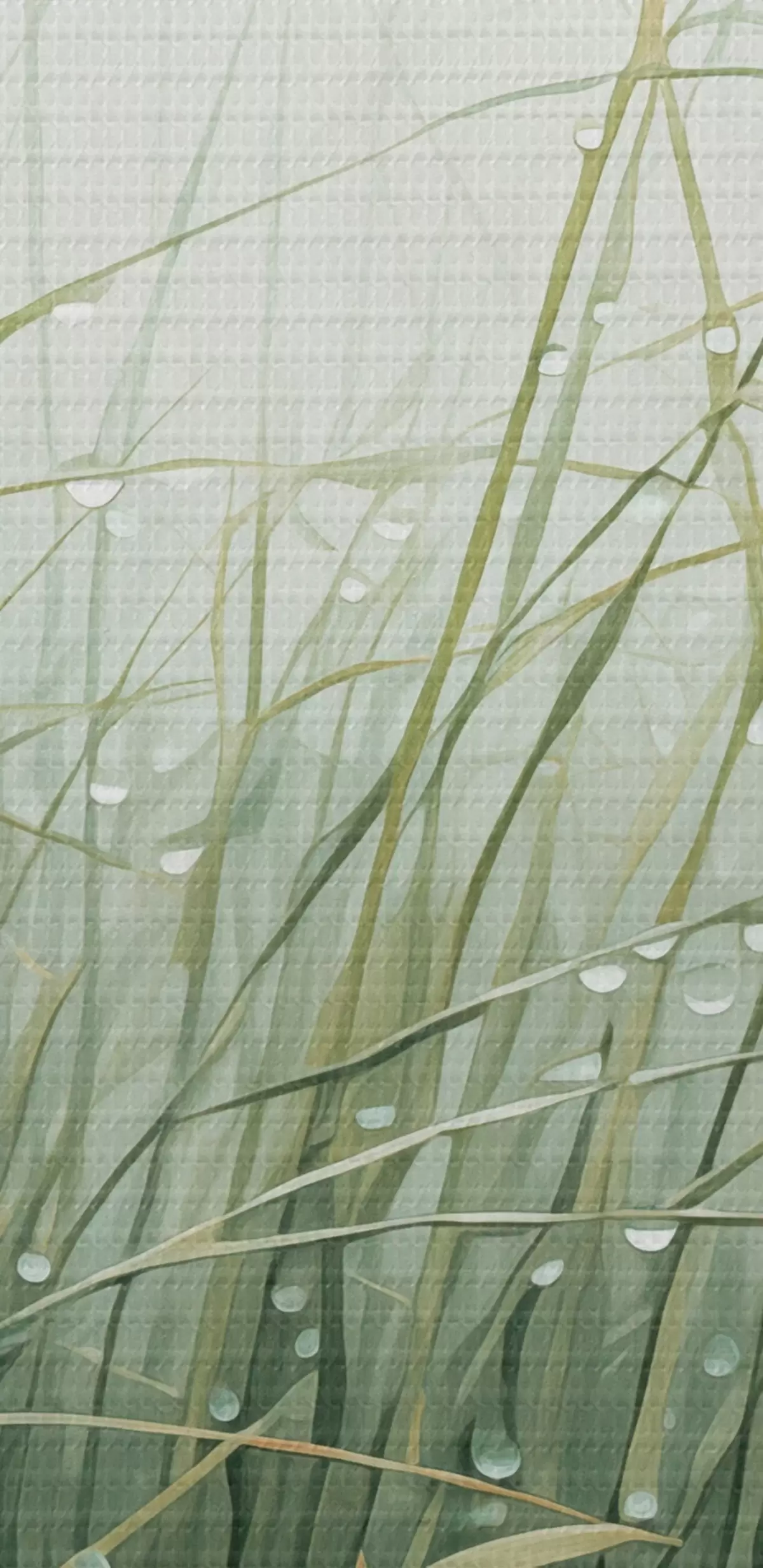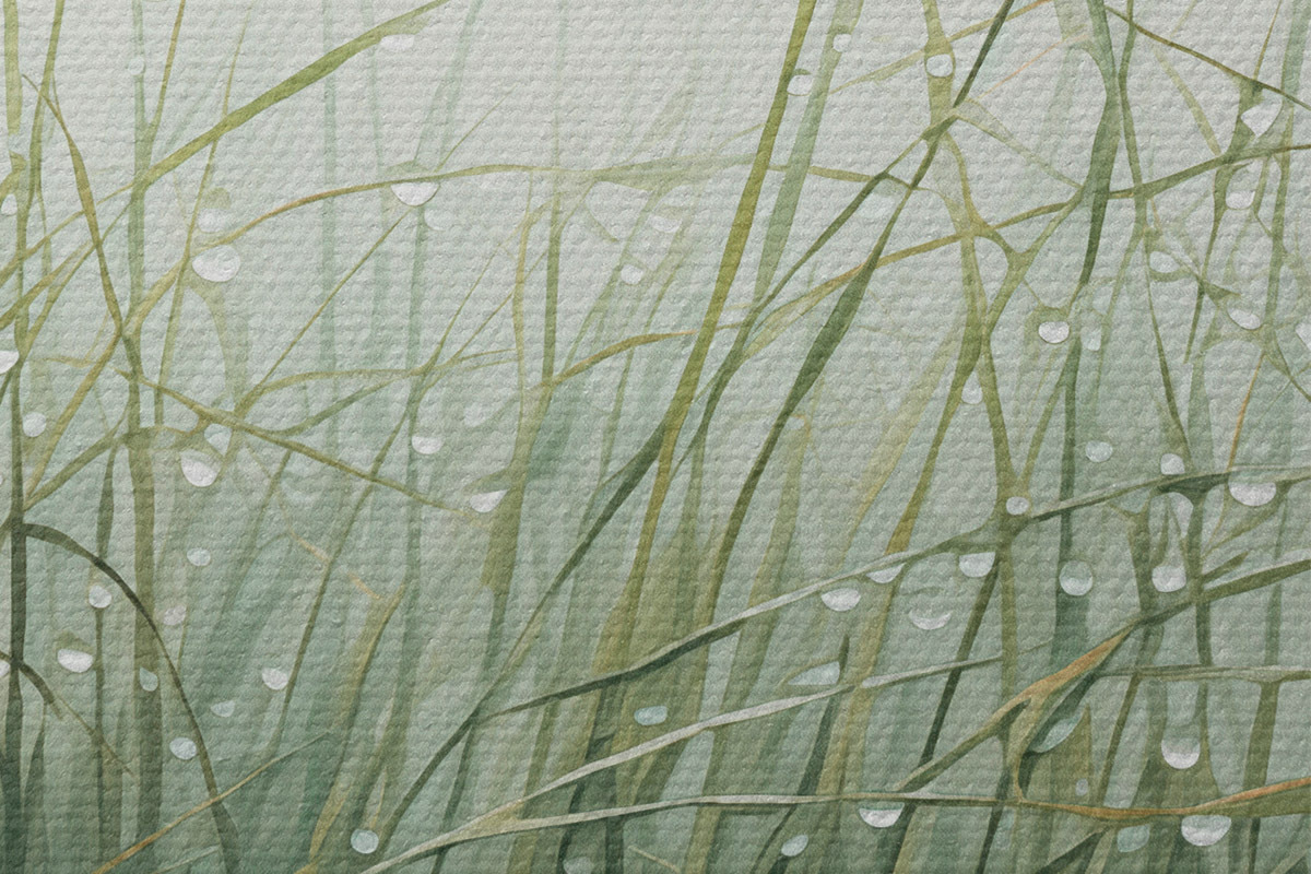 Bild Gras mit Wassertropfen, Grüntöne, weiches Licht, nebliger Hintergrund, abstrakter minimalistischer strukturierter Stil Nr r44932