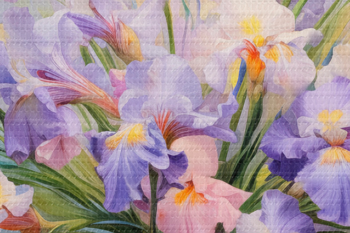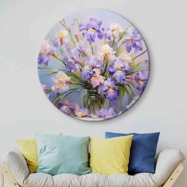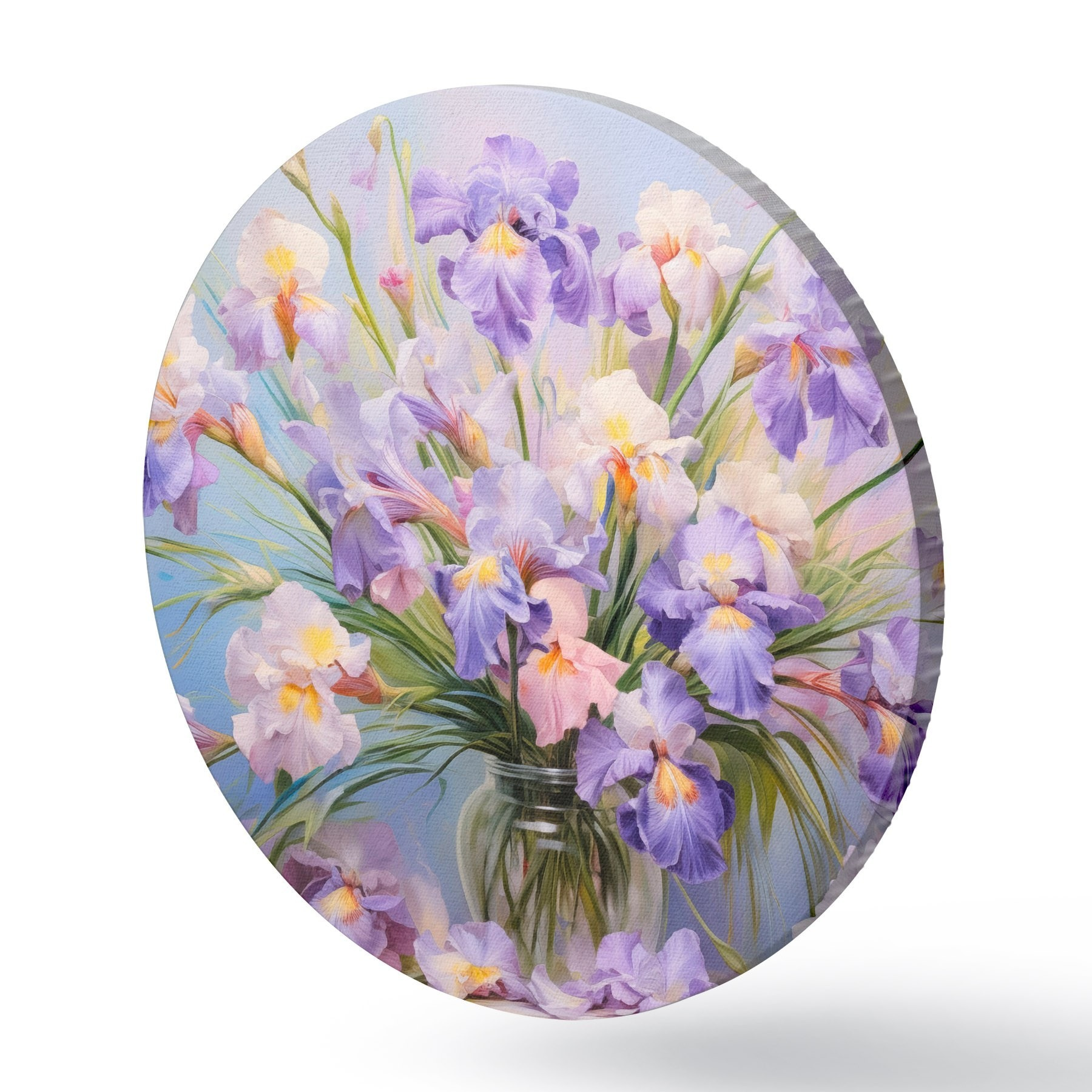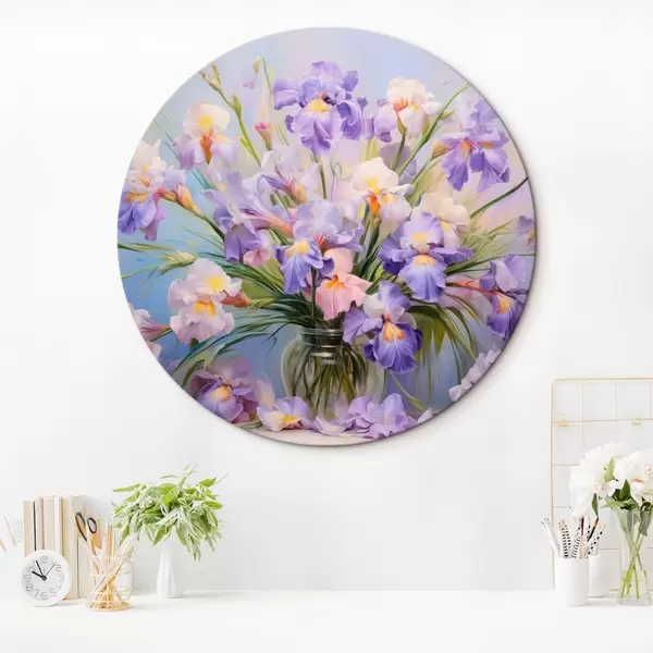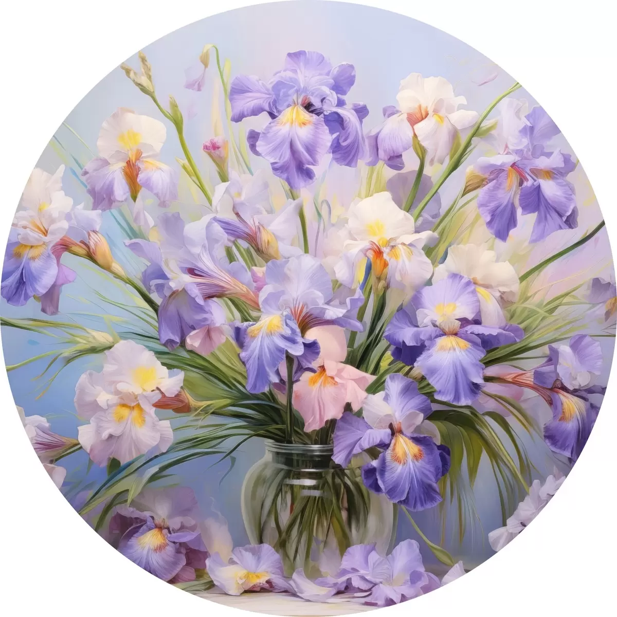 Runde Gemälde Eine Vase mit vielen pastellfarbenen Schwertlilien, einige Blütenblätter auf dem Tisch verstreut, weicher pastellfarbener Hintergrund mit blauen und rosa Tönen r44933