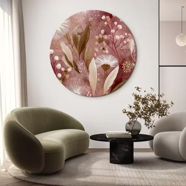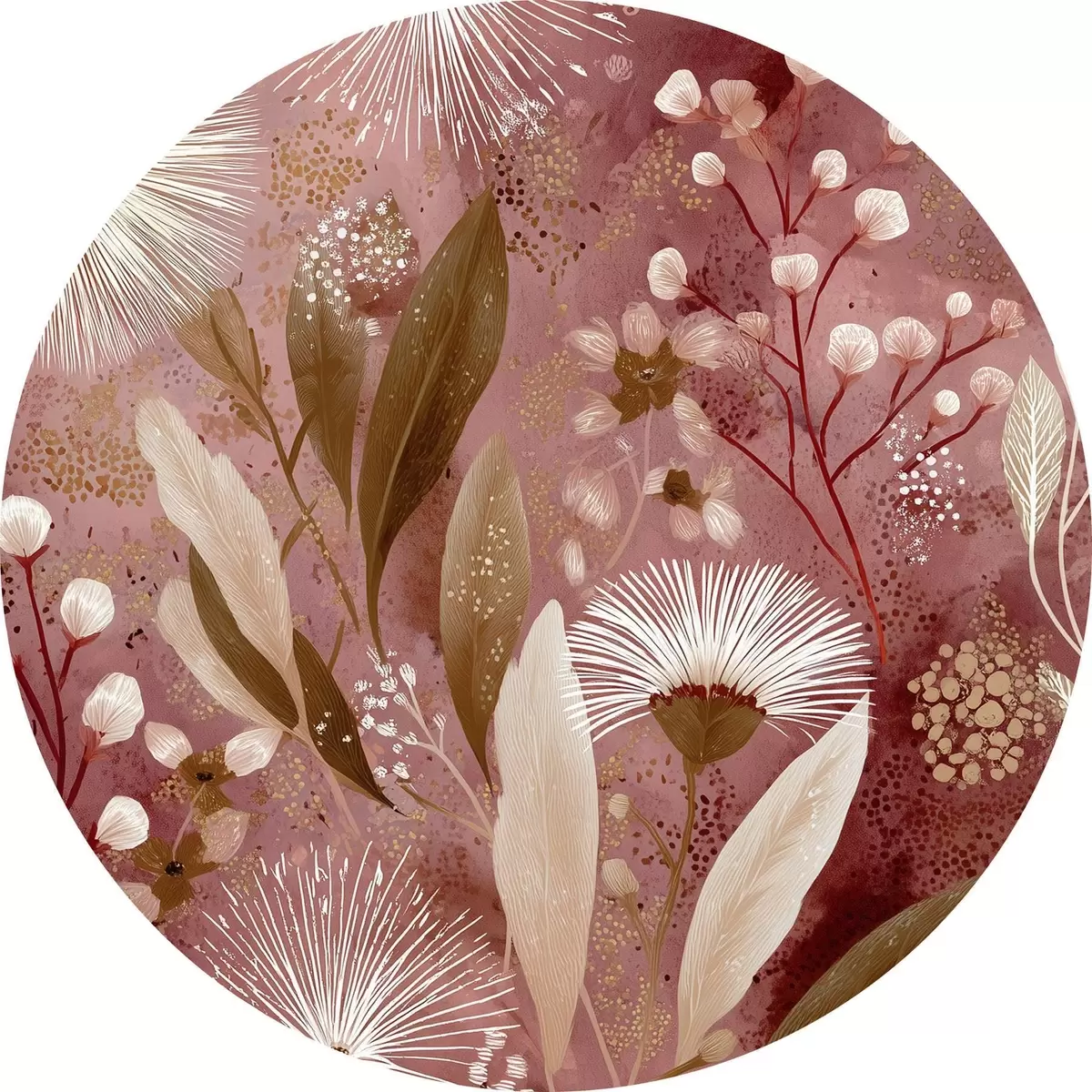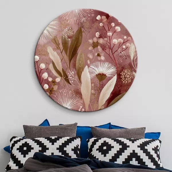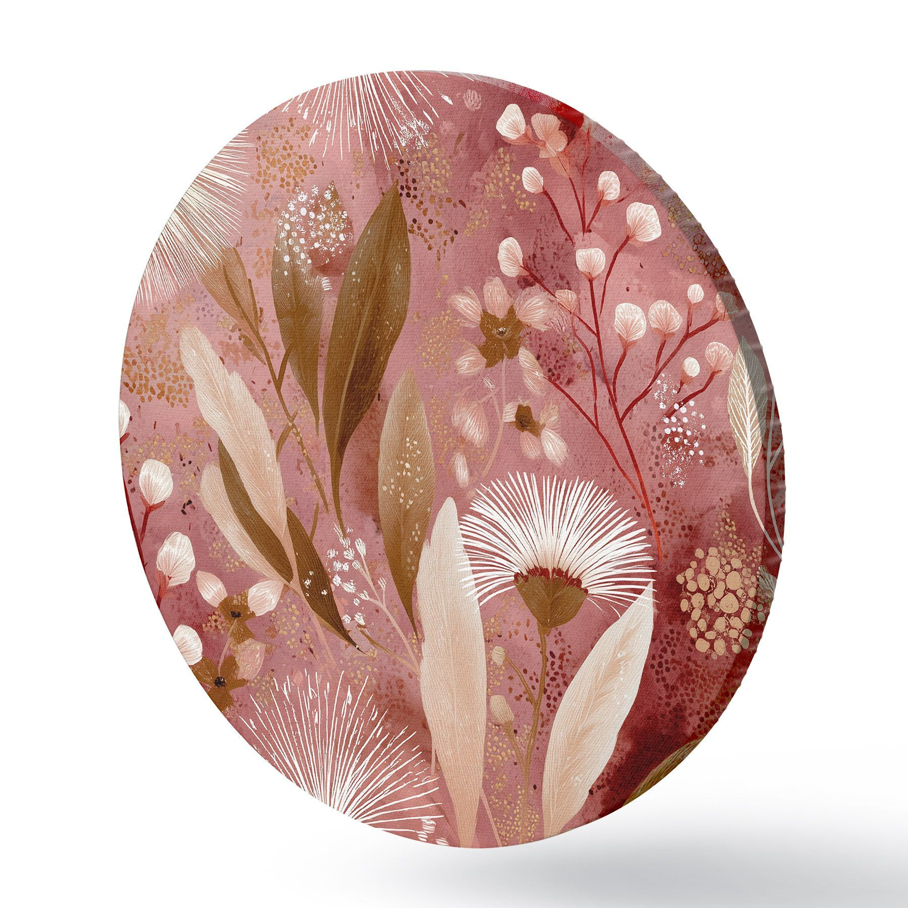 Runde Gemälde Boho-Stil weiße Blumen auf dem roten Hintergrund, detaillierte Zeichnung r44979