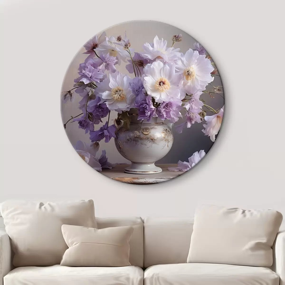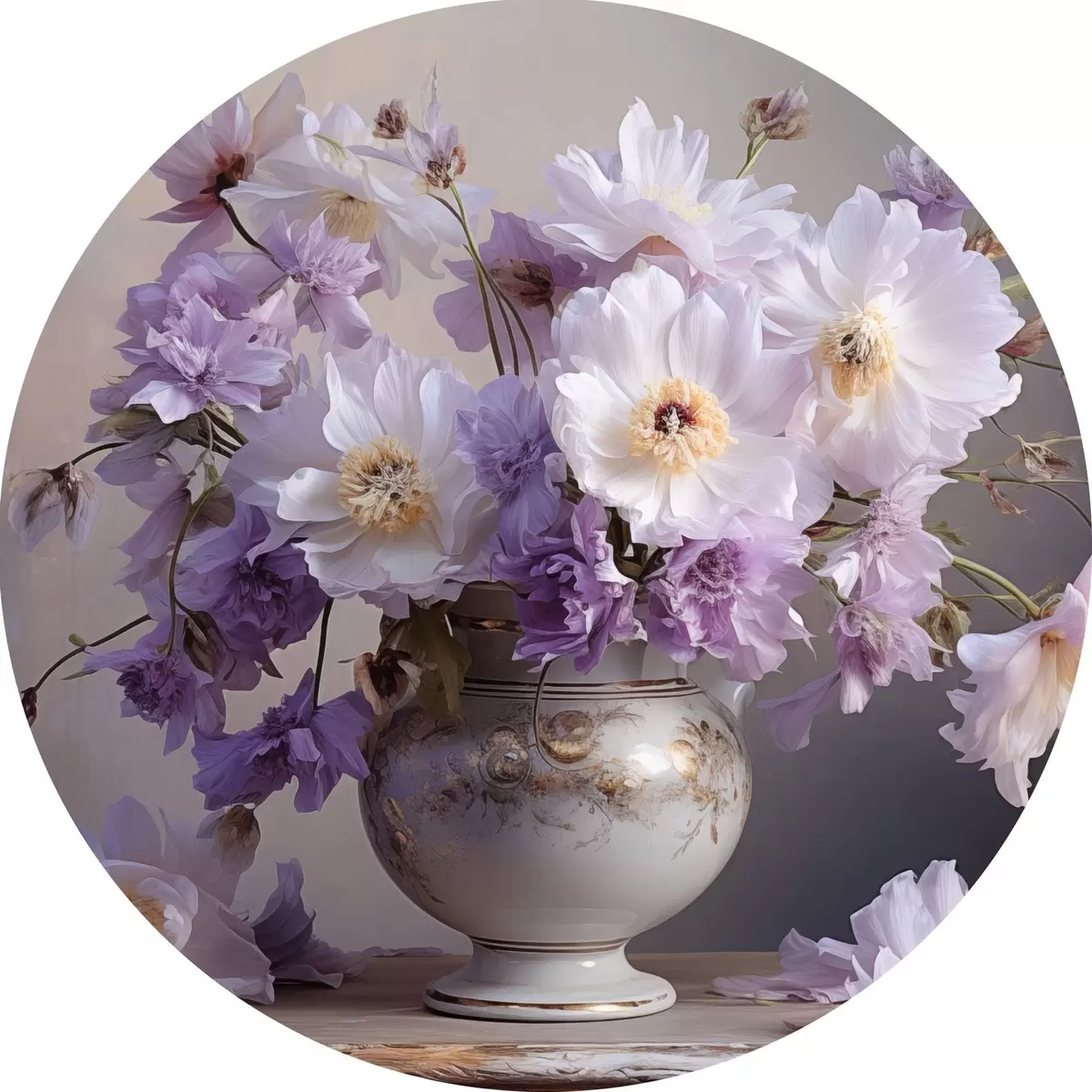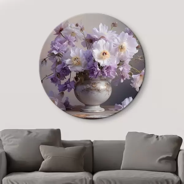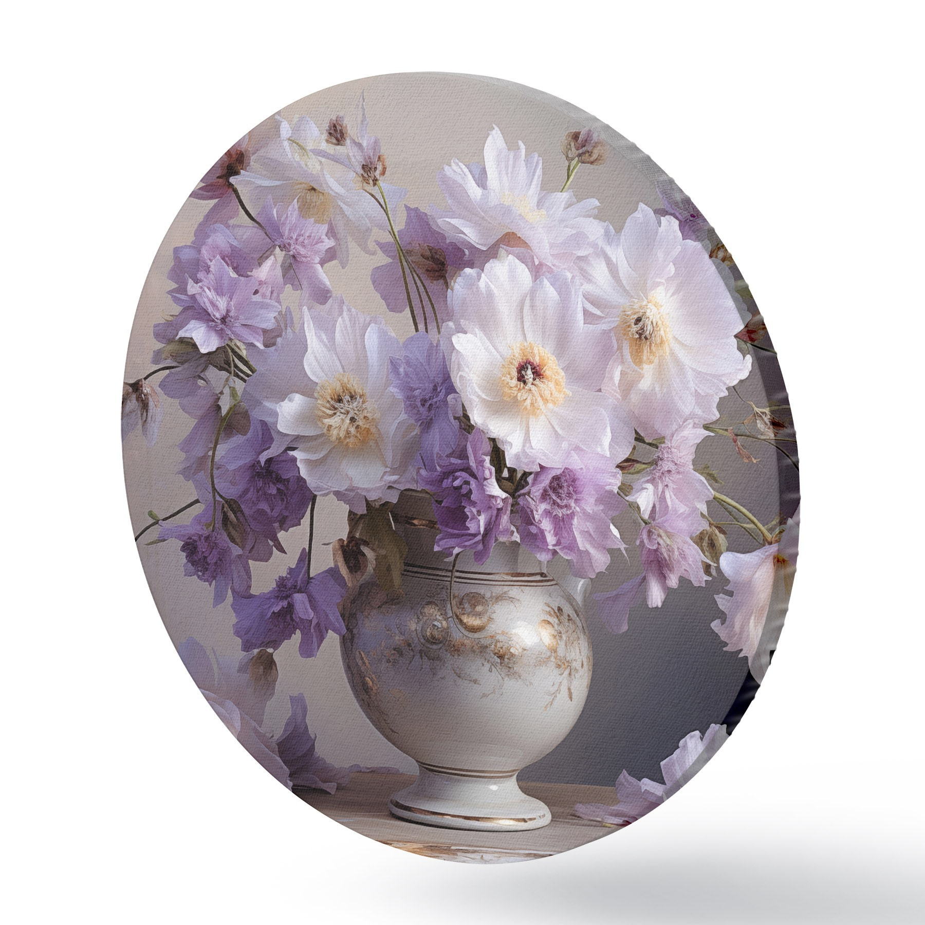 Runde Gemälde Blumenstillleben: weiße und violette Blumen im künstlerischen Stil r45058